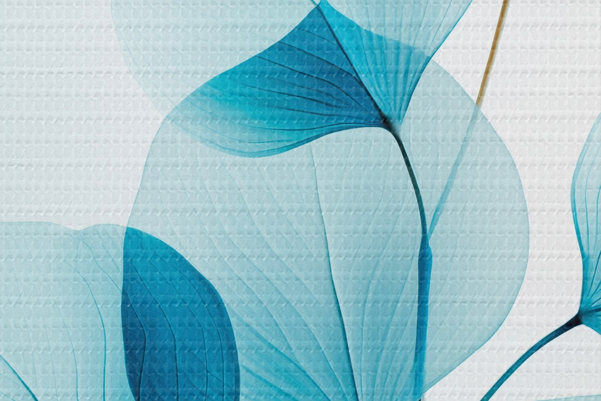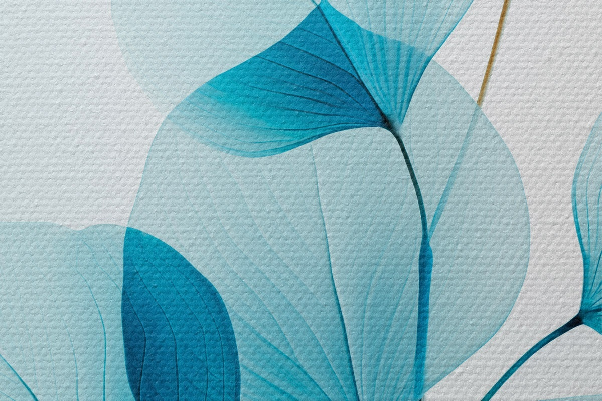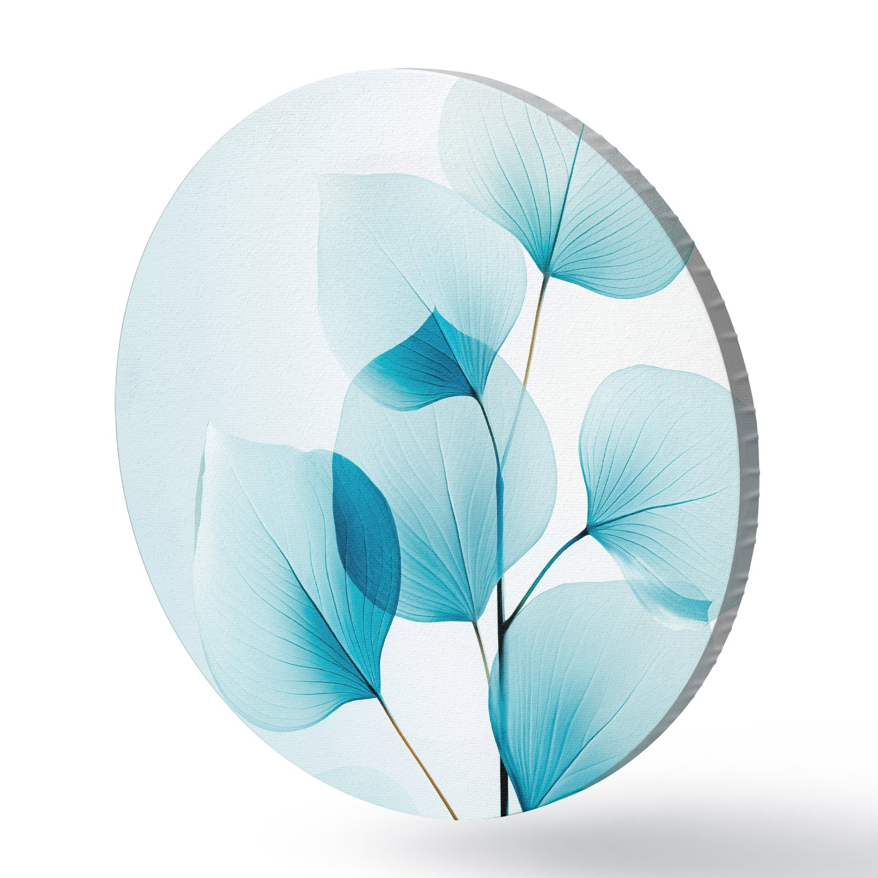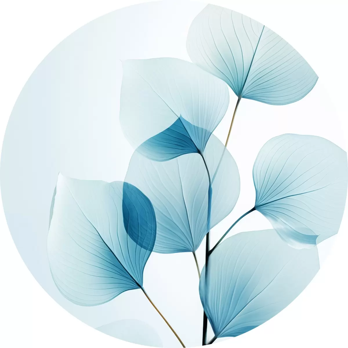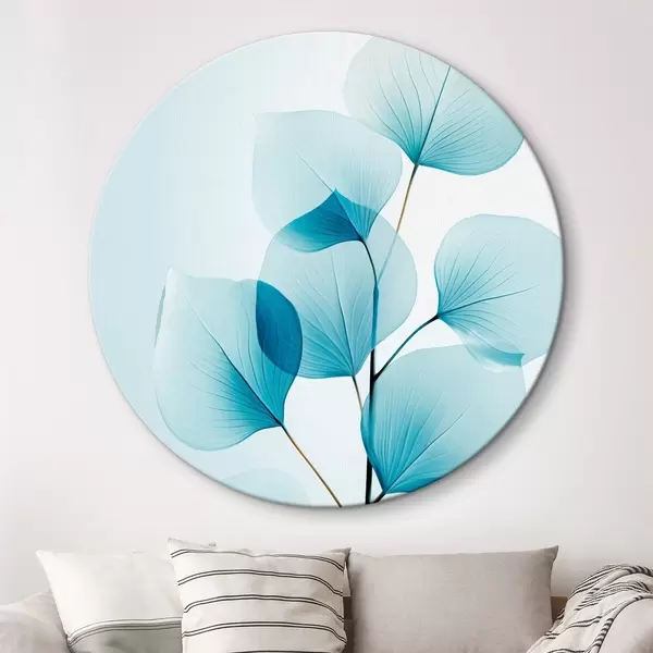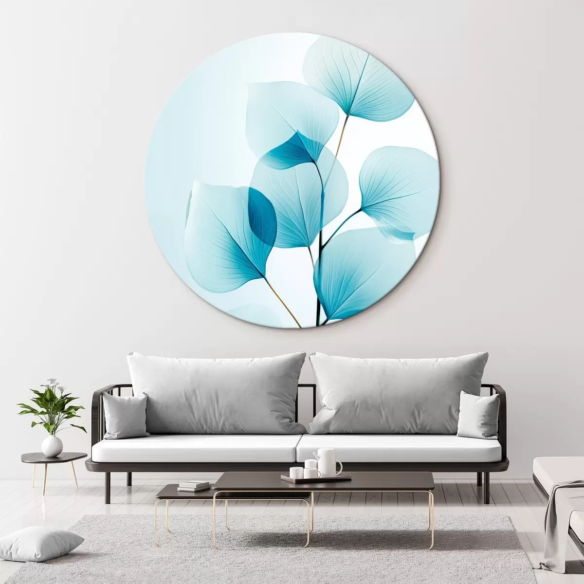 Apaļas gleznas Zariņš ar caurspīdīgām zilām lapām, redzamas maigas dzīslas, viegla un mierīga kompozīcija, minimālisma estētika r45175