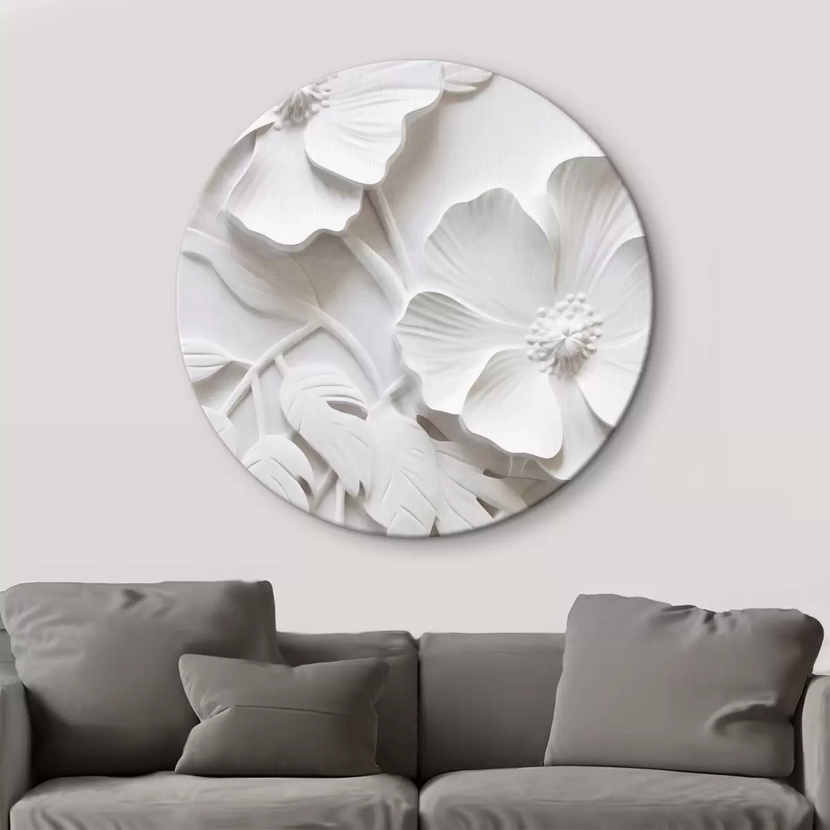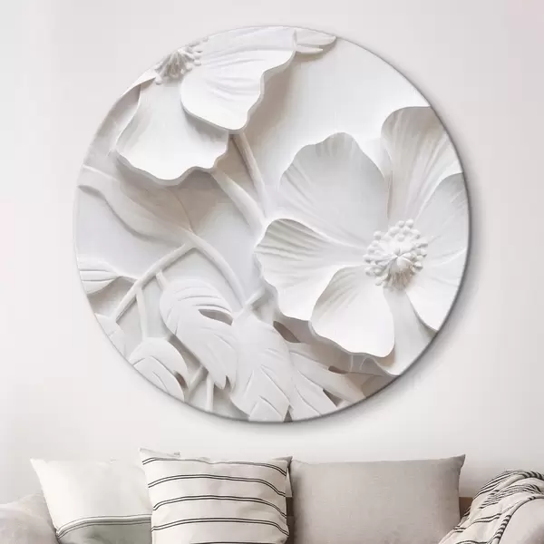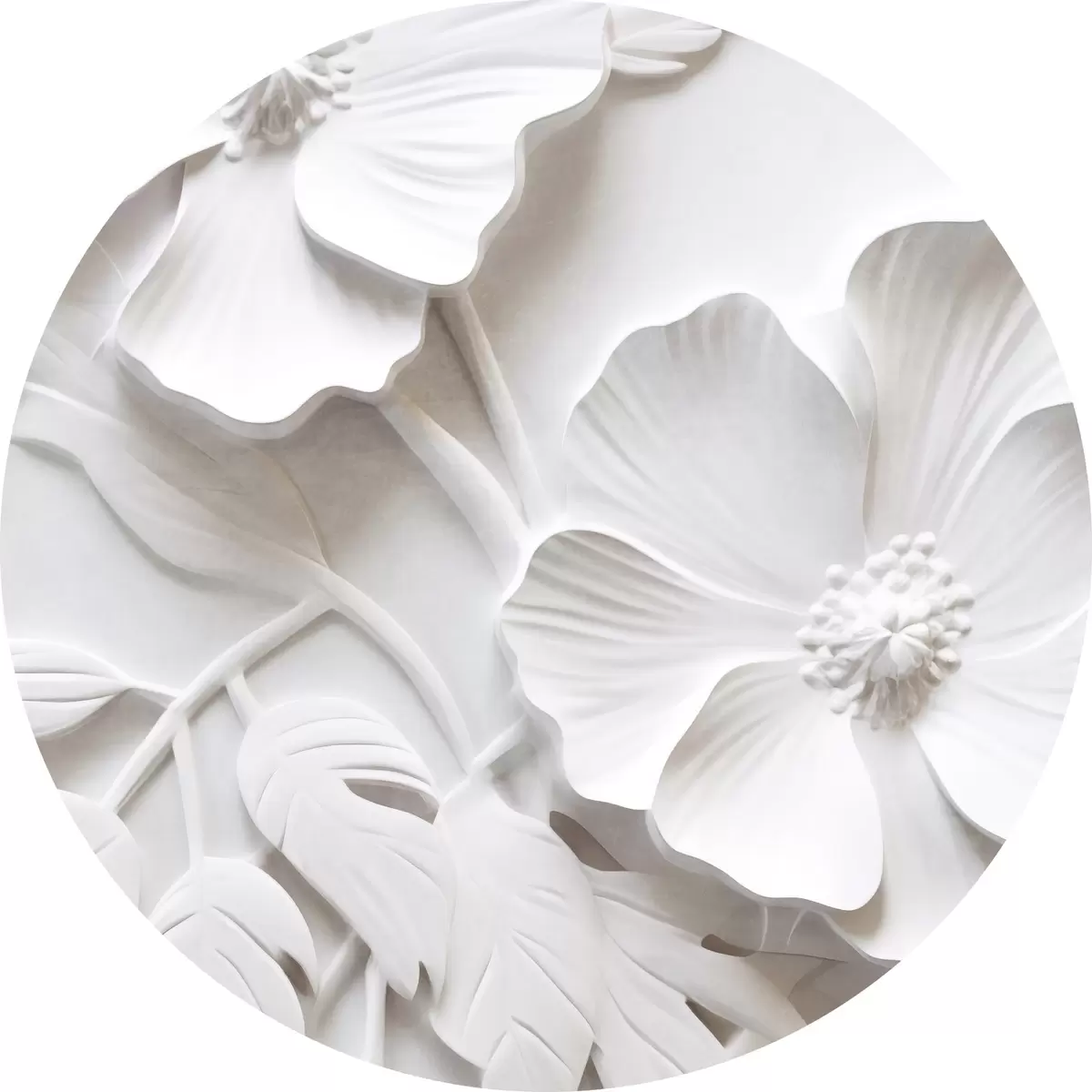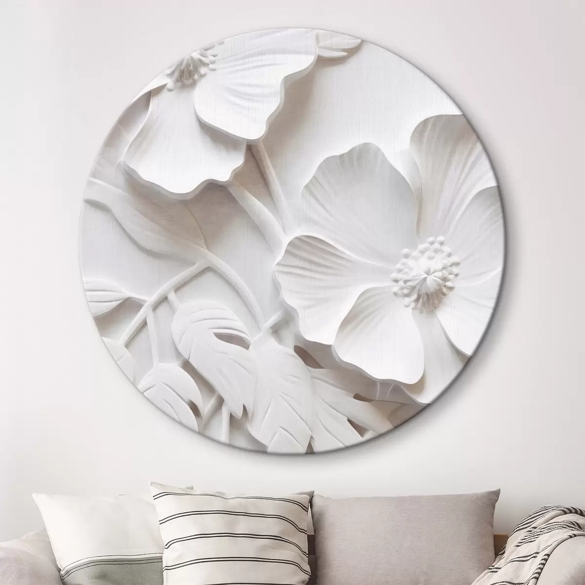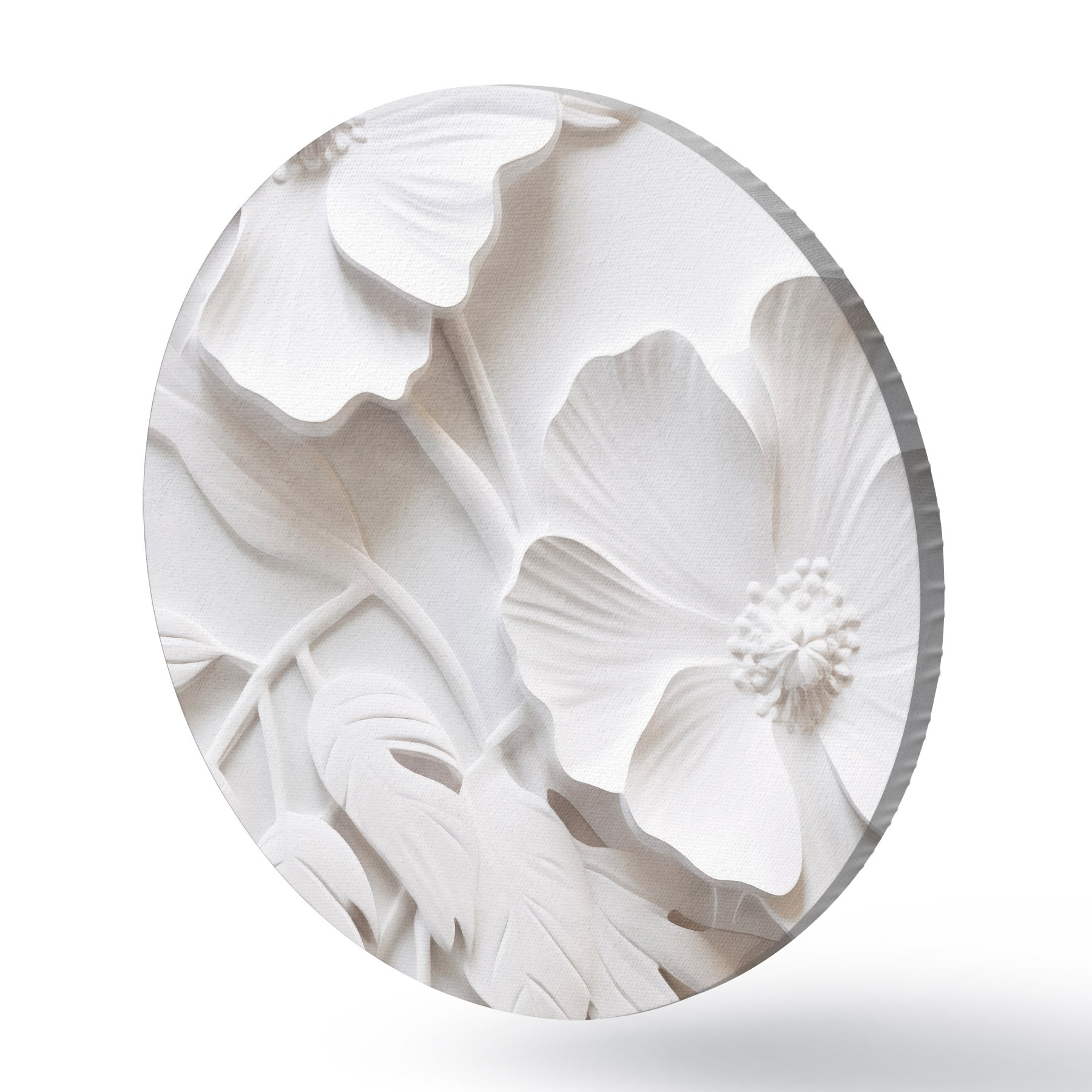 Apaļas gleznas Dekoratīvi minimālisma stilā veidoti balti ziedi ar lapām, reljefa imitācija, balts fons r45179