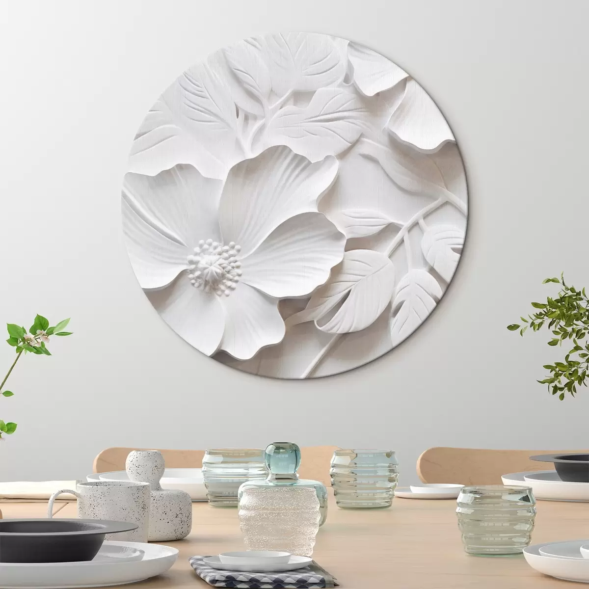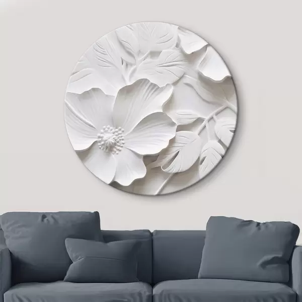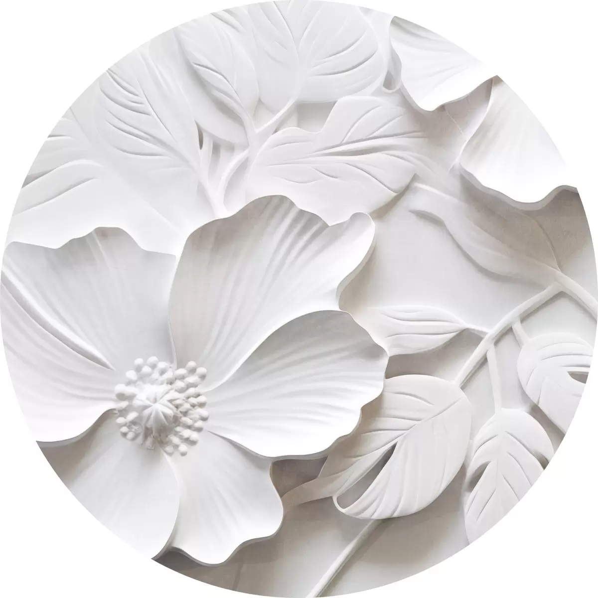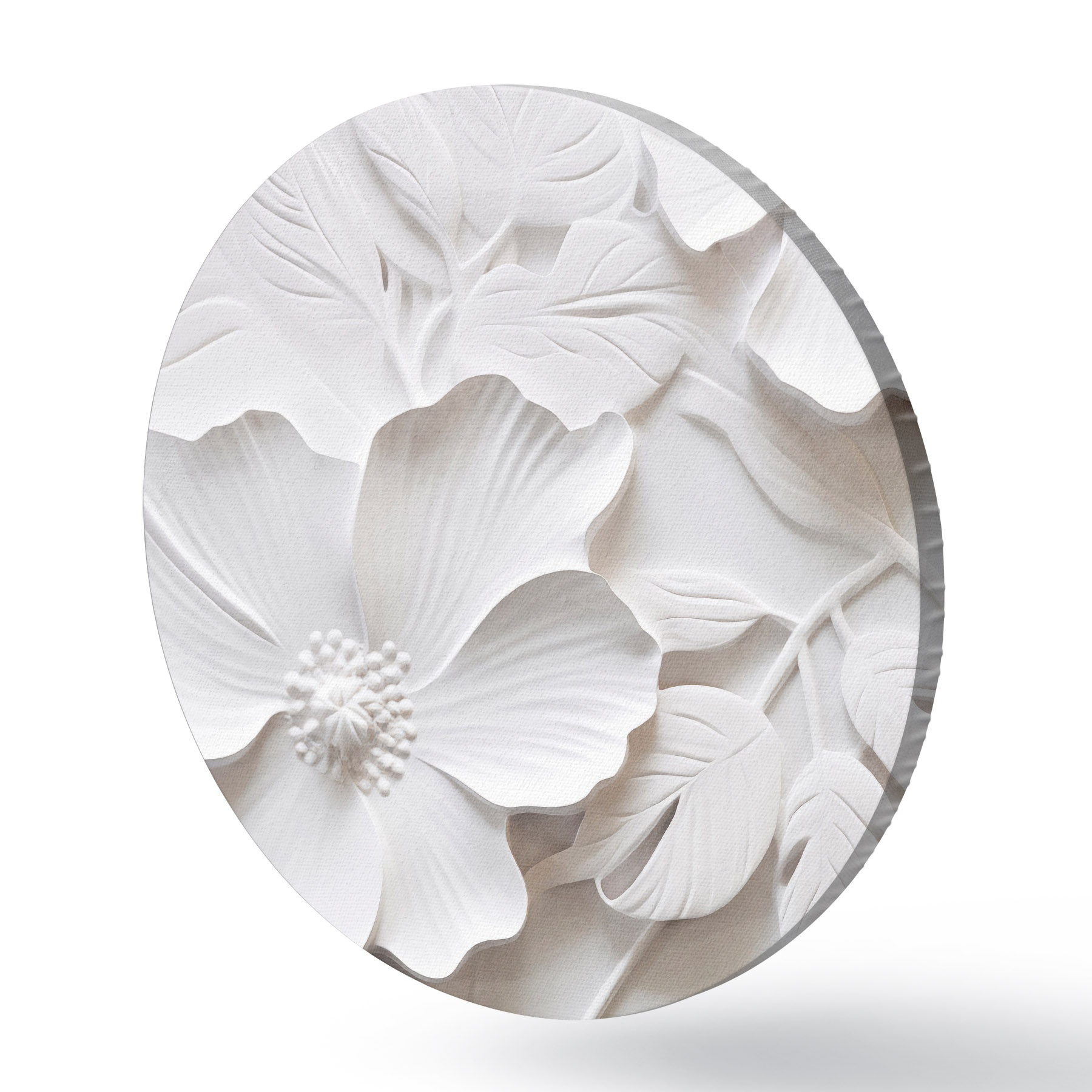 Apaļas gleznas Dekoratīvi minimālisma stilā veidoti balti ziedi ar lapām, reljefa imitācija, balts fons r45180