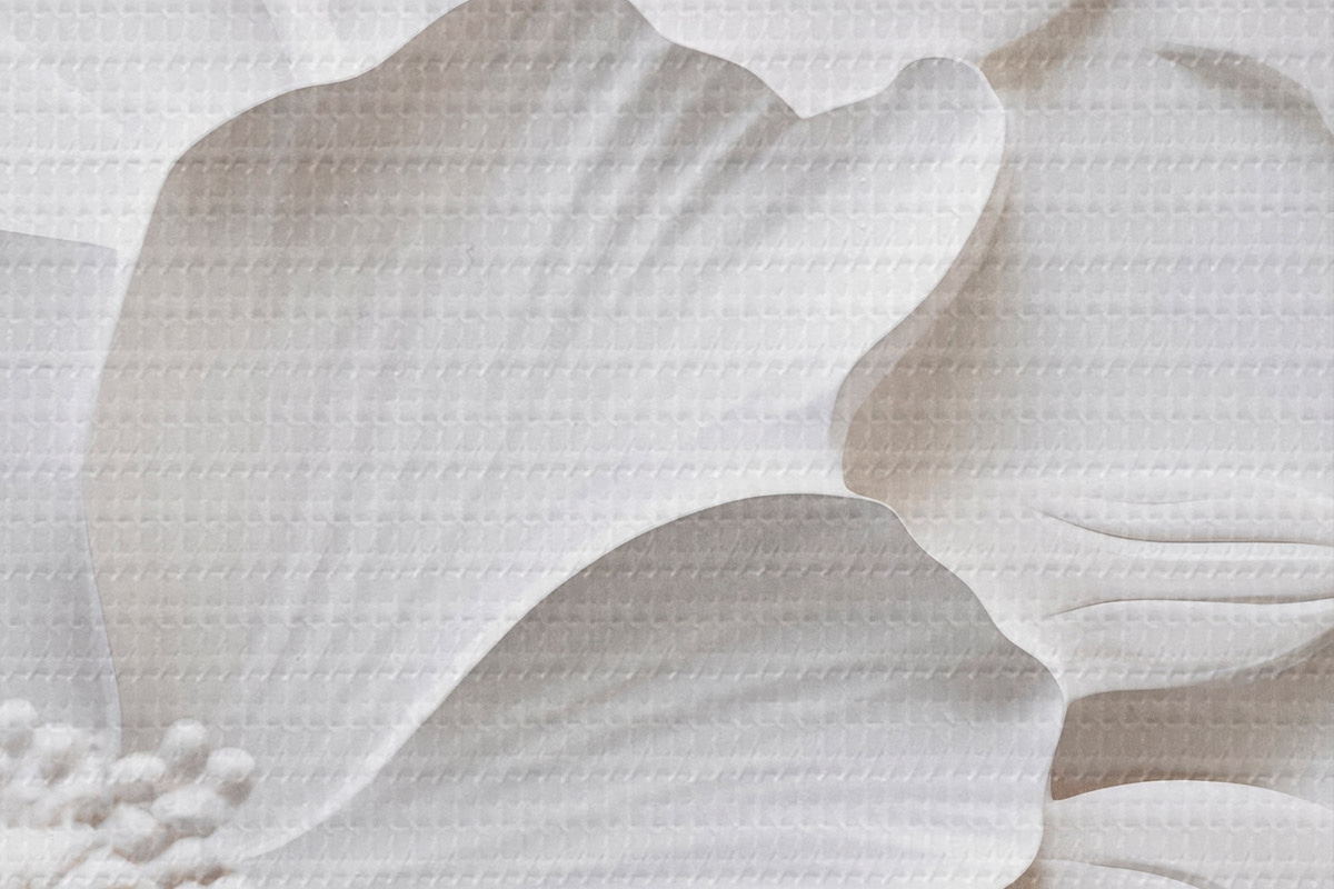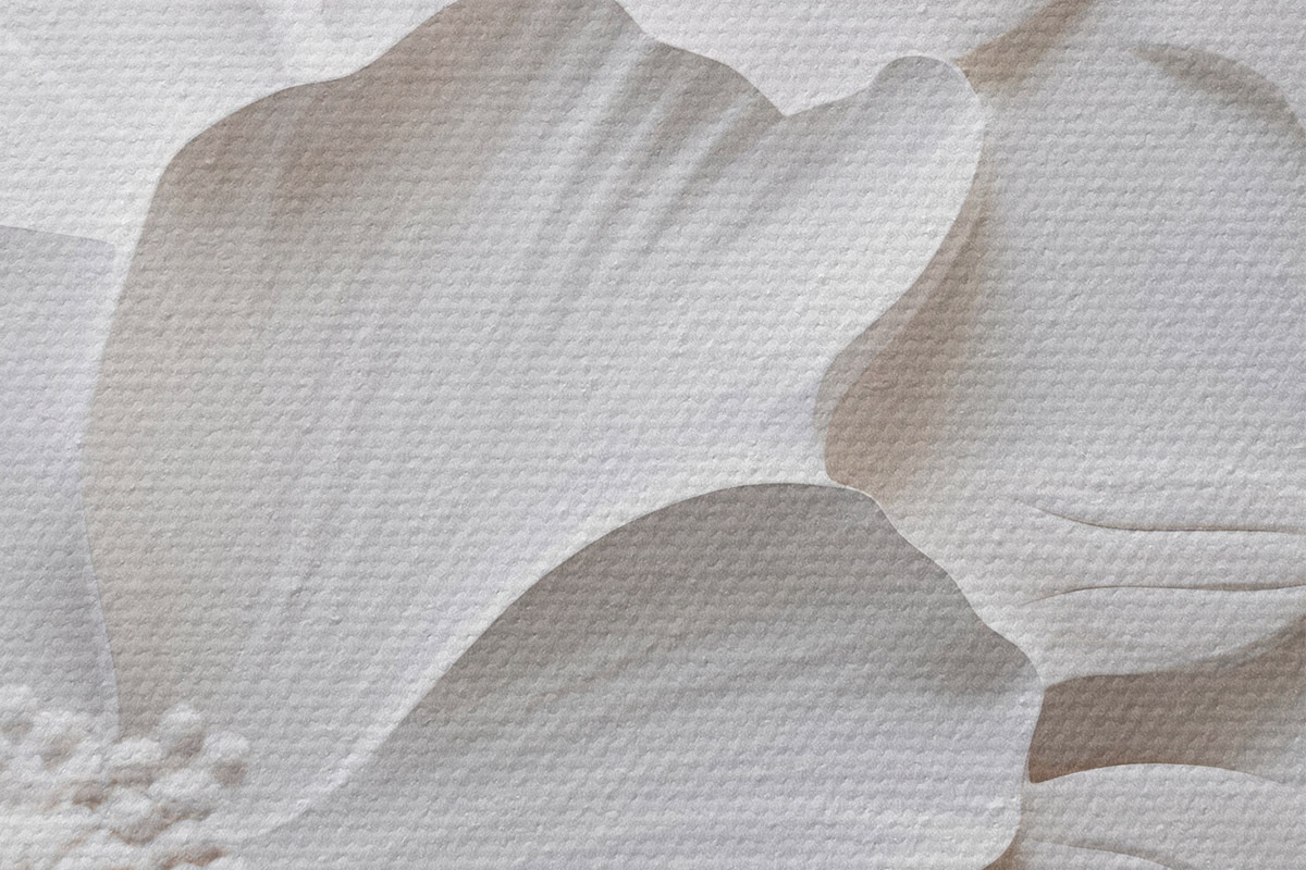 Attēls Dekoratīvi minimālisma stilā veidoti balti ziedi ar lapām, reljefa imitācija, balts fons Nr r45180