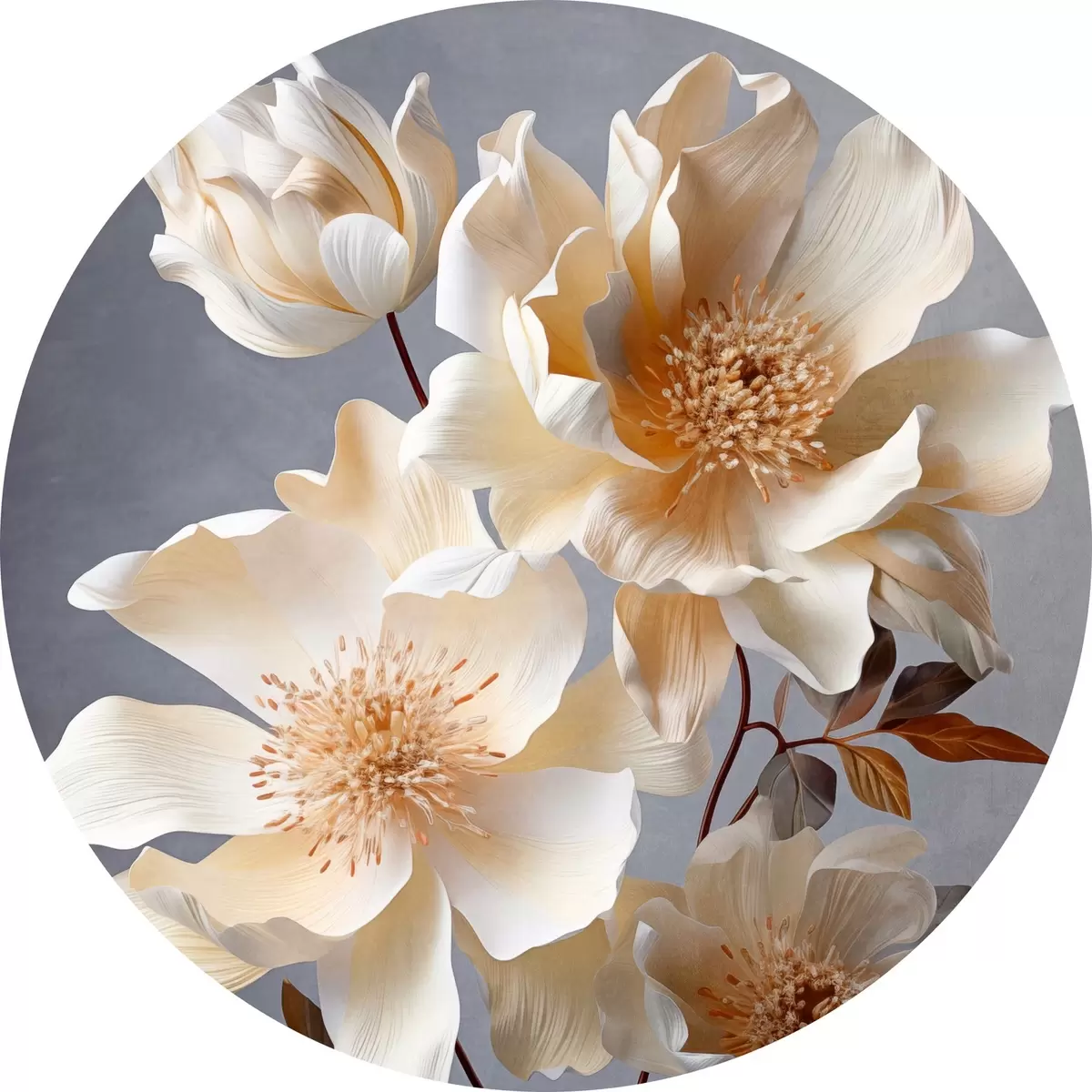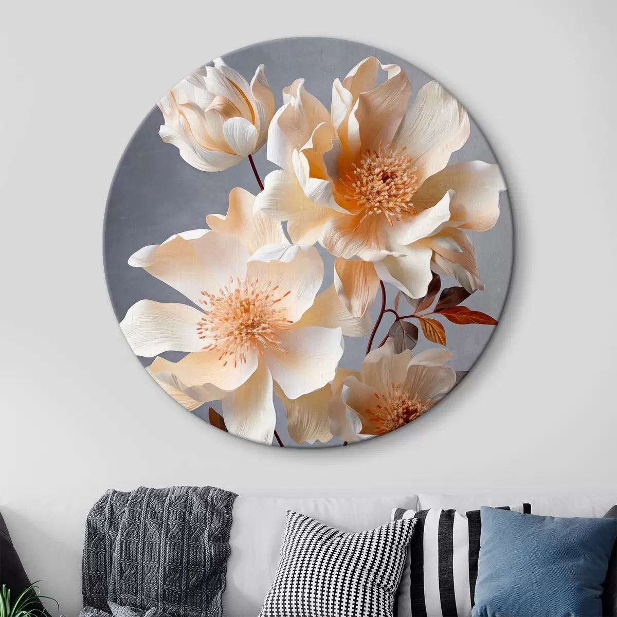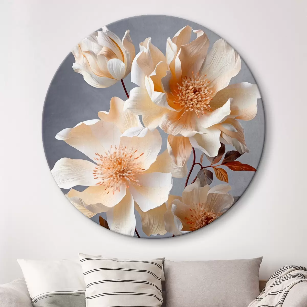 Apaļas gleznas Teksturēti ziedi ar oranžas krāsas ziedkopām un oranžām lapām uz pelēka fona, mīksta gaisma, elegants, detalizēts, reālistisks r45181