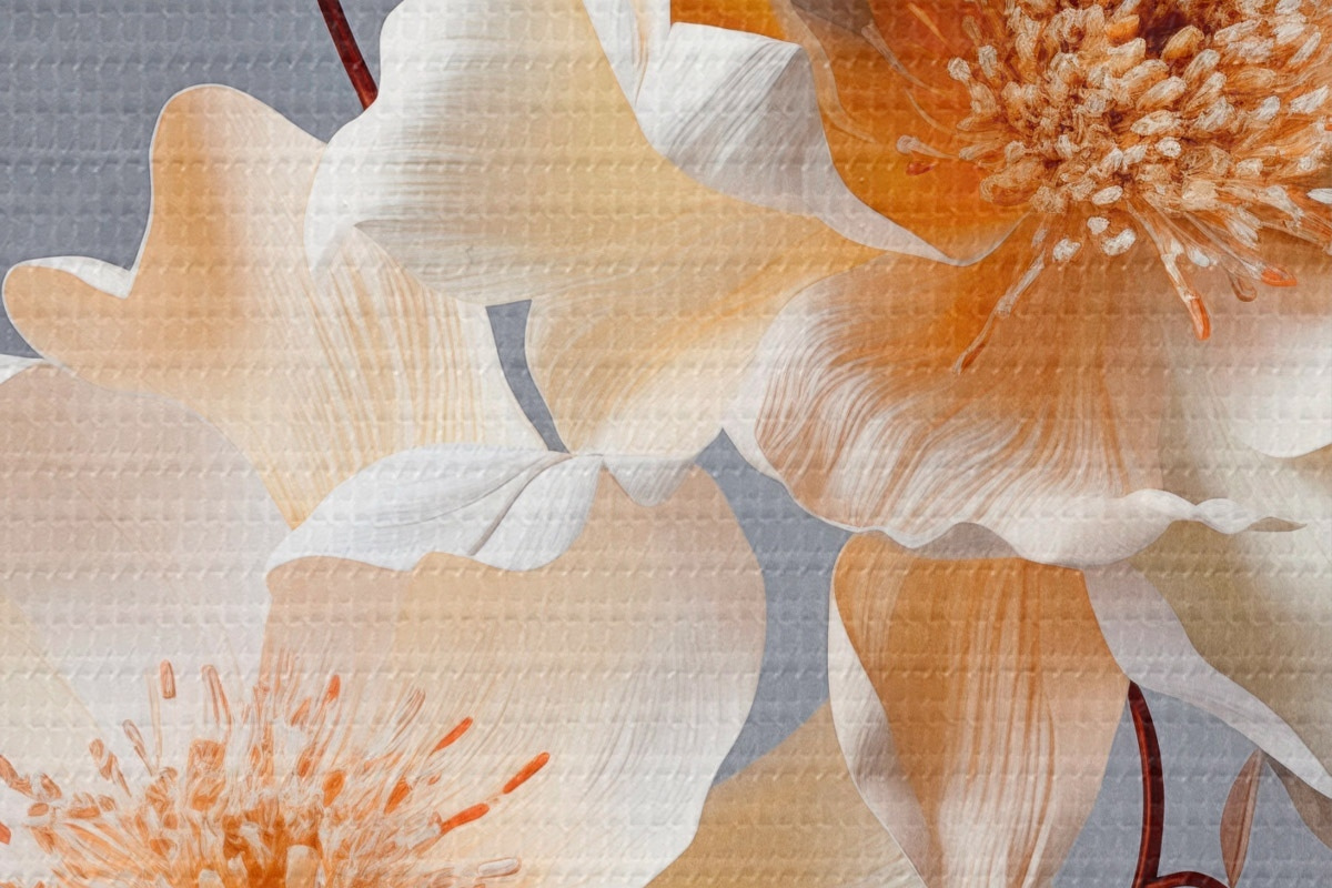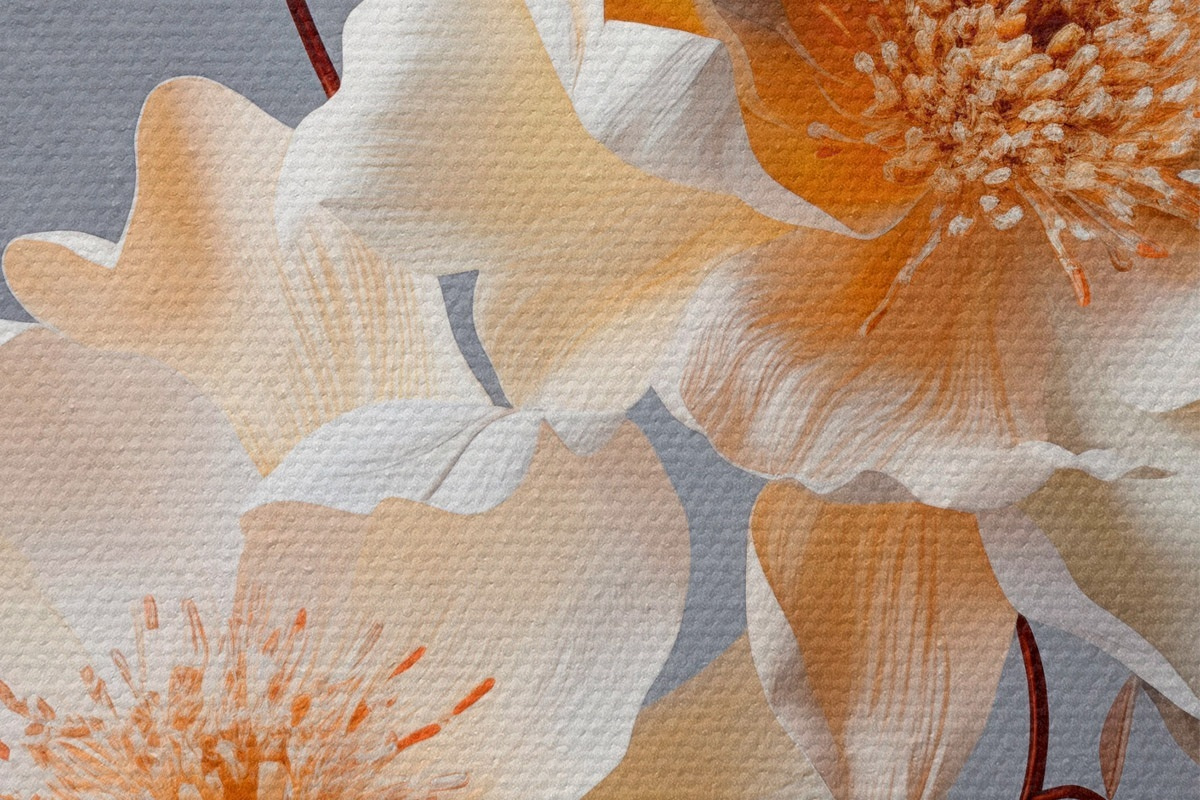 Attēls Teksturēti ziedi ar oranžas krāsas ziedkopām un oranžām lapām uz pelēka fona, mīksta gaisma, elegants, detalizēts, reālistisks Nr r45181