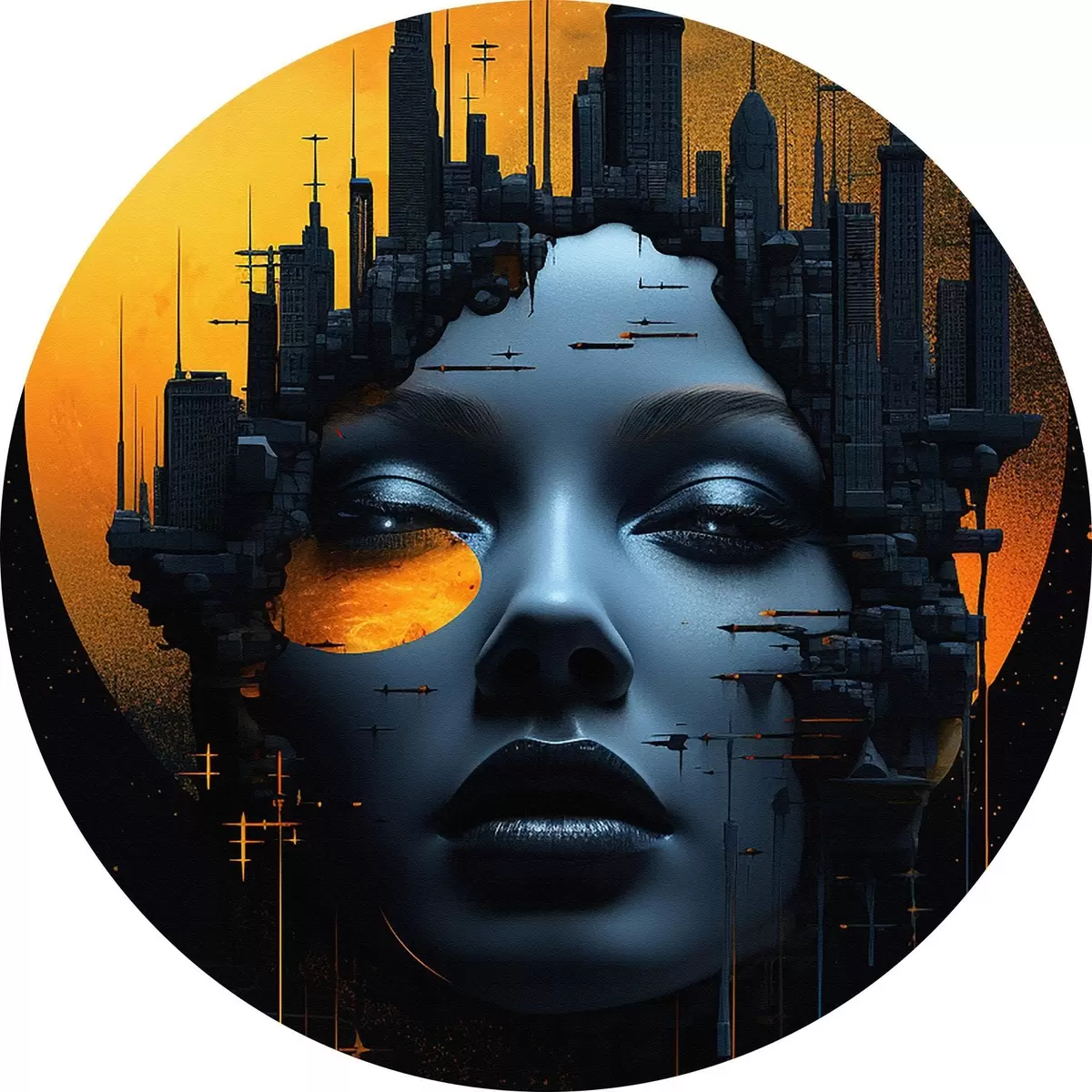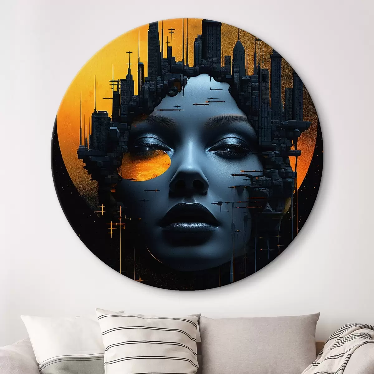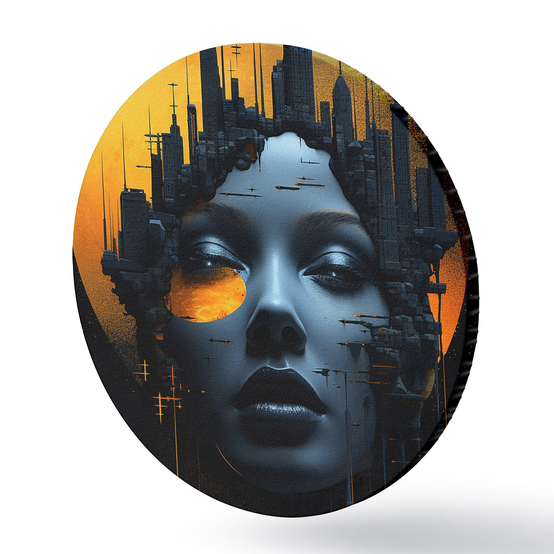 Apaļas gleznas Cilvēki, meitenes seja uz pilsētas fona, abstrakts r45341