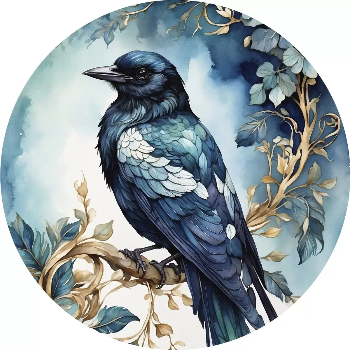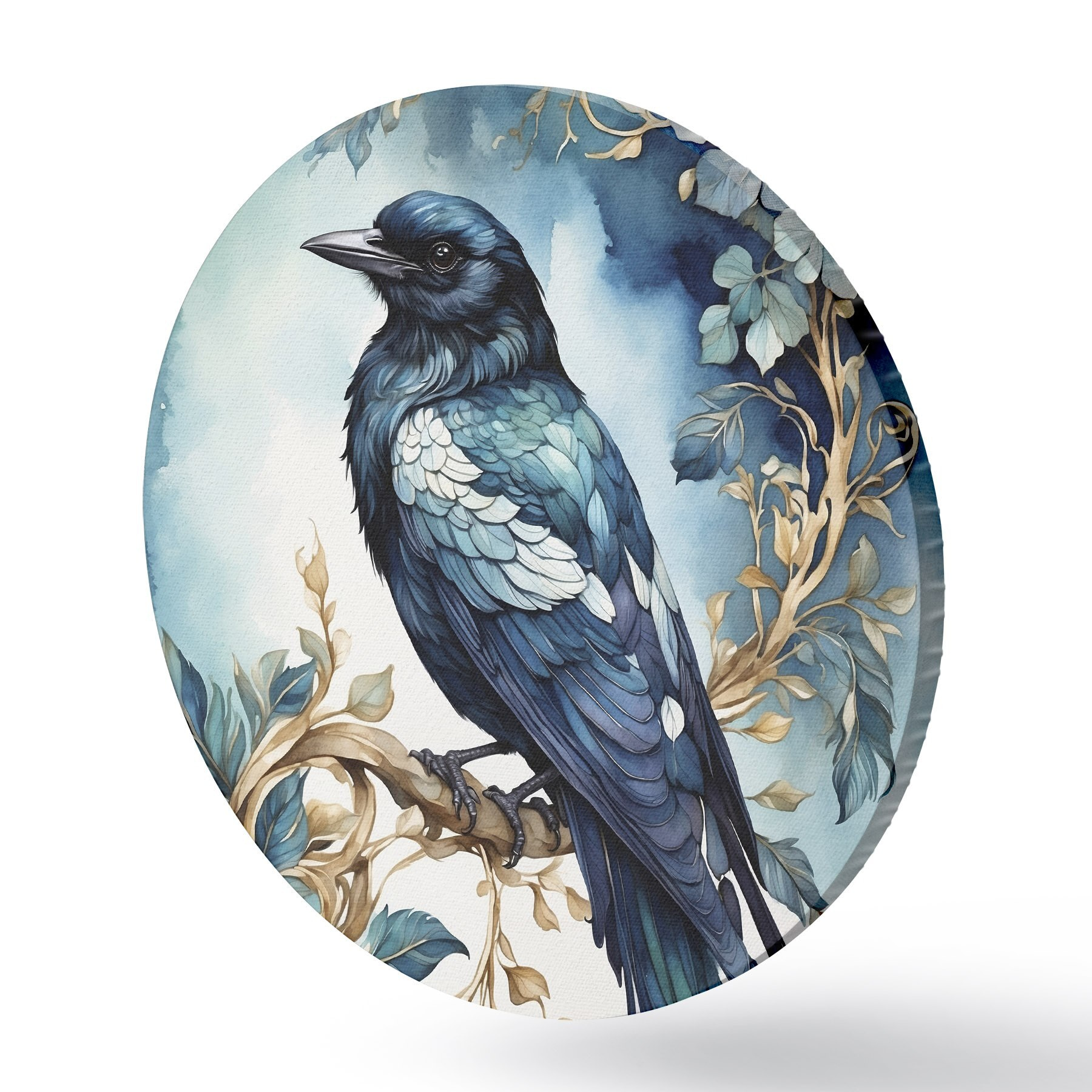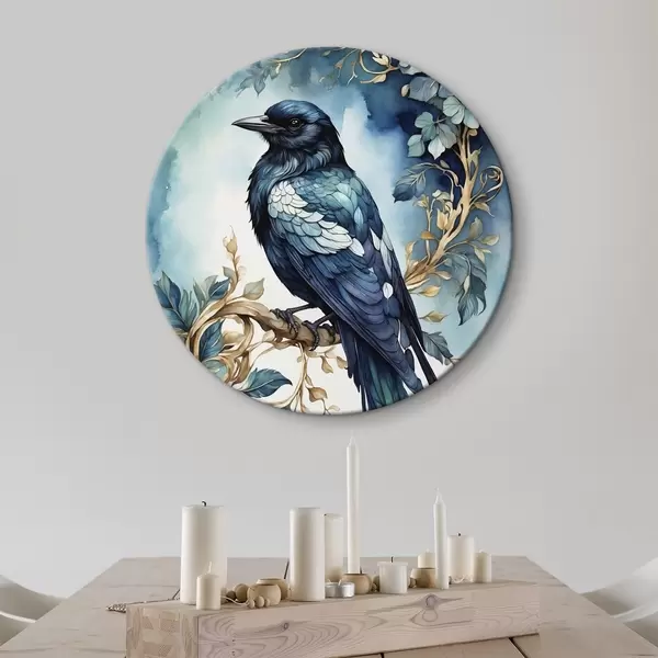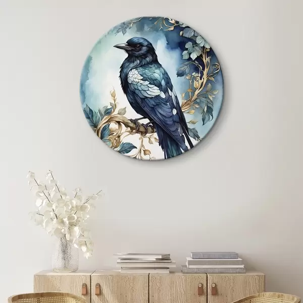 Apaļas gleznas Zils putns uz zara ar akvareļa stila lapām r45483
