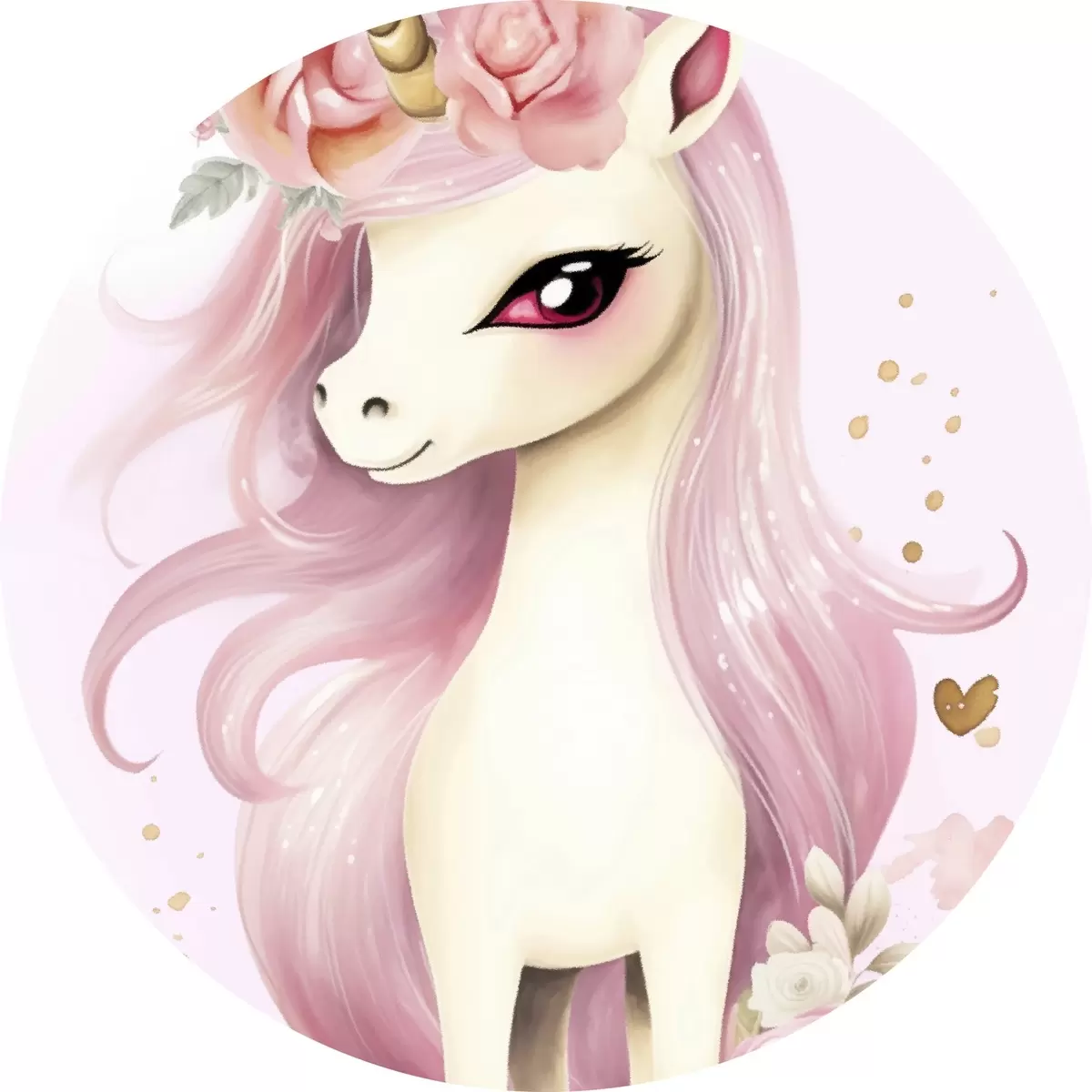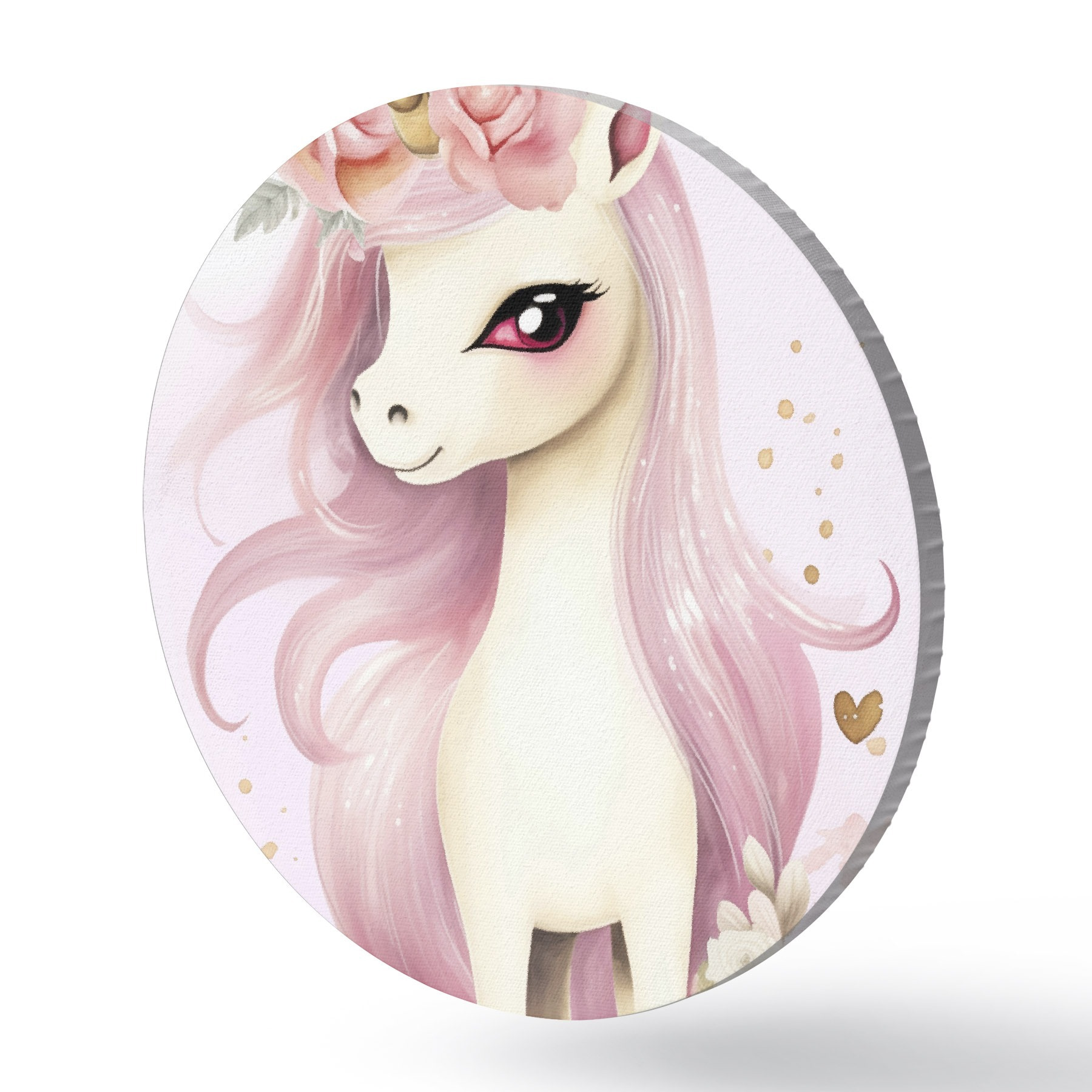 Apaļas gleznas Vienradzis ar rozā grivu un ziedu vainagu r45484