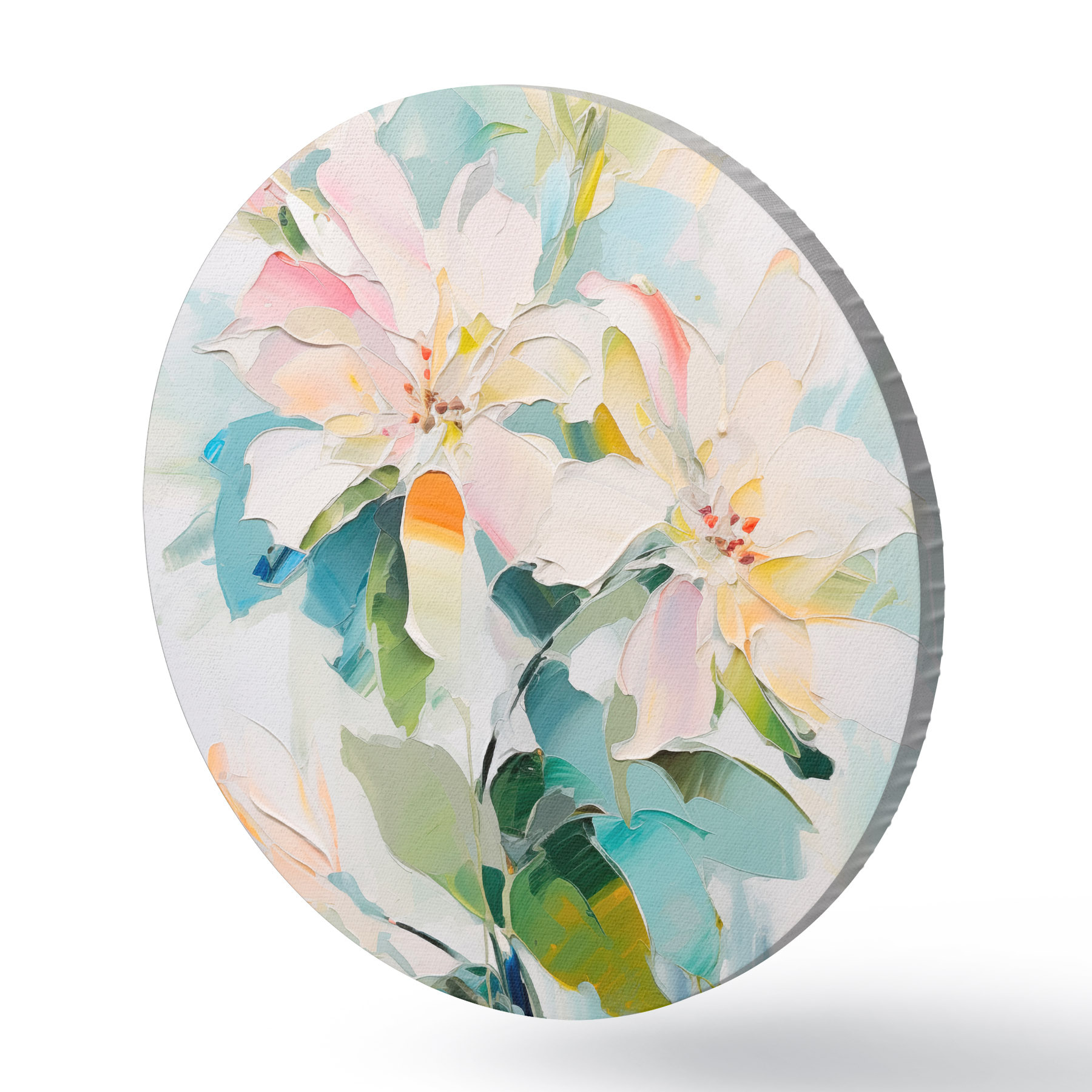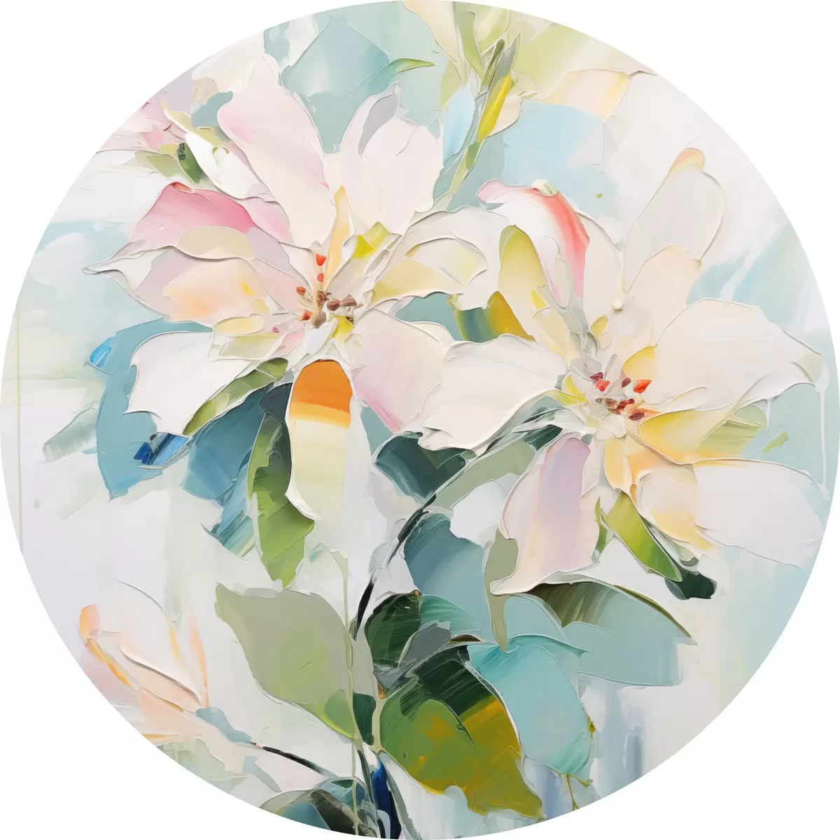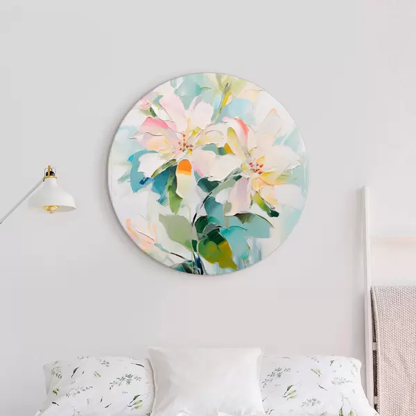 Apaļas gleznas Ziedi ar krāsainiem akcentiem, zaļas lapas, mīksti triepieni ar otu, eļļas glezna imitācija, gaiši zils fons r45549