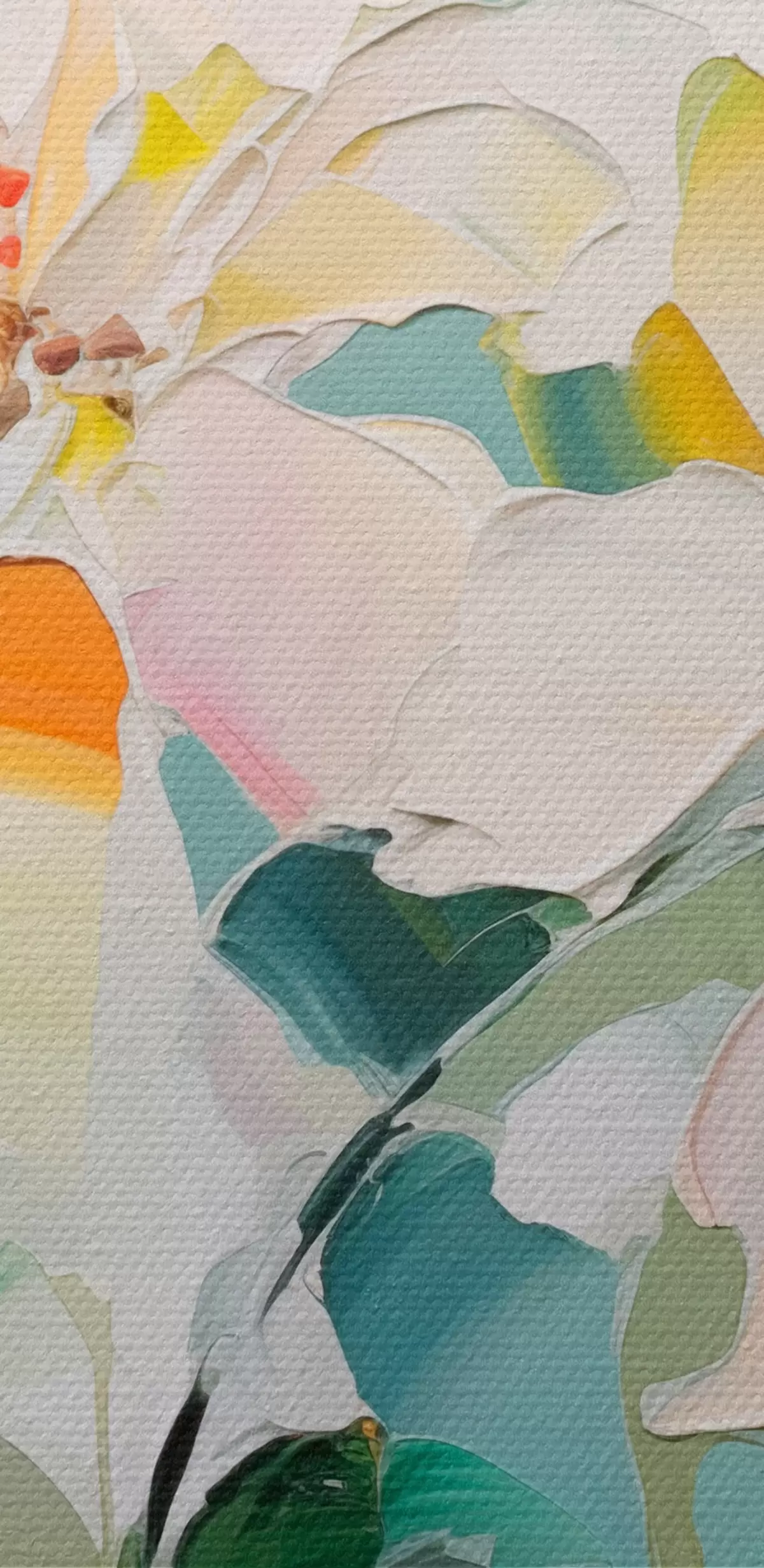 Attēls Ziedi ar krāsainiem akcentiem, zaļas lapas, mīksti triepieni ar otu, eļļas glezna imitācija, gaiši zils fons Nr r45549