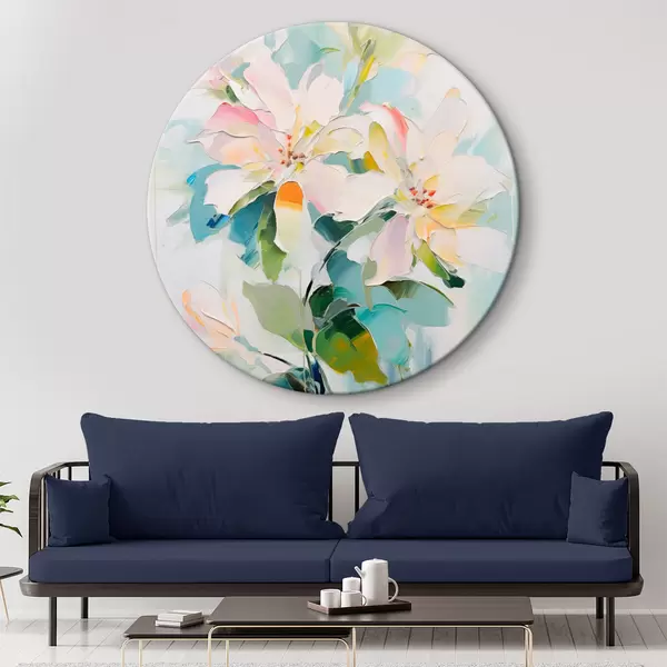 Apaļas gleznas Ziedi ar krāsainiem akcentiem, zaļas lapas, mīksti triepieni ar otu, eļļas glezna imitācija, gaiši zils fons r45549