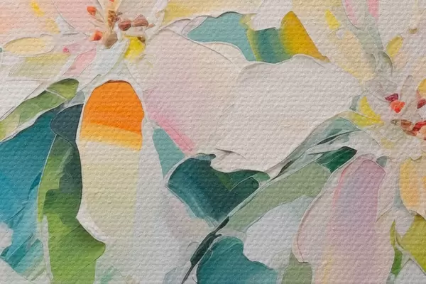 Attēls Ziedi ar krāsainiem akcentiem, zaļas lapas, mīksti triepieni ar otu, eļļas glezna imitācija, gaiši zils fons Nr r45549
