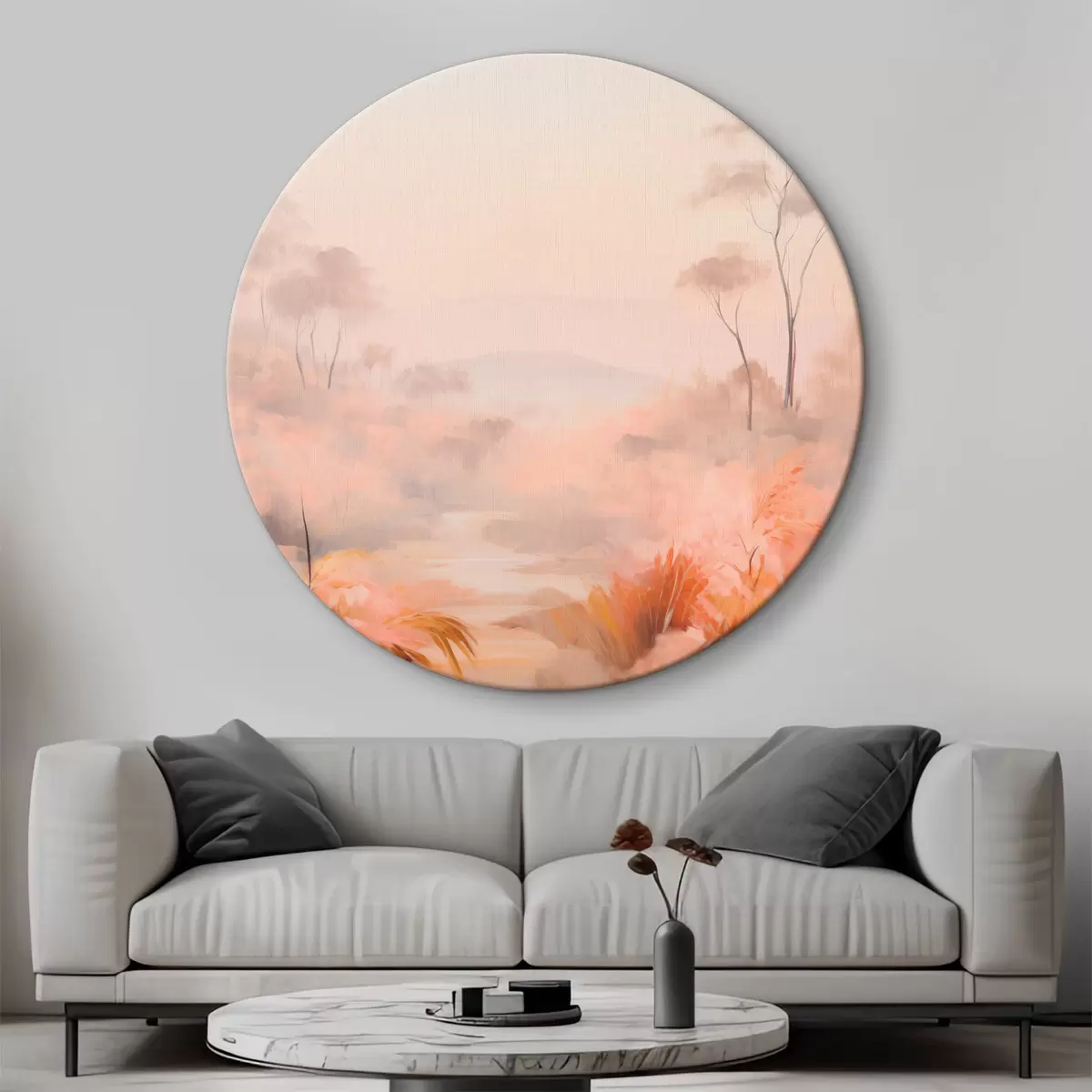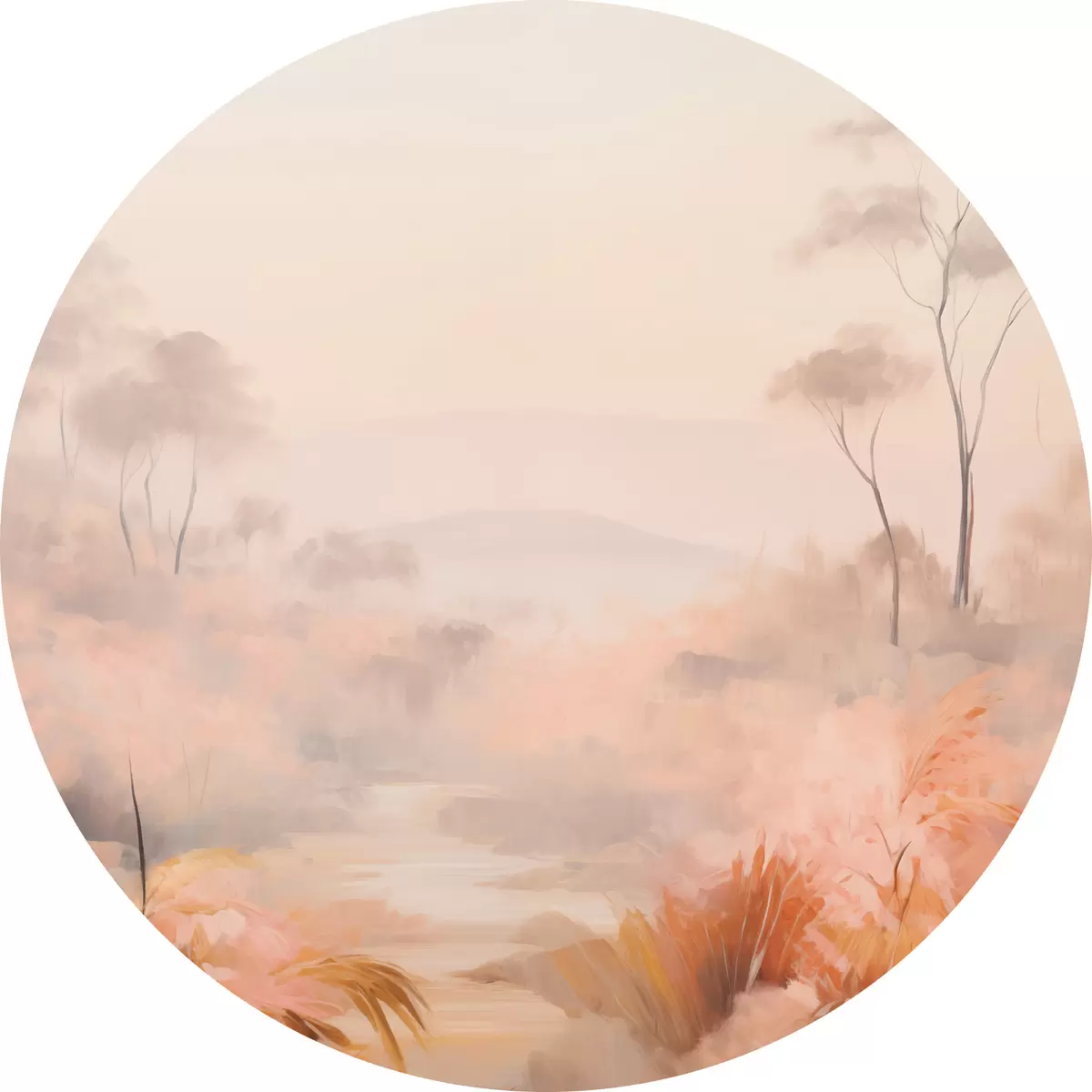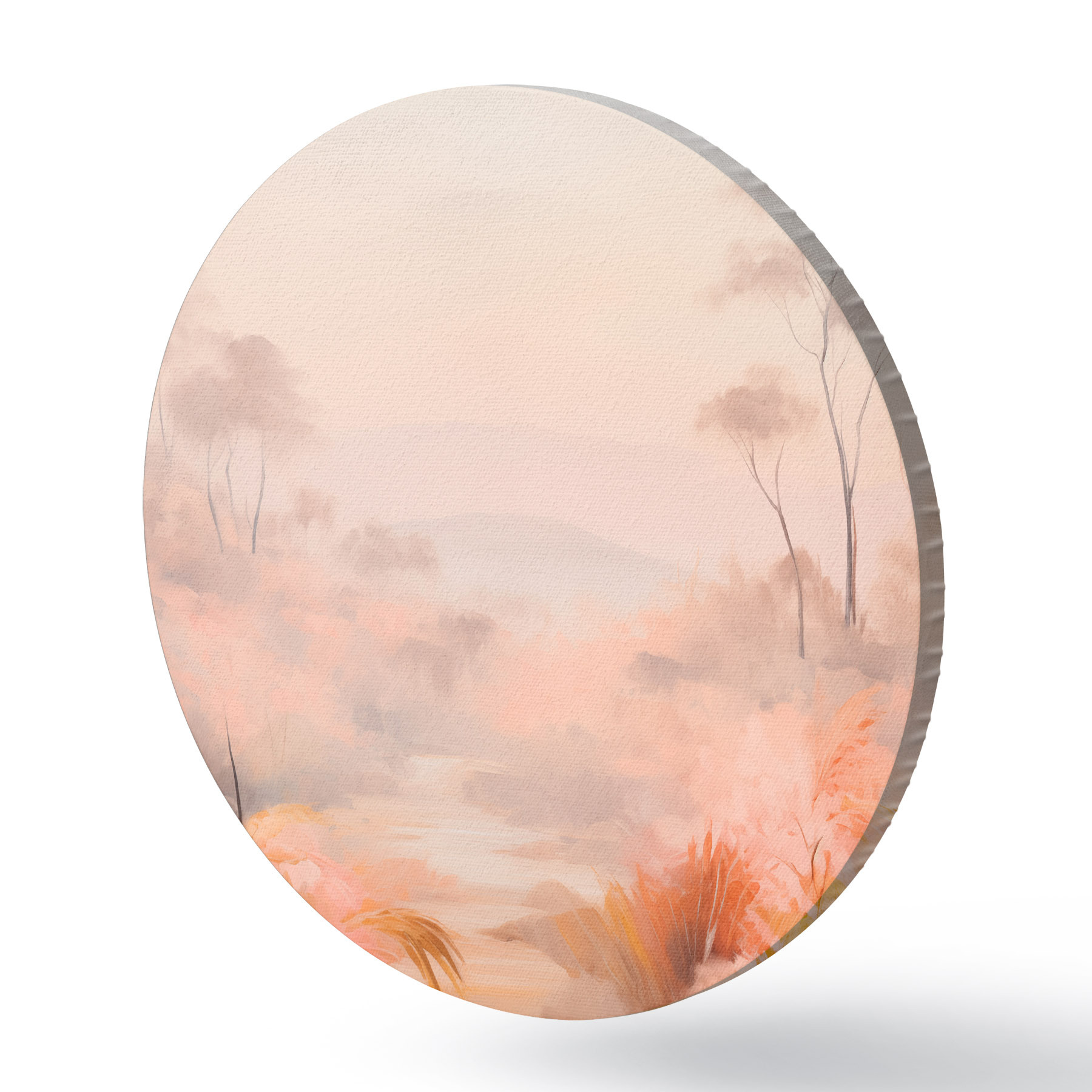 Apaļas gleznas Ainava ar krūmiem un kokiem rozā, oranžā un brūnā krāsā ar kalniem fonā r45553