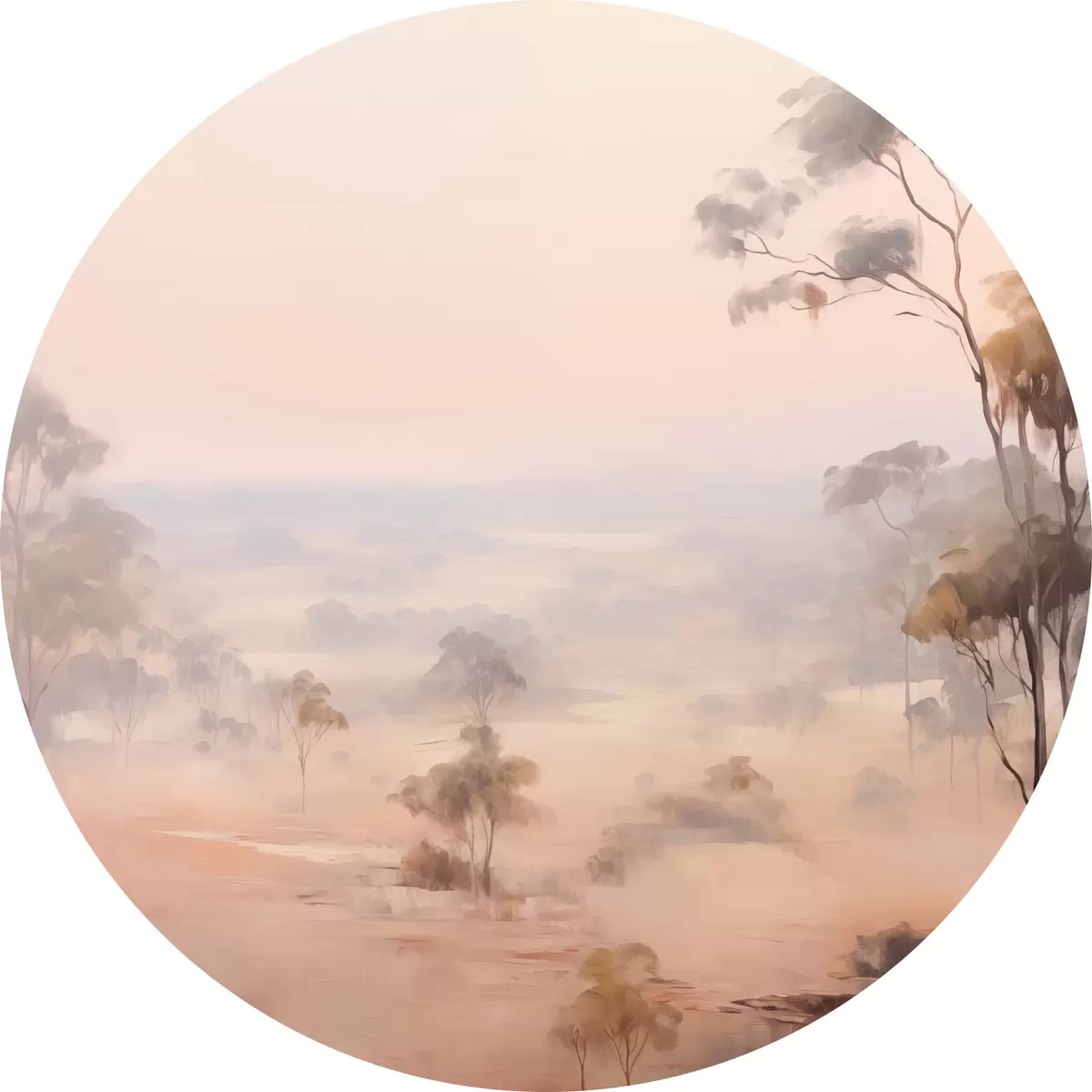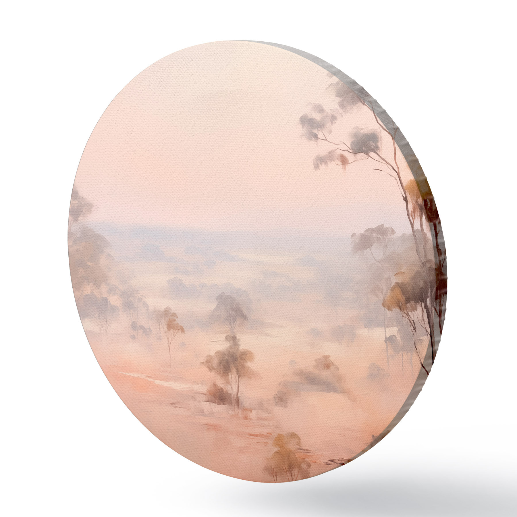 Apaļas gleznas Ainava ar krūmiem un kokiem pasteļtoņos rozā, oranžā un brūnā krāsā ar kalniem fonā r45554