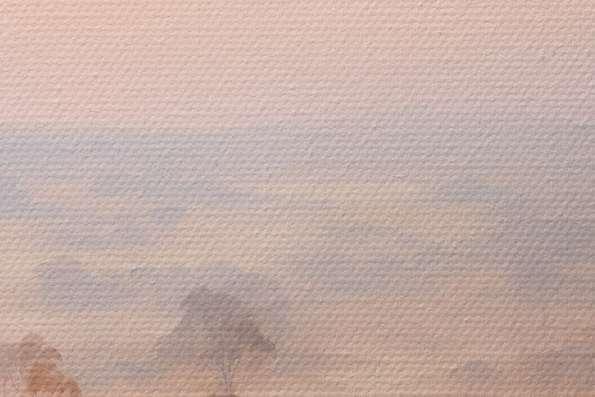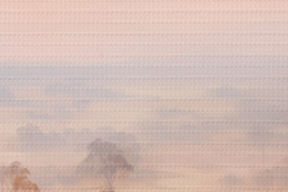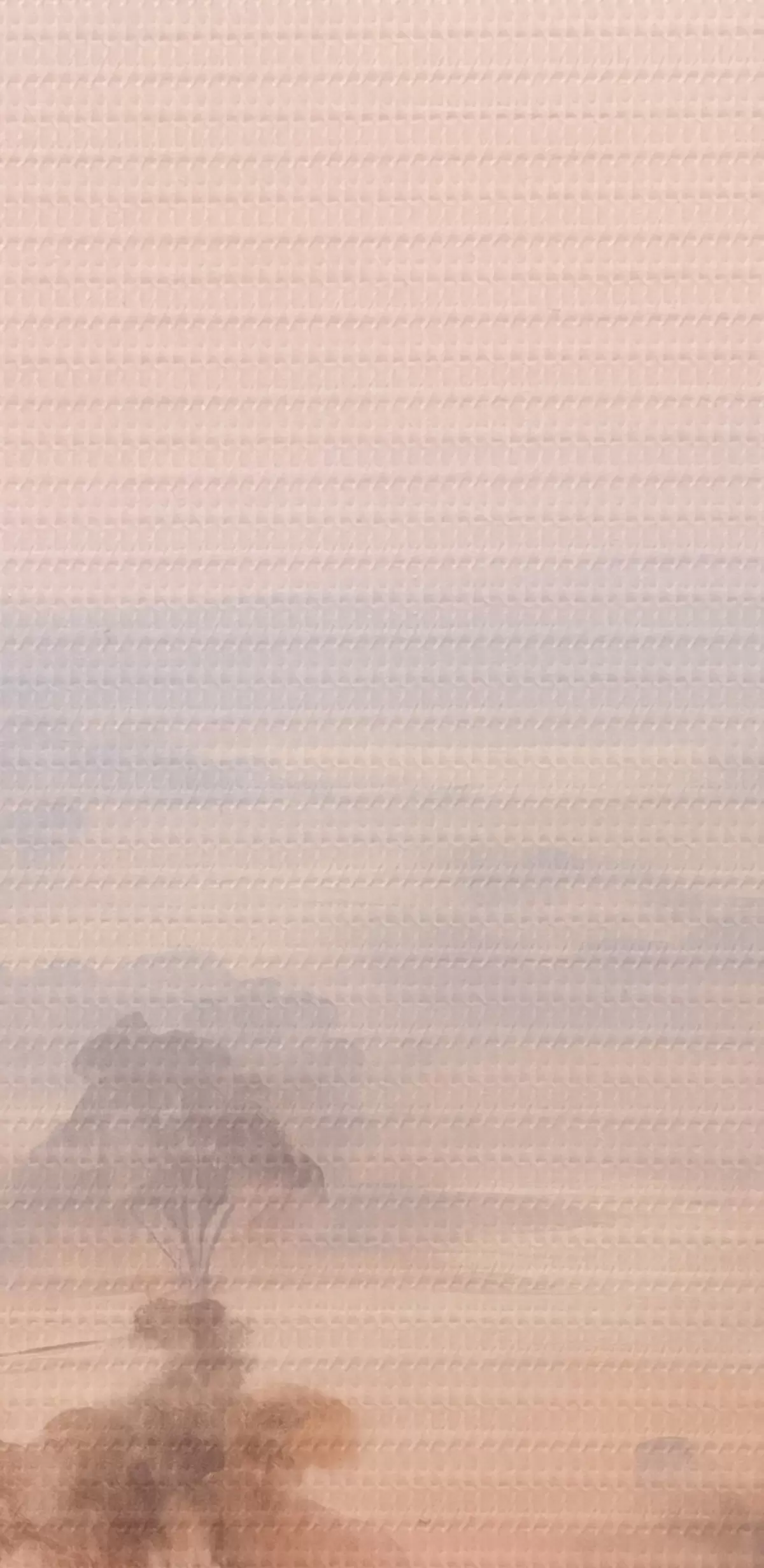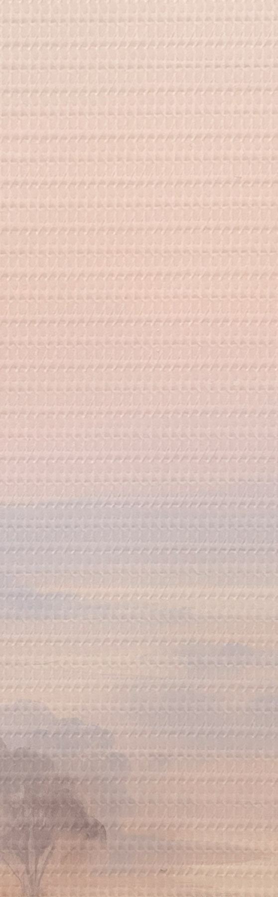 Attēls Ainava ar krūmiem un kokiem pasteļtoņos rozā, oranžā un brūnā krāsā ar kalniem fonā Nr r45554