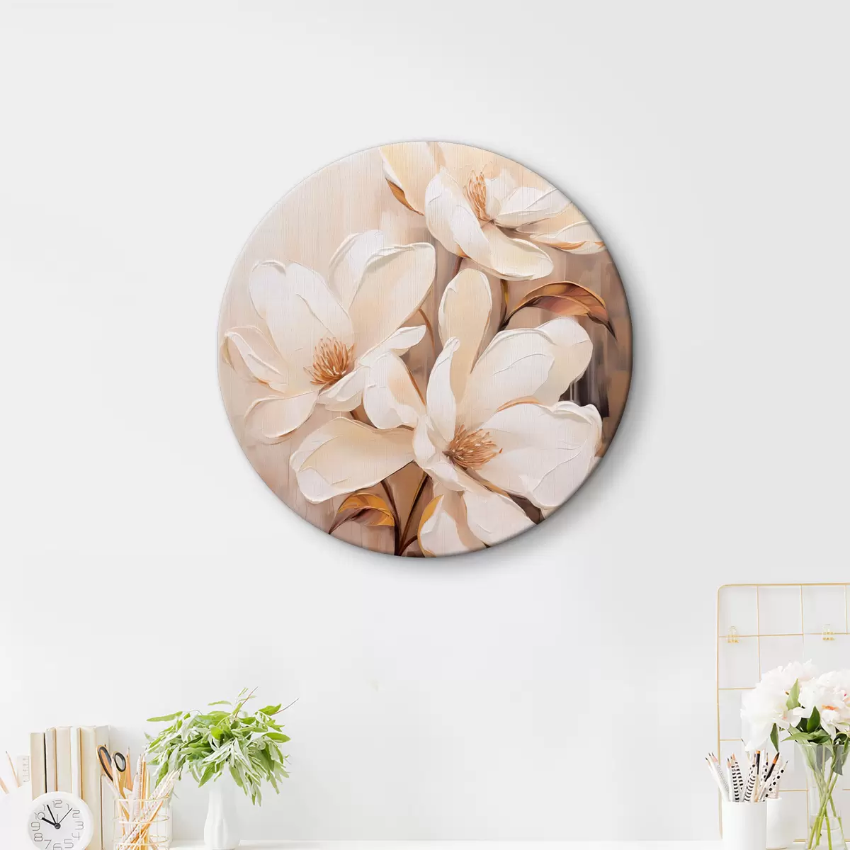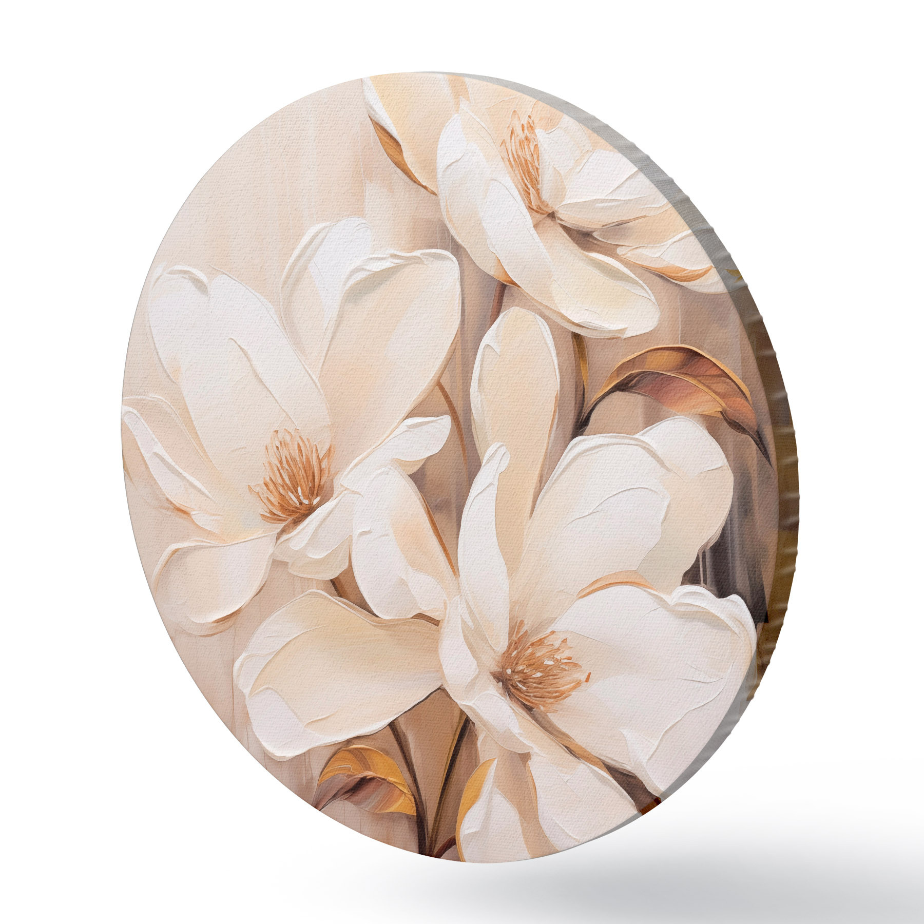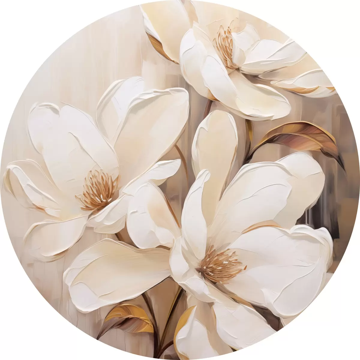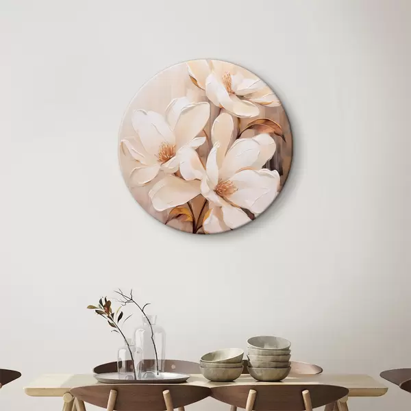 Apaļas gleznas Balti magnolijas ziedi uz mīksta, izplūduša bēša un brūna toņu fona, eleganta ziedu kompozīcija r45571