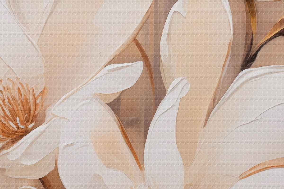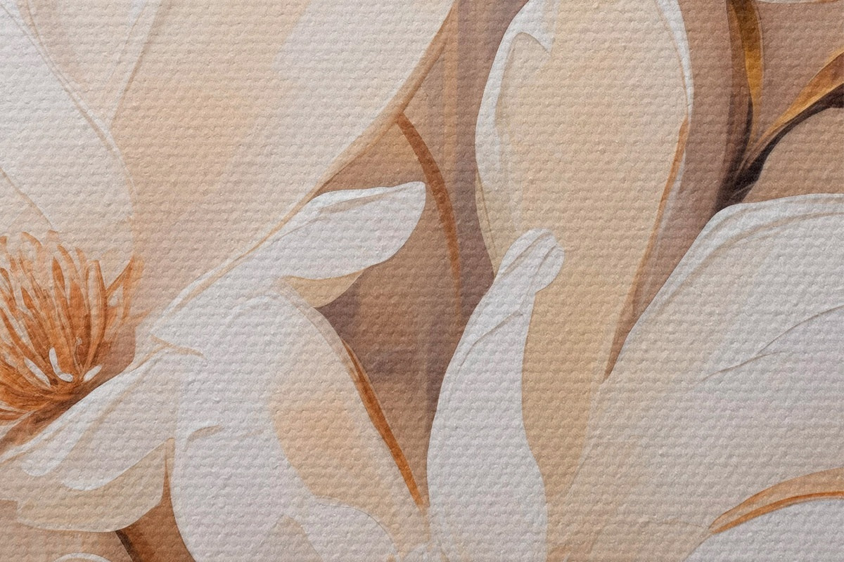 Attēls Balti magnolijas ziedi uz mīksta, izplūduša bēša un brūna toņu fona, eleganta ziedu kompozīcija Nr r45571