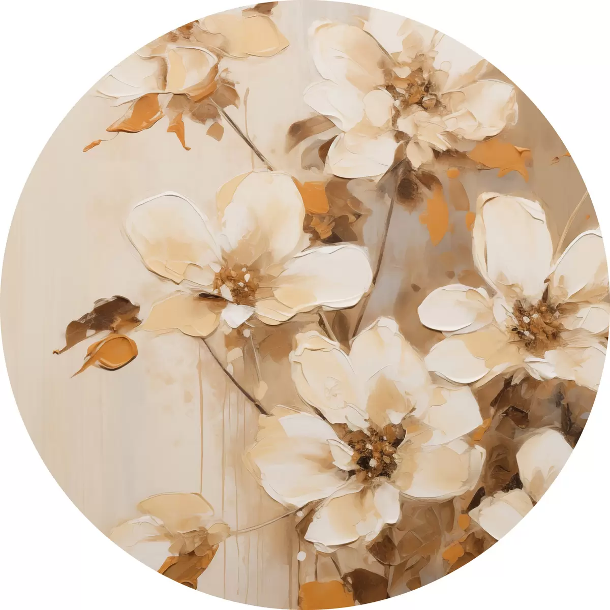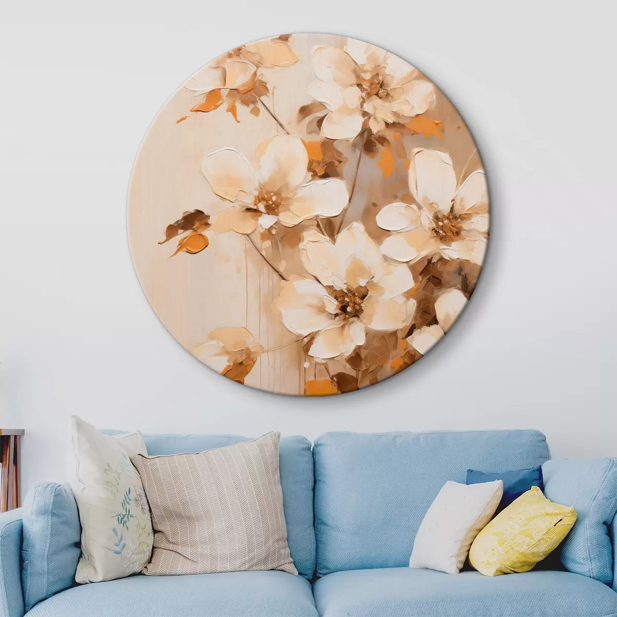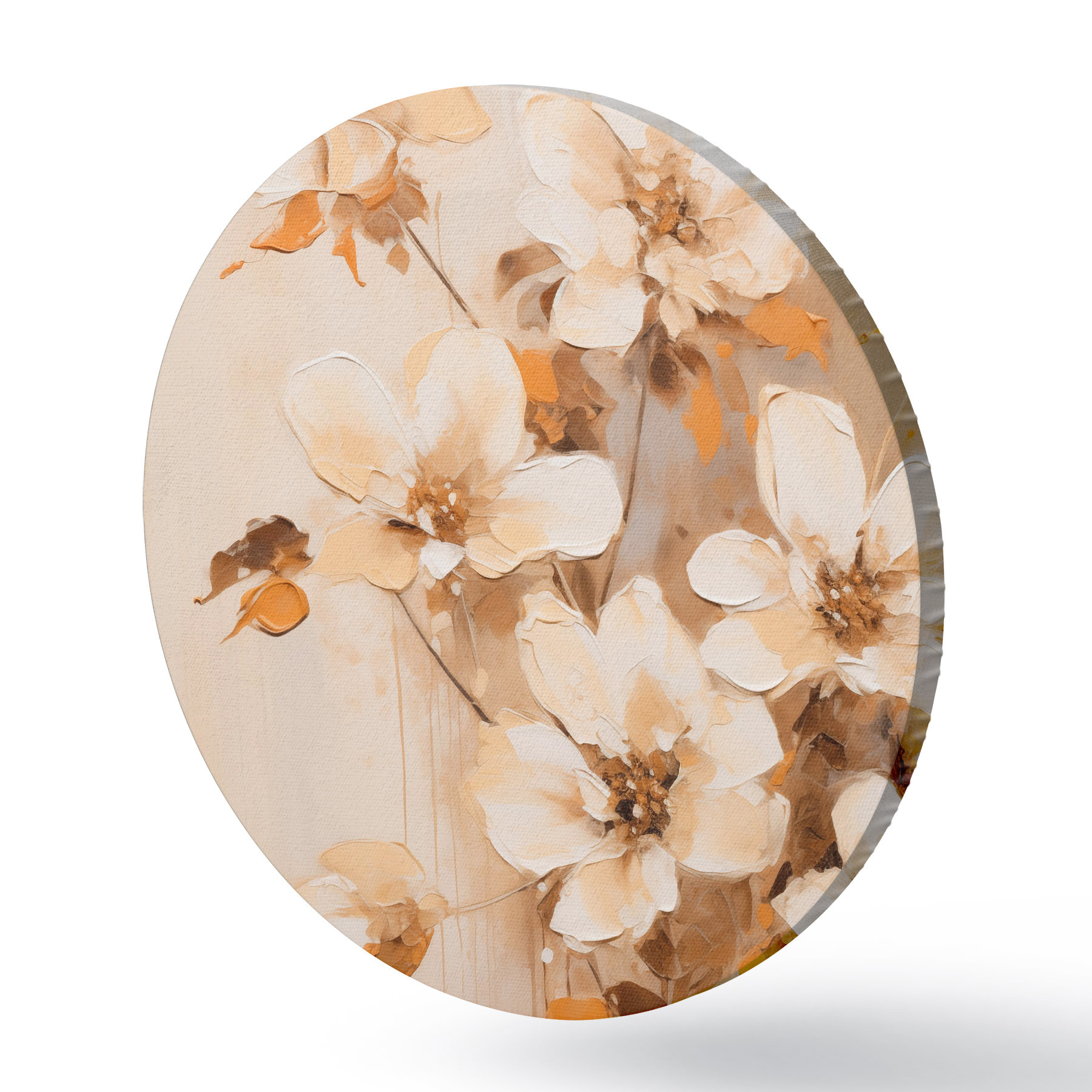 Apaļas gleznas Balti ziedi ar oranžām lapām, maigi triepieni, ziedu kompozīcija, botāniskā māksla r45574