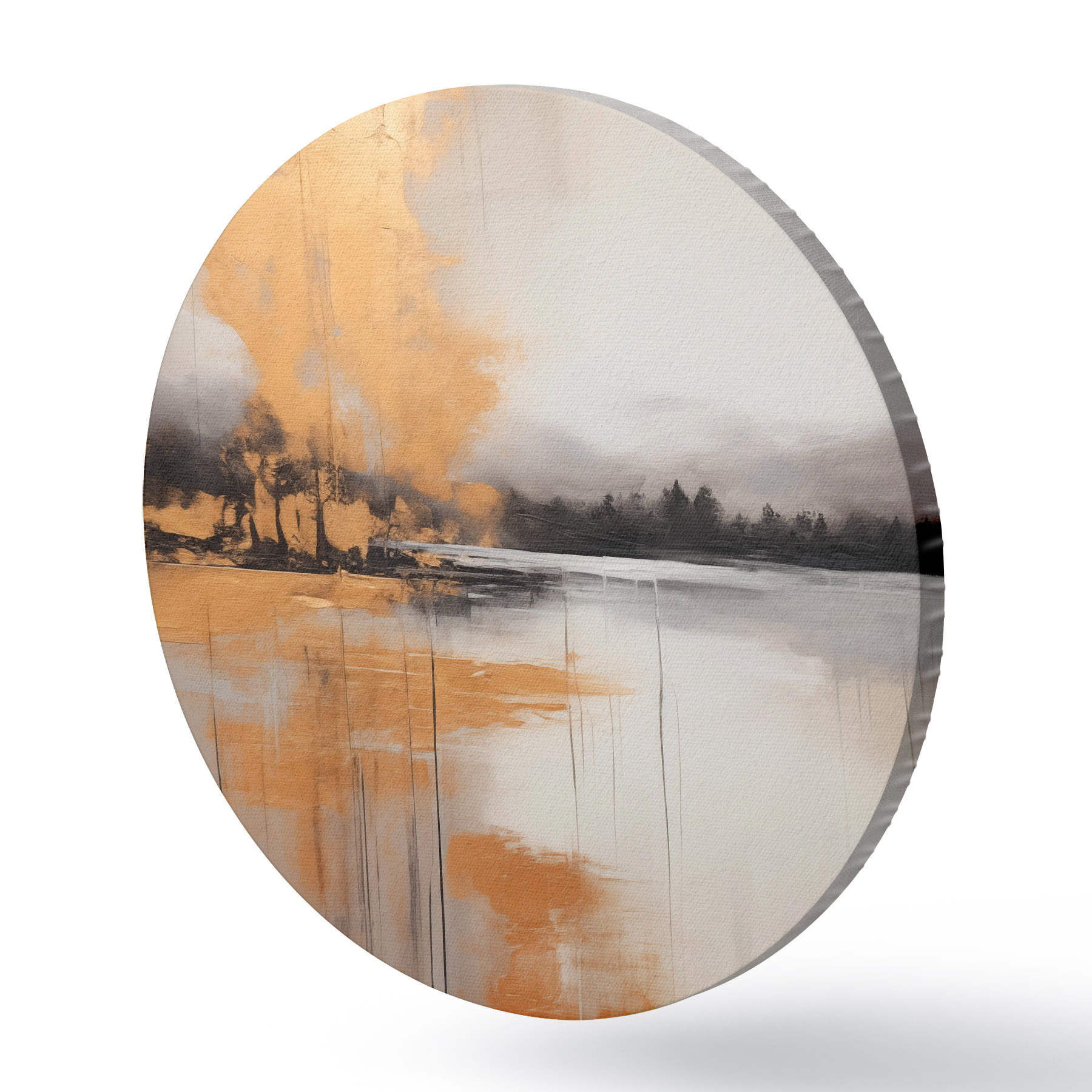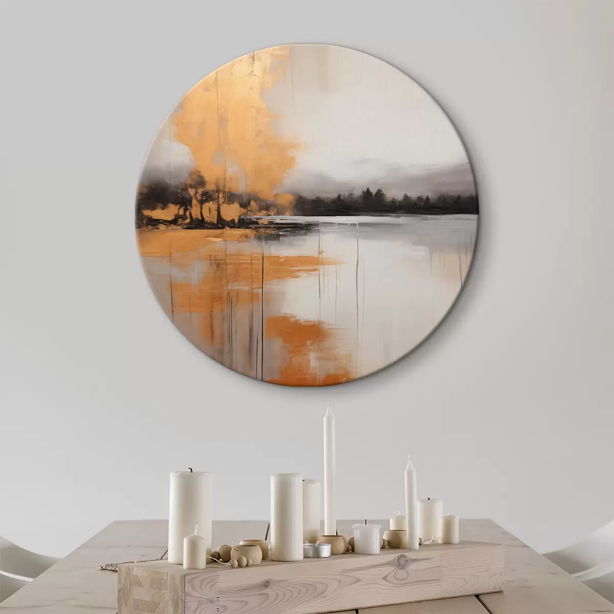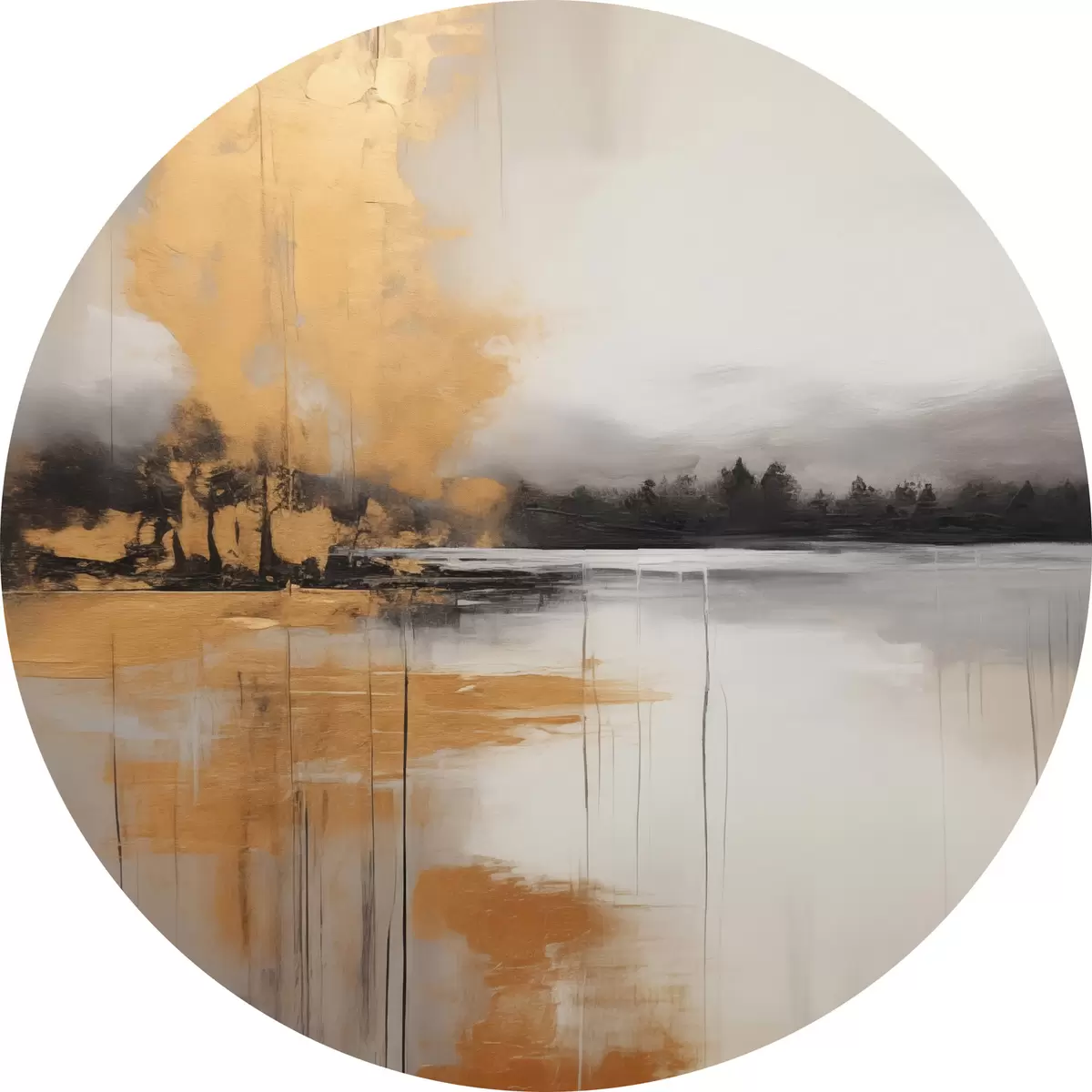 Apaļas gleznas Abstrakta ainava ar ezeru, koku un dzeltenu miglu , ūdens atspoguļo un mākoņainas debesis r45575