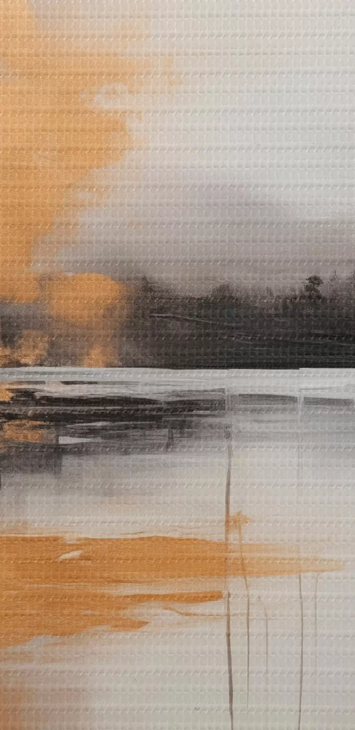 Attēls Abstrakta ainava ar ezeru, koku un dzeltenu miglu , ūdens atspoguļo un mākoņainas debesis Nr r45575
