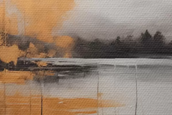 Attēls Abstrakta ainava ar ezeru, koku un dzeltenu miglu , ūdens atspoguļo un mākoņainas debesis Nr r45575