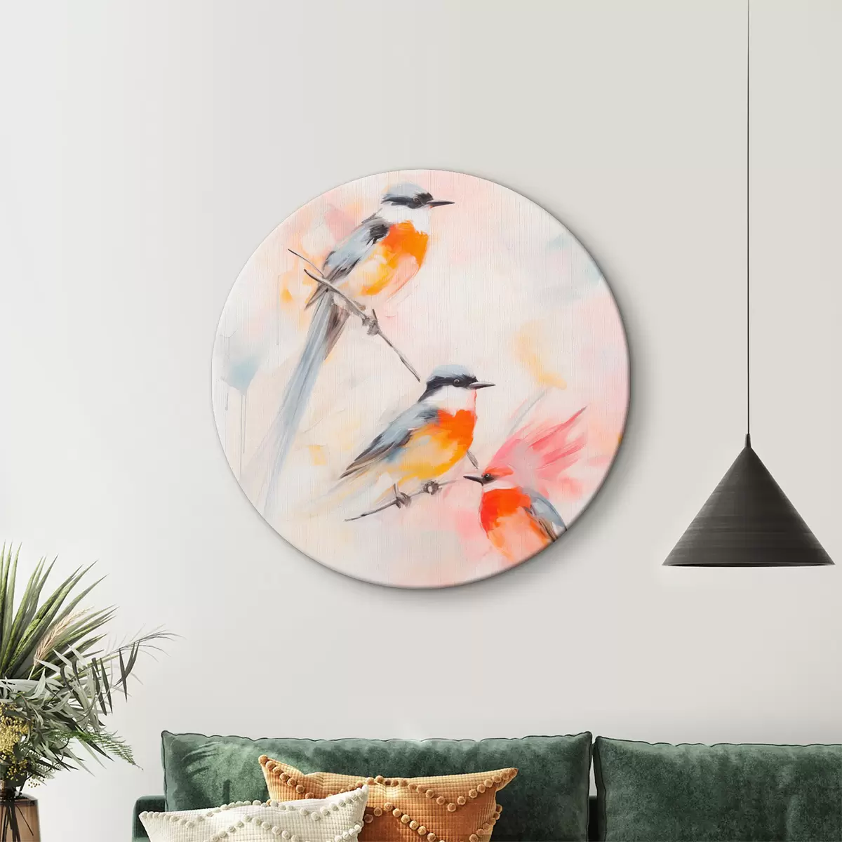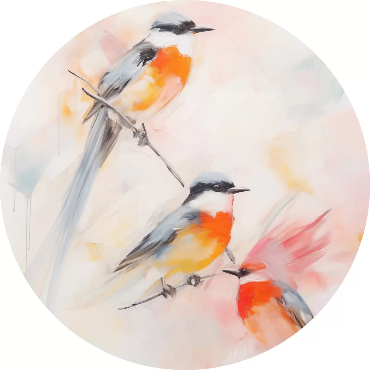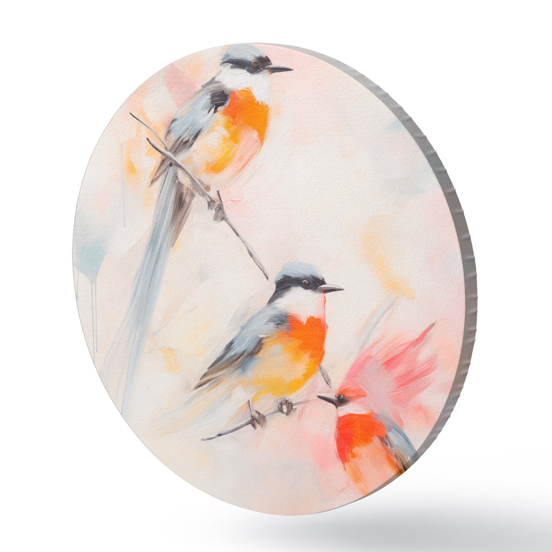 Apaļas gleznas Putni, kas sēž uz zariem , maigas pasteļtoņi, gaišs fons ar rozā un baltiem toņiem r45577