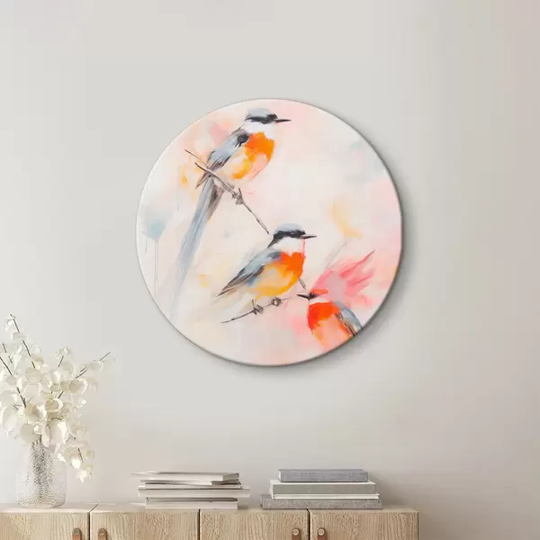 Apaļas gleznas Putni, kas sēž uz zariem , maigas pasteļtoņi, gaišs fons ar rozā un baltiem toņiem r45577