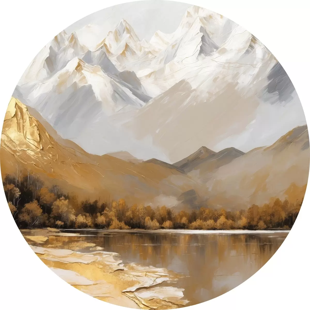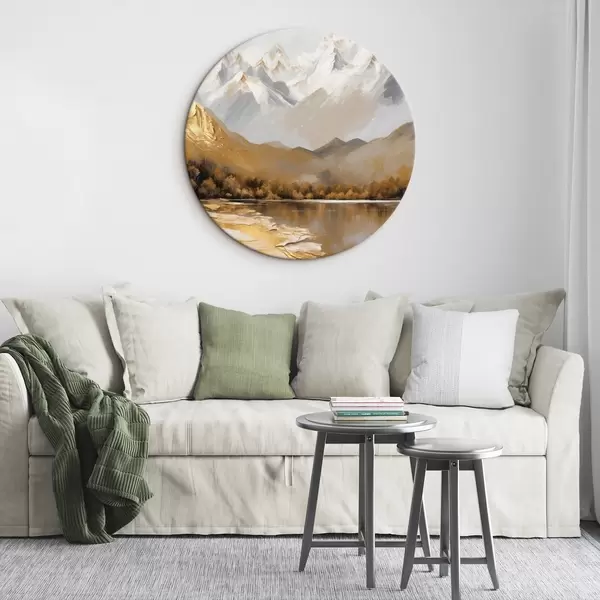 Apaļas gleznas Kalnu ainava ar ezeru un kokiem r45620