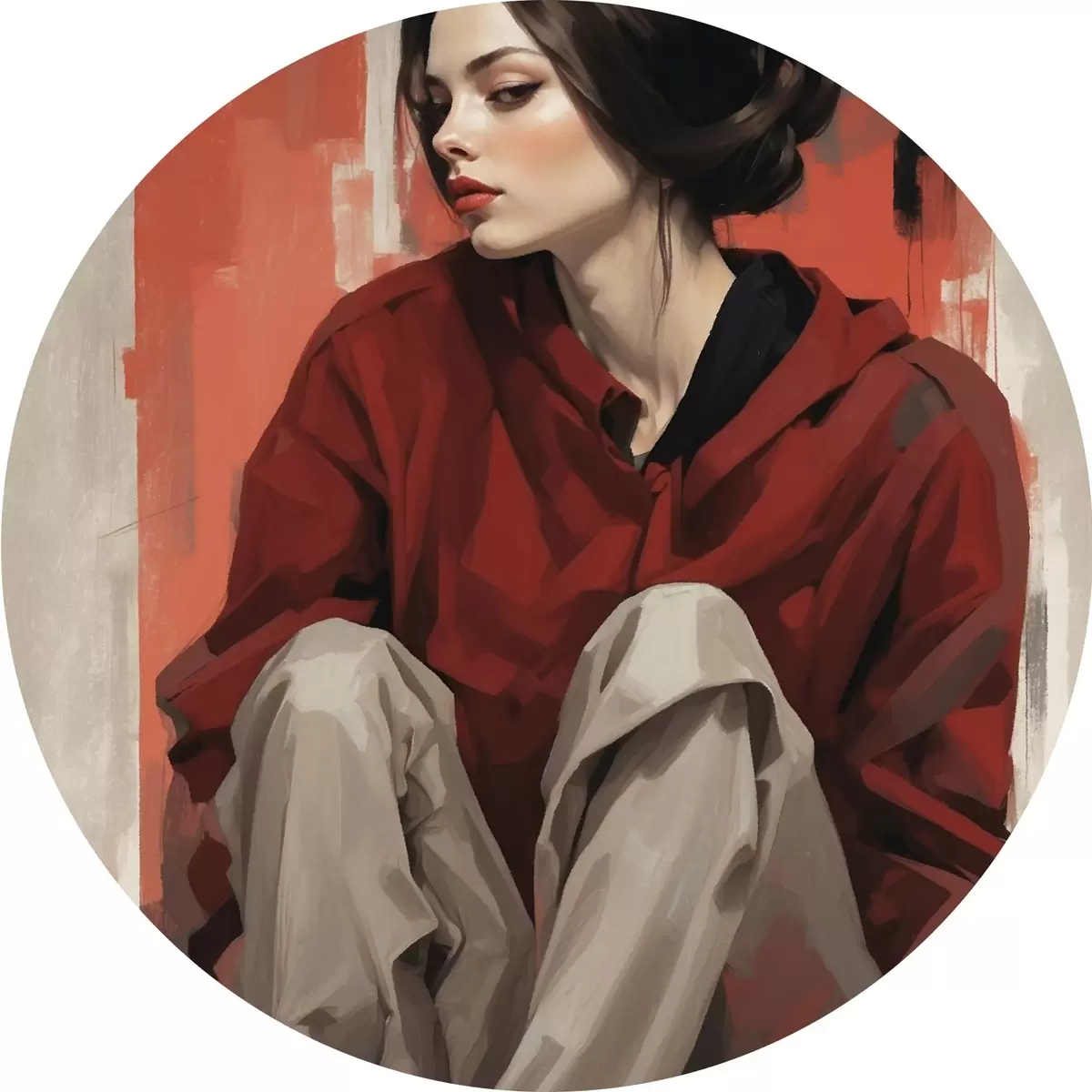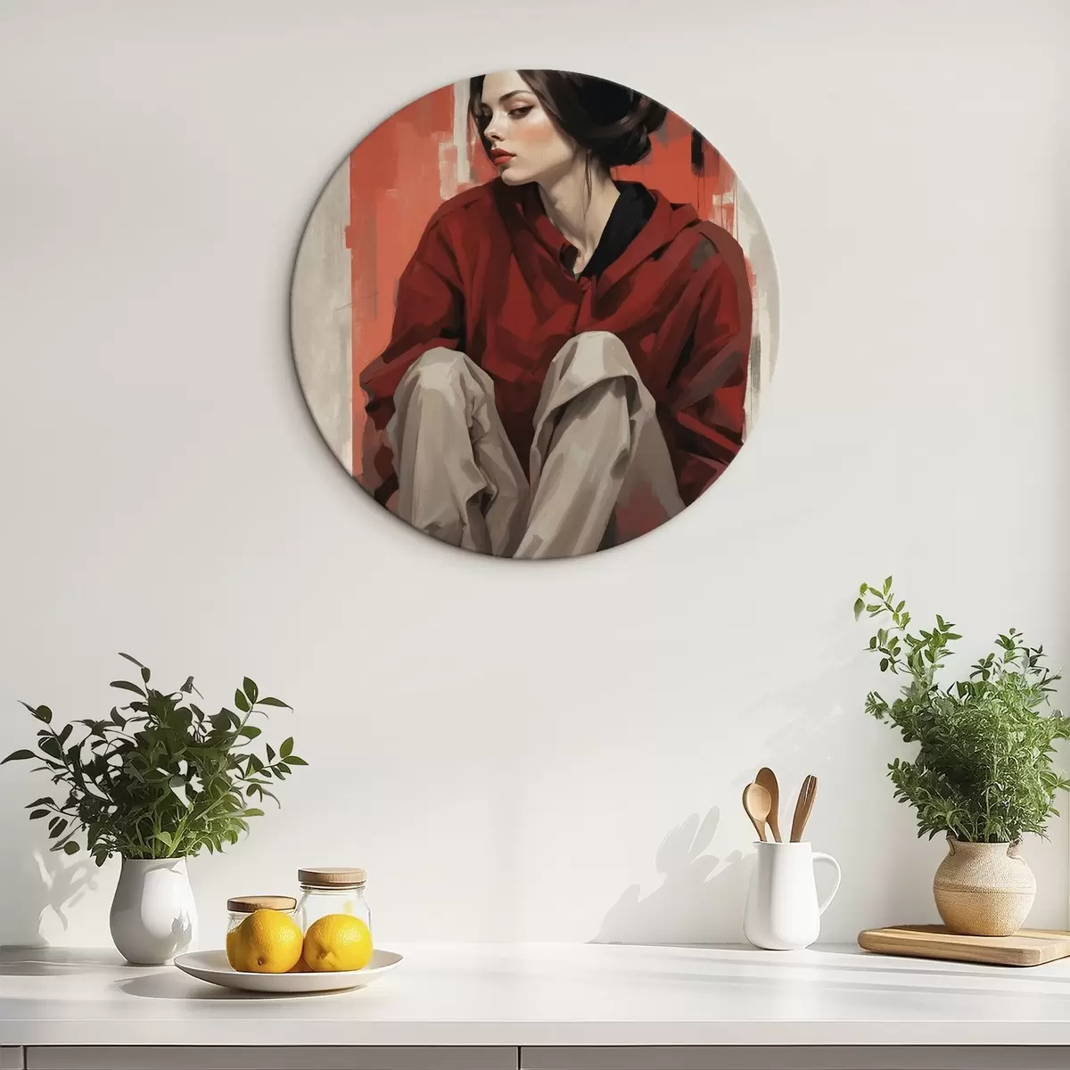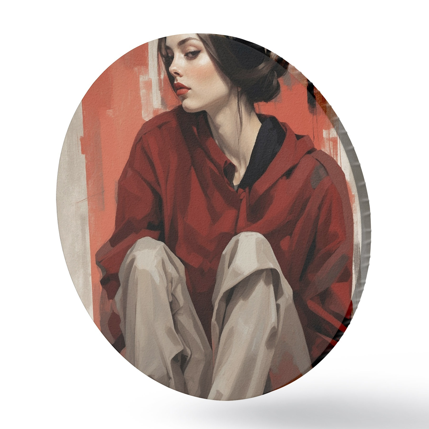 Apaļas gleznas Meitene sarkanā apmetnī sēž ar salocītām kājām r45624