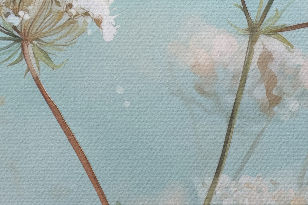 Attēls Karalienes Annes mežģīnes ziedi akvareļa stilā uz zila fona Nr r45722
