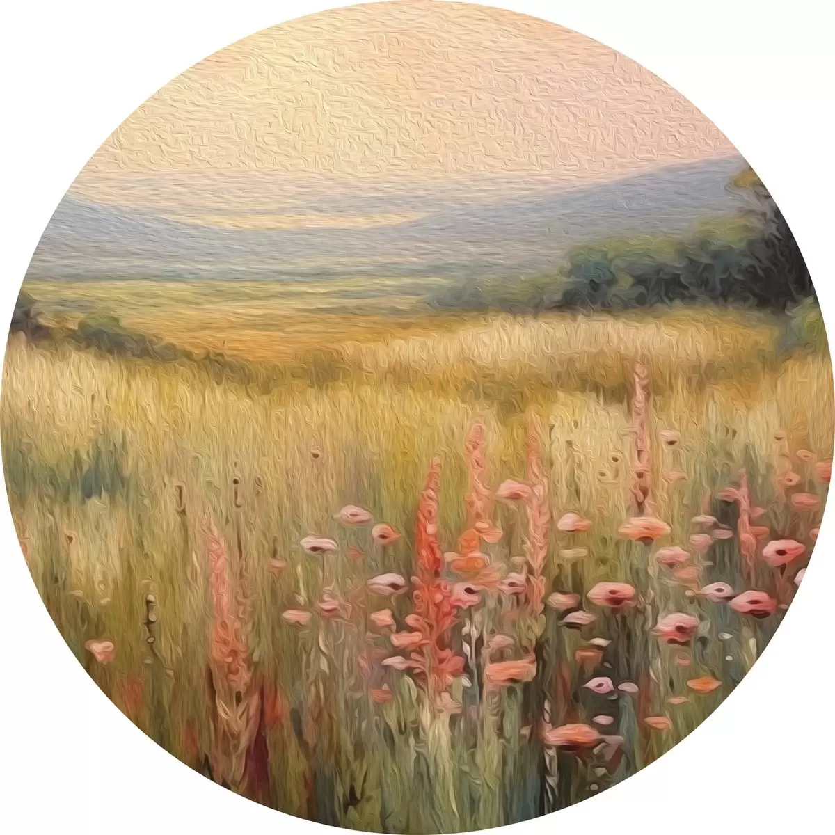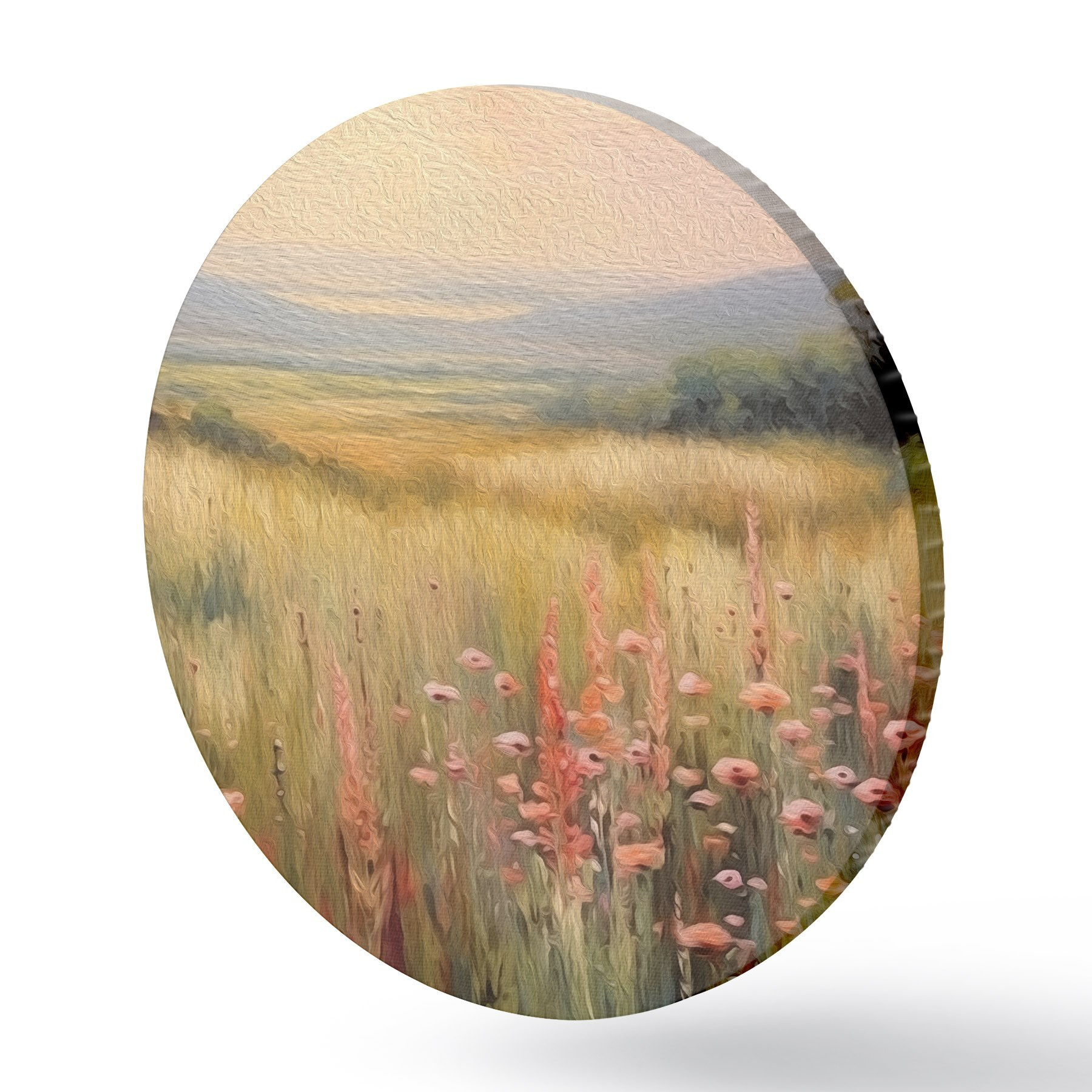 Apaļas gleznas Lauku ainava ar ziediem saulrietā r45818
