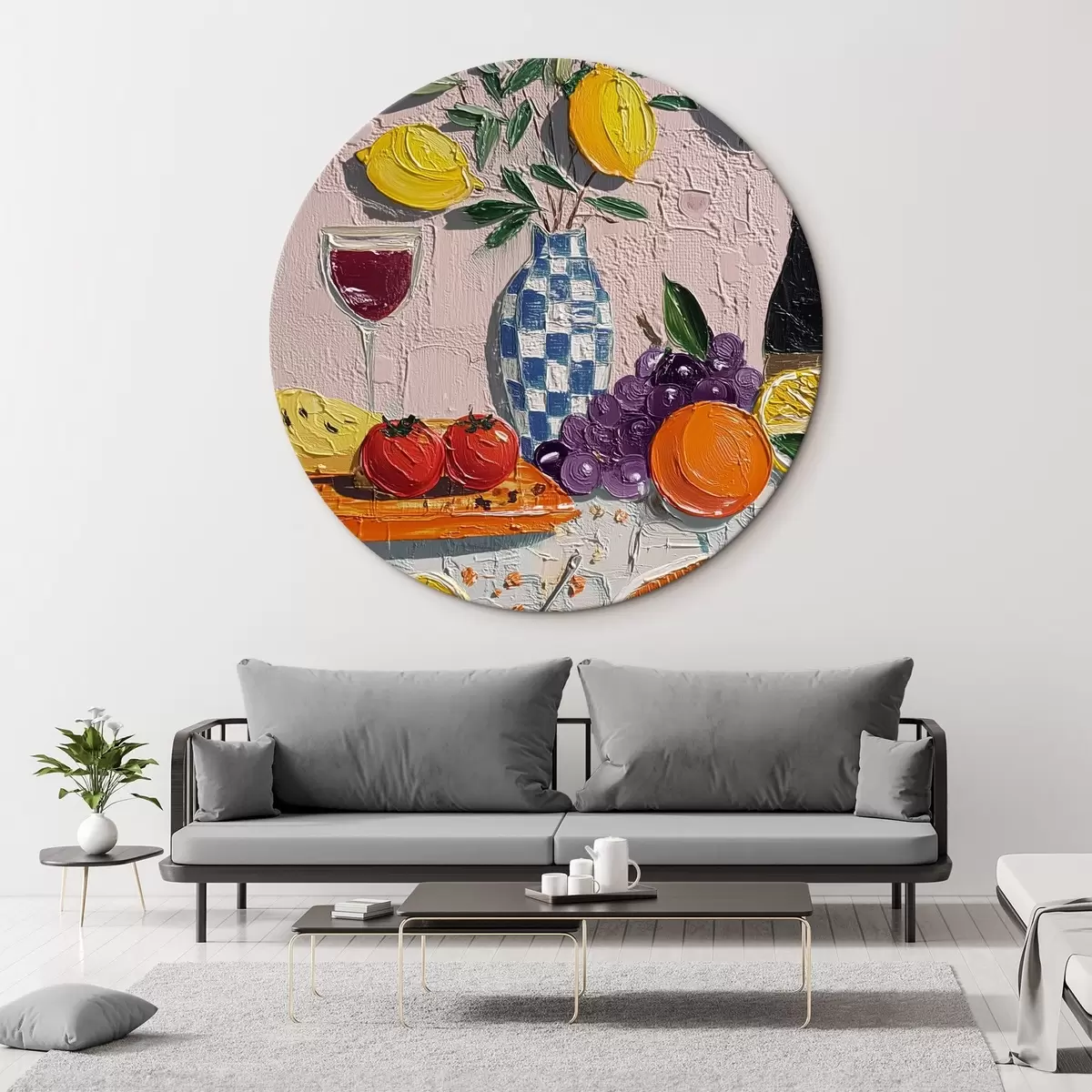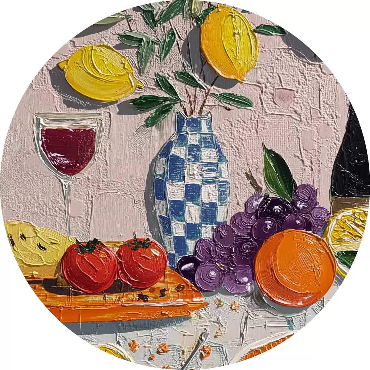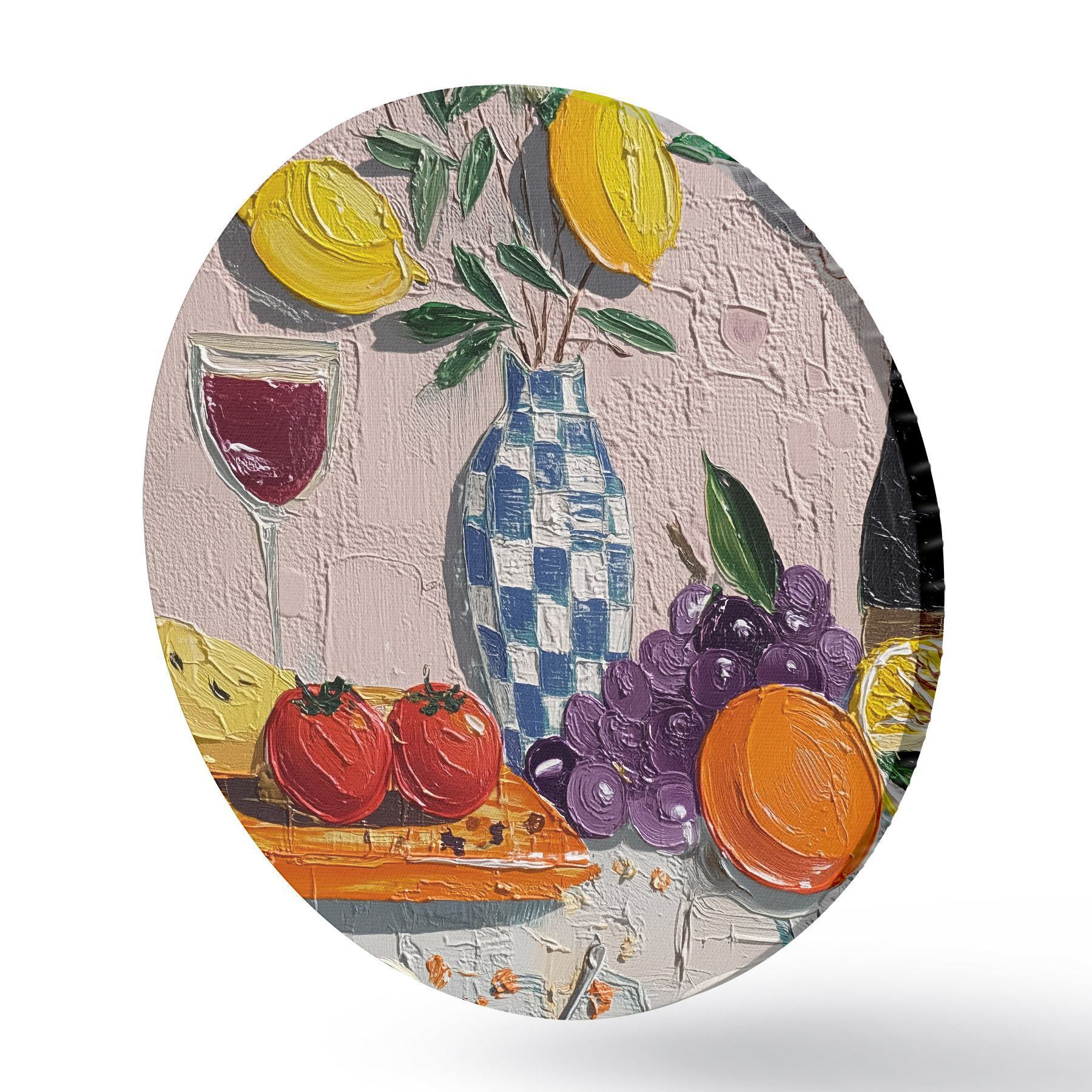 Apaļas gleznas Pastelis klusā daba: citroni, vīnogas un tomāti, impasto r45876