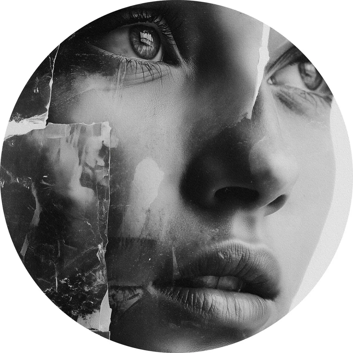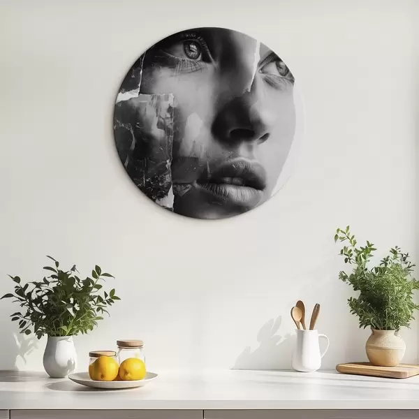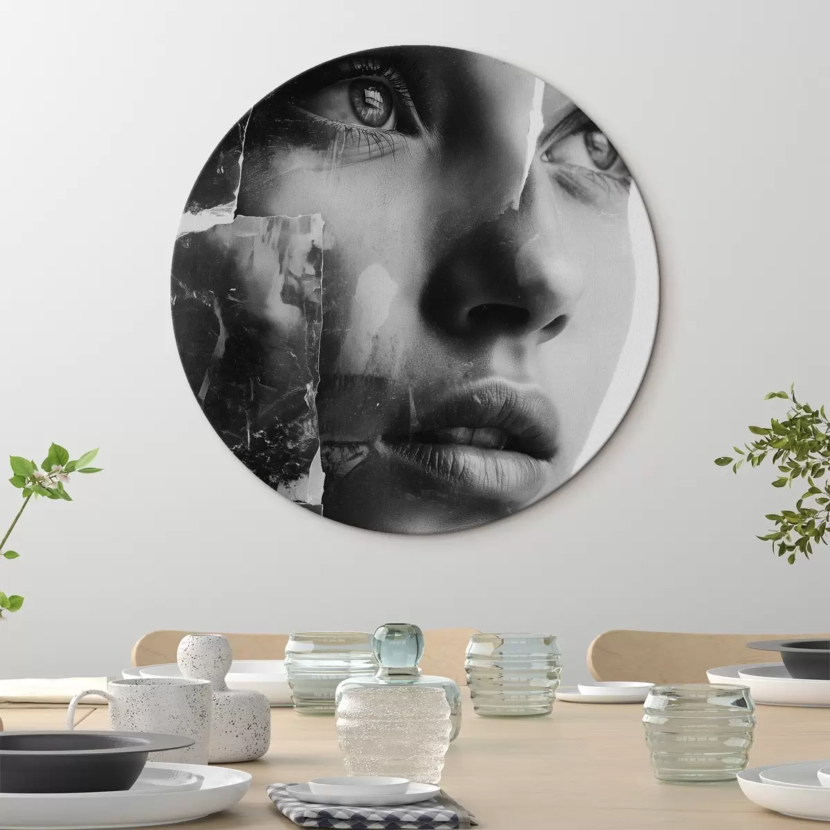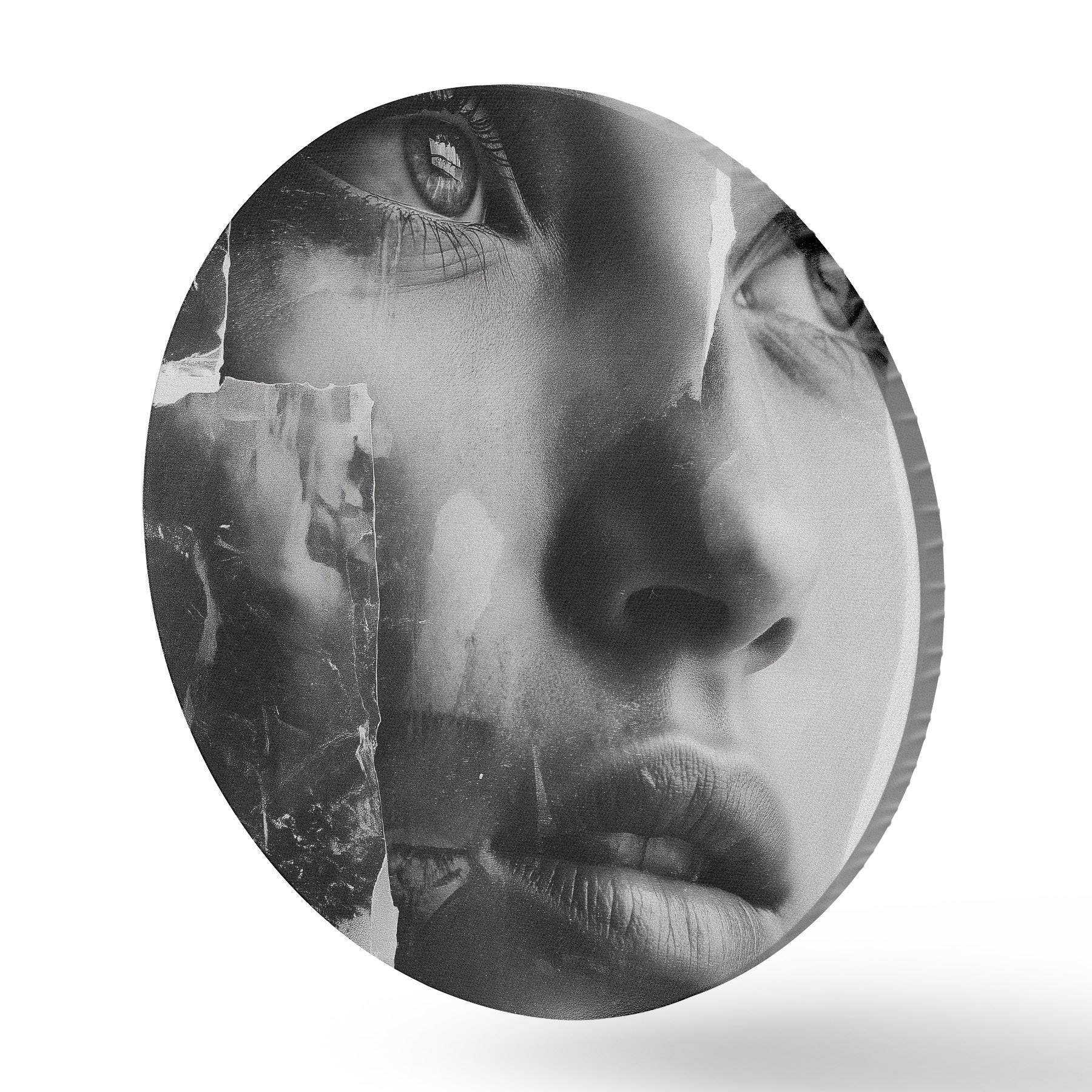 Apaļas gleznas Melnbaltā kolāža portrets ar plīsušiem teksturētiem slāņiem r45898