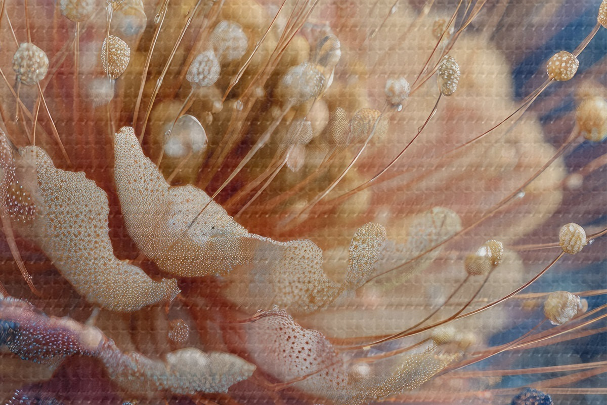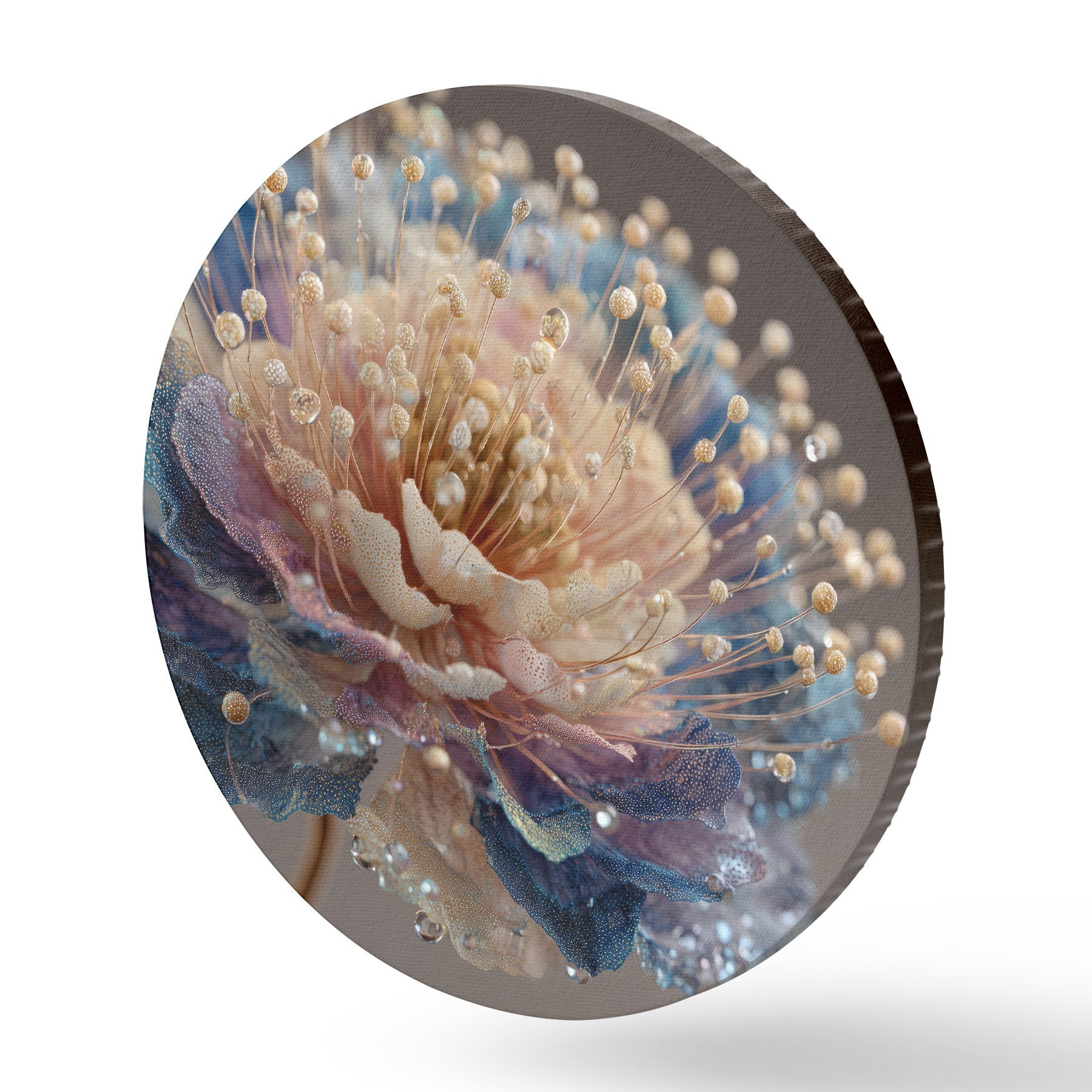 Apaļas gleznas Perlamutra zieds ar rasas pilieniem, persiku un zilu ziedlapiņu r45911