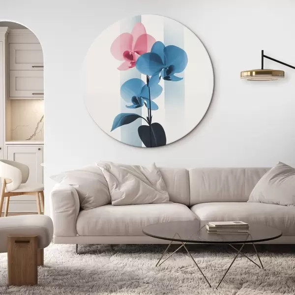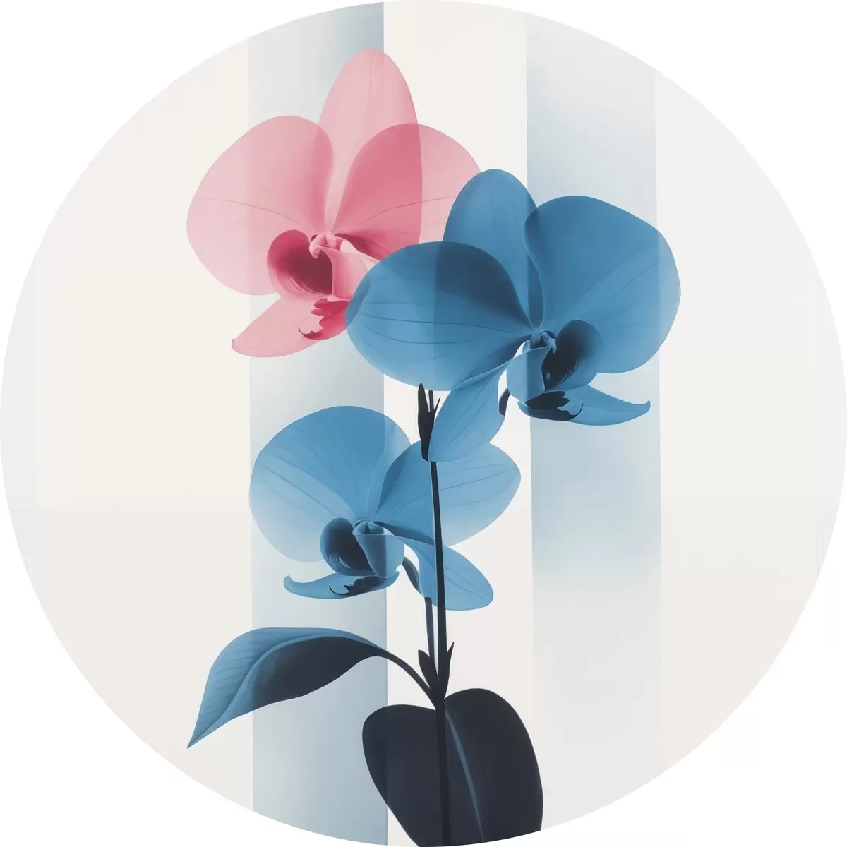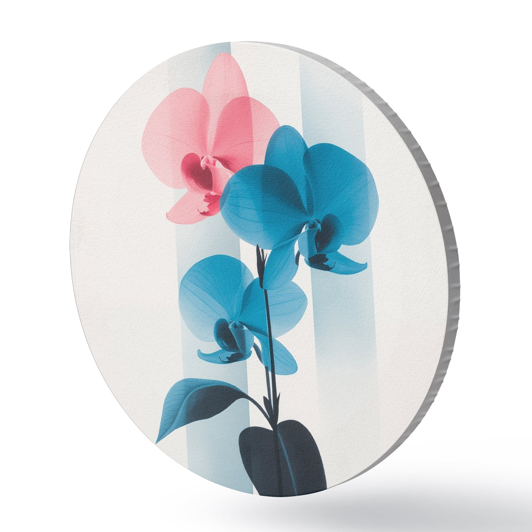 Apaļas gleznas Orhidejas ar lapām uz balta fona ar vertikālām svītrām r45925
