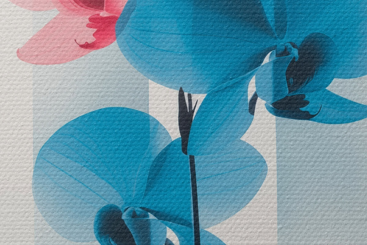 Attēls Orhidejas ar lapām uz balta fona ar vertikālām svītrām Nr r45925