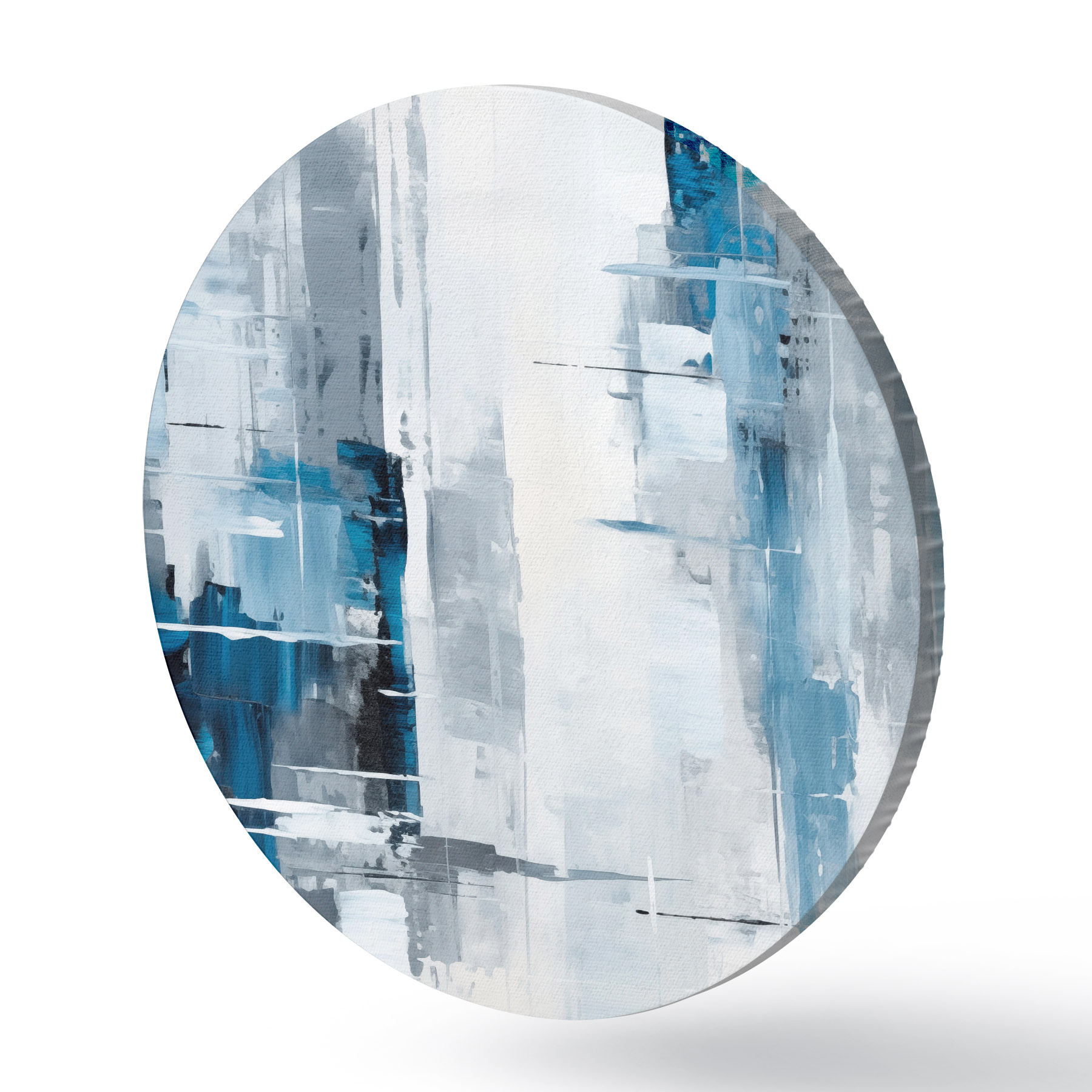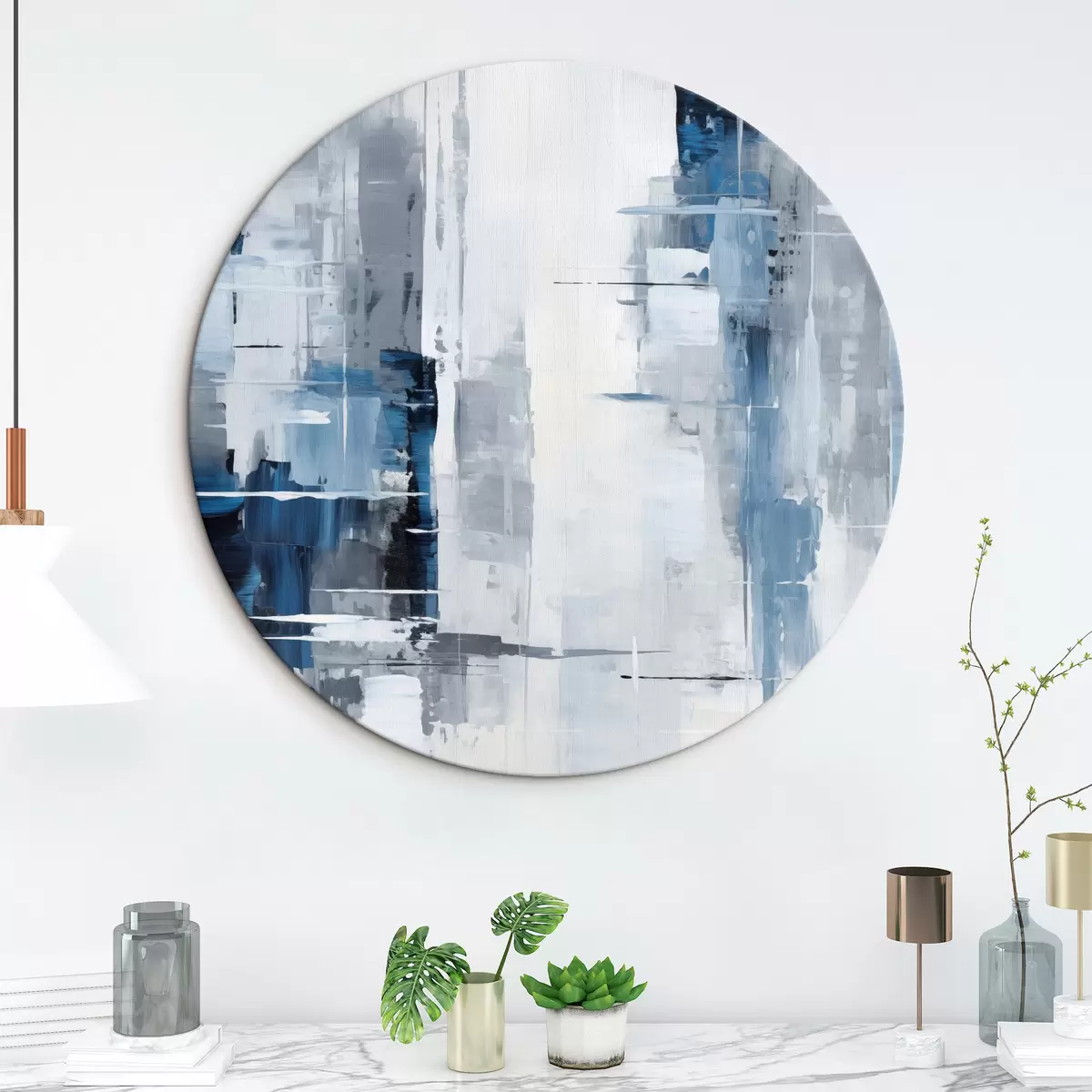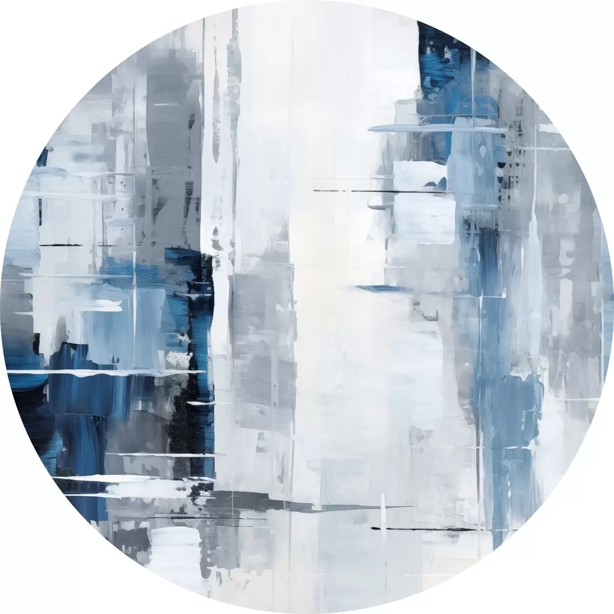 Apaļas gleznas Abstrakta glezna, kurā izmantotas zilas, pelēkas un baltas krāsas, vertikālas līnijas un ģeometriskas formas r45926
