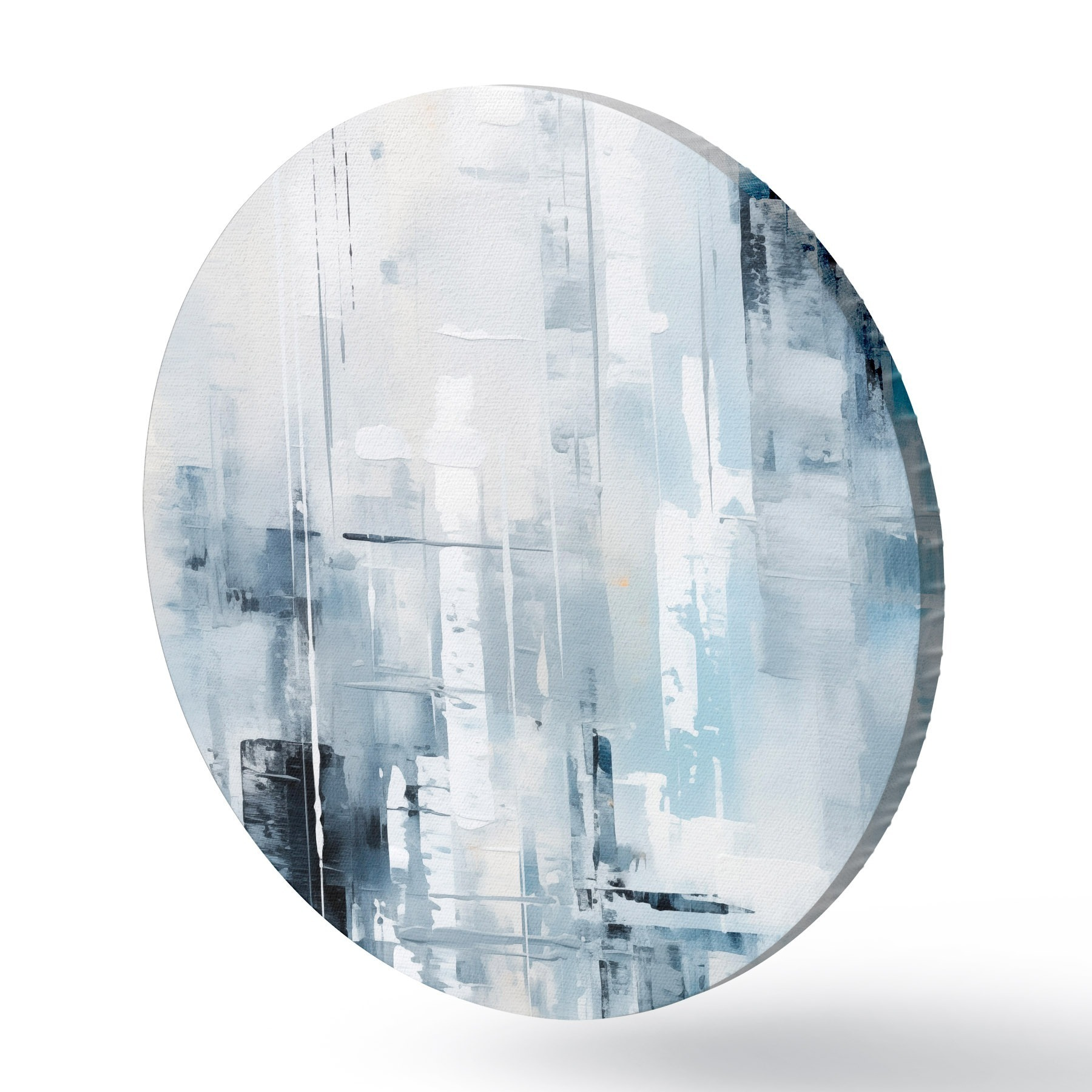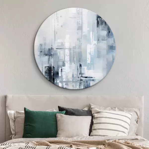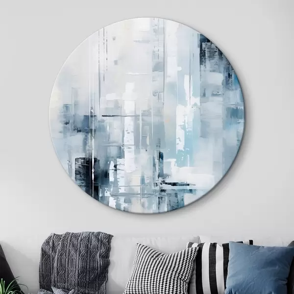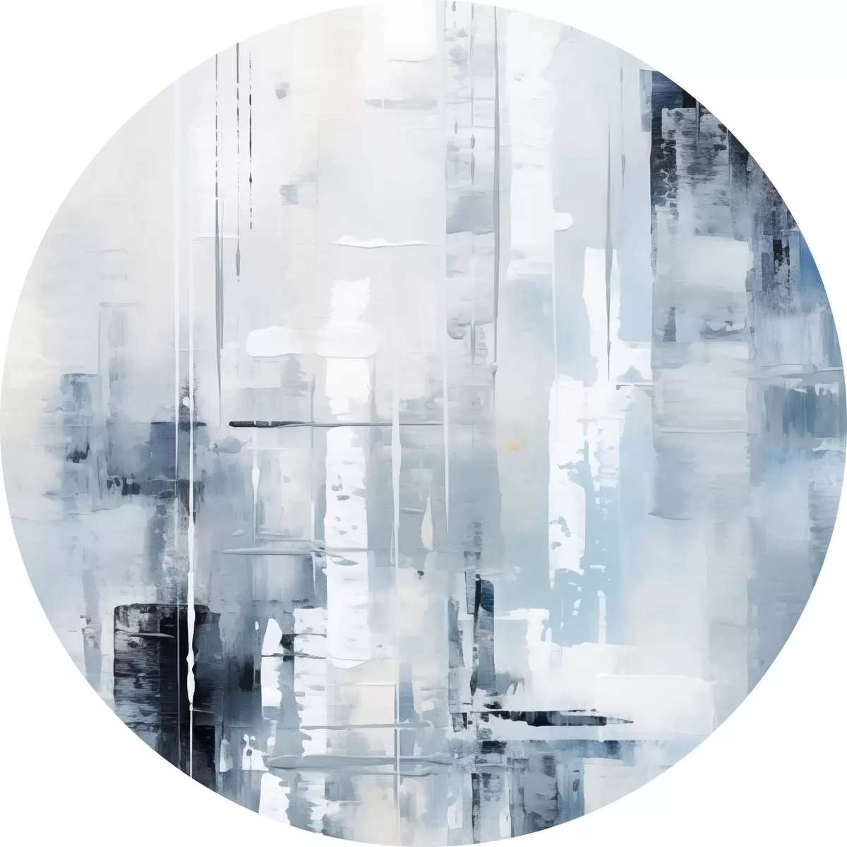 Apaļas gleznas Abstrakta glezna, kurā izmantotas zilas, pelēkas un baltas krāsas, vertikālas līnijas un ģeometriskas formas r45927