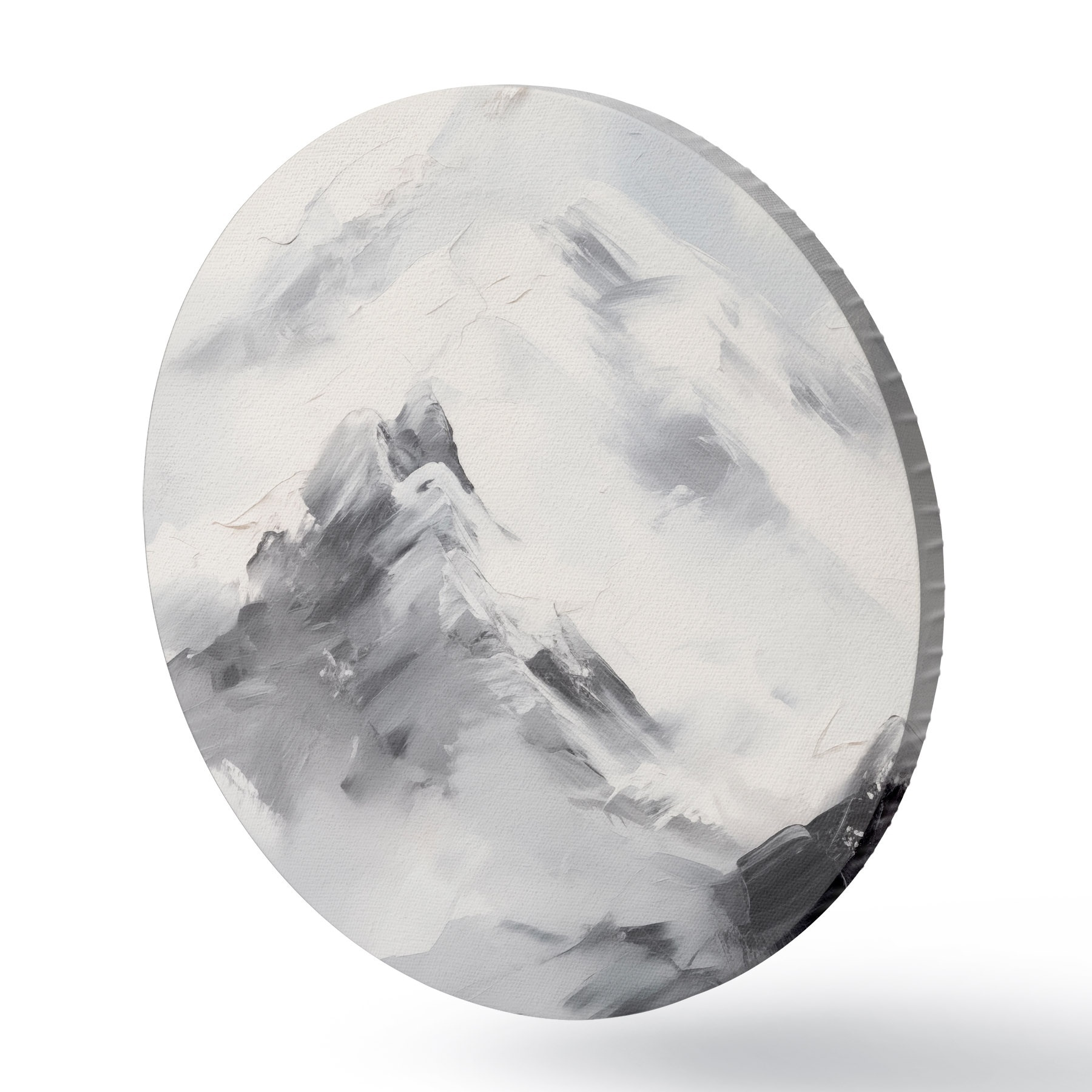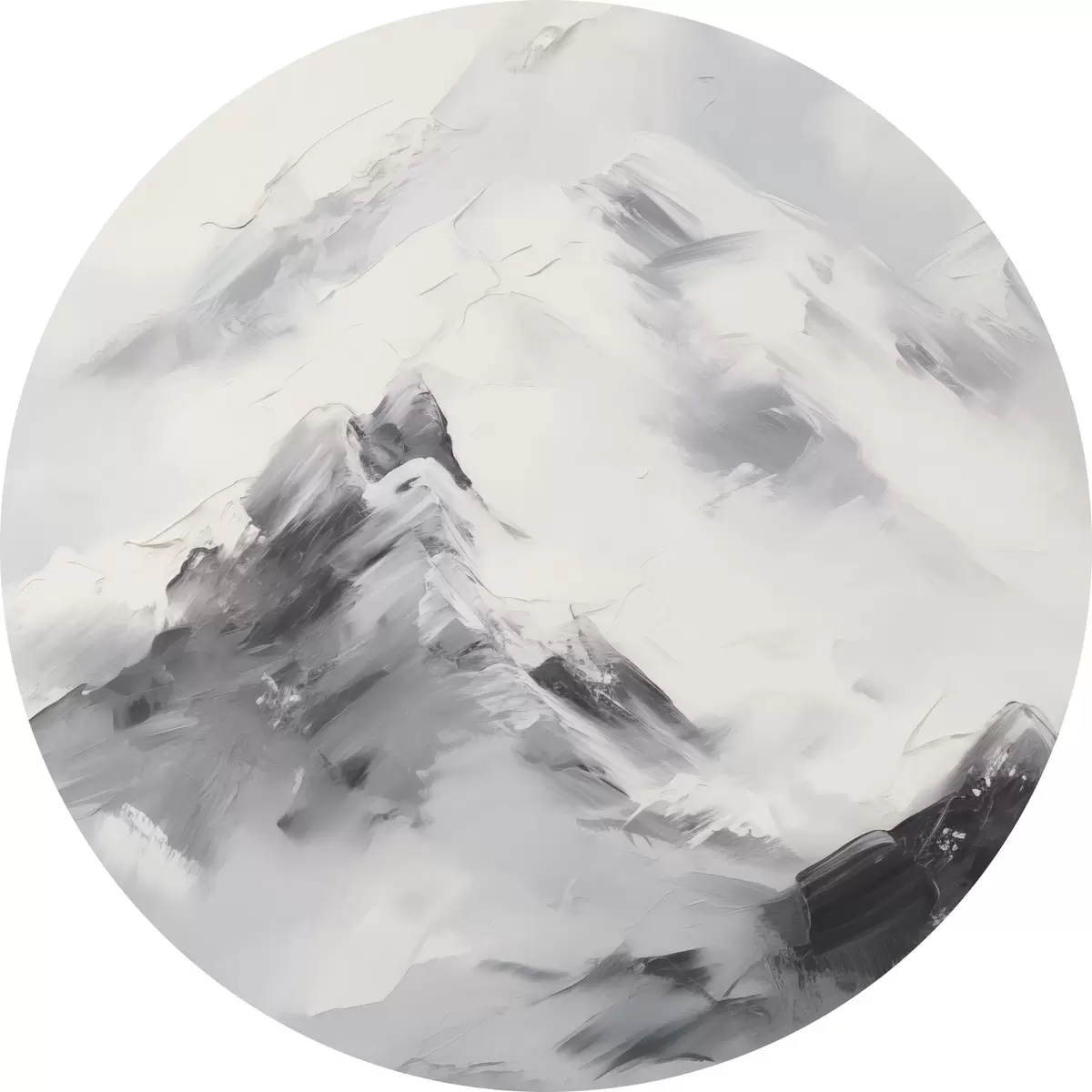 Apaļas gleznas Sniegotas kalnu virsotnes ar pelēkiem ēnām, pelēks debesis, otas triepieni, teksturēts, minimālisma stils r45933