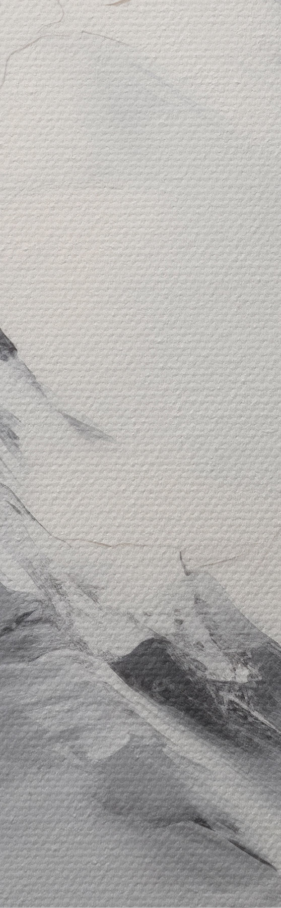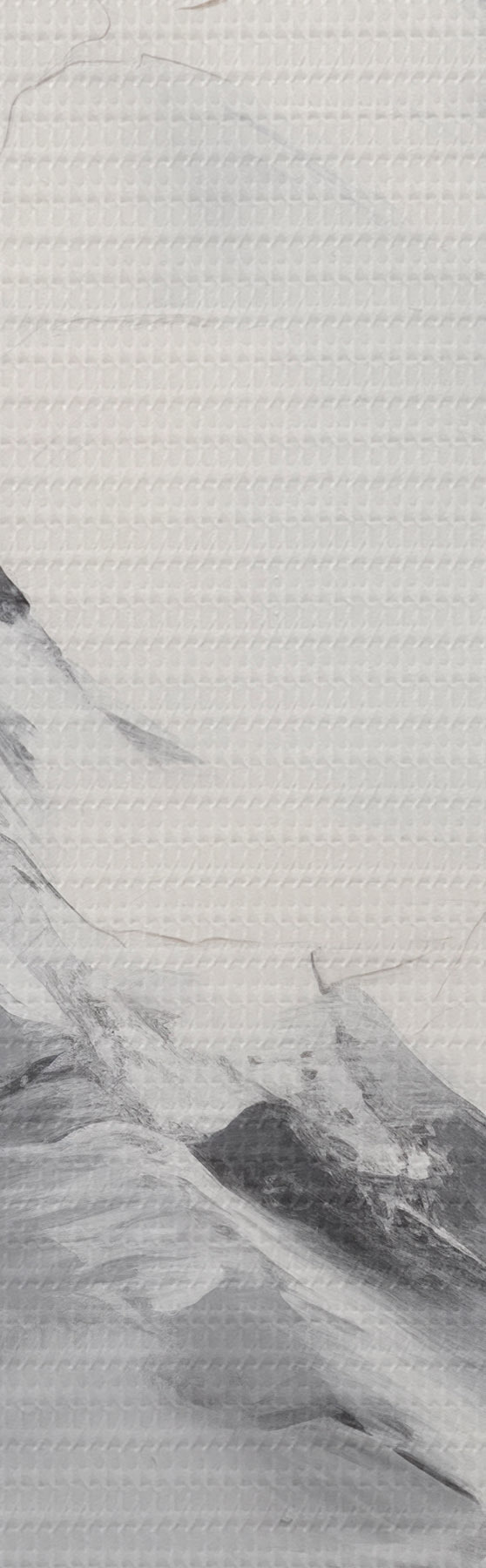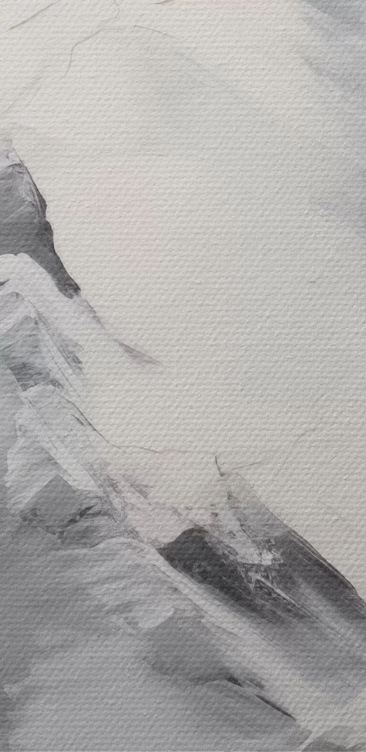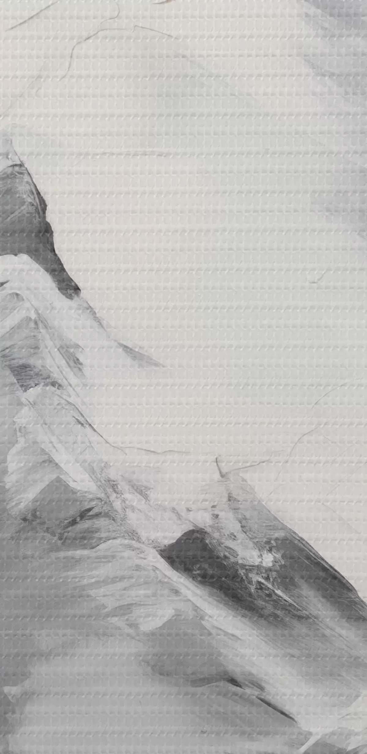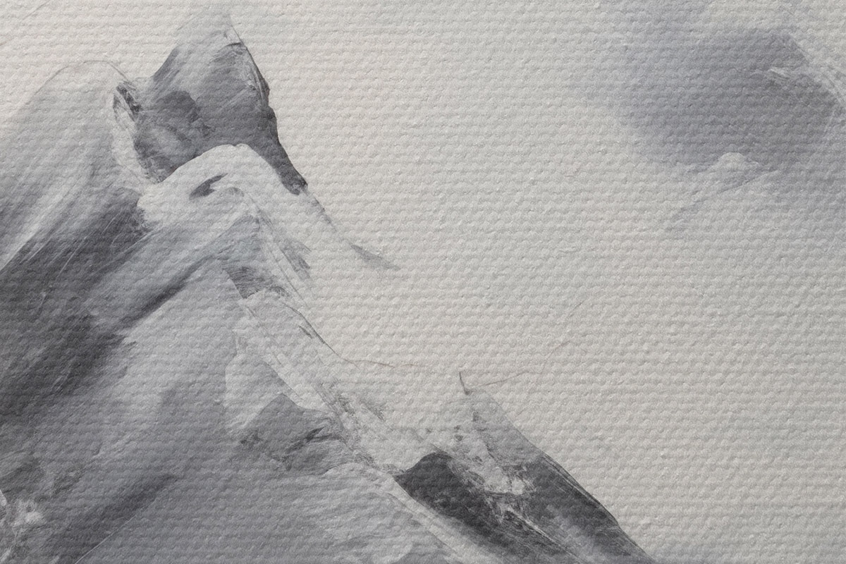 Attēls Sniegotas kalnu virsotnes ar pelēkiem ēnām, pelēks debesis, otas triepieni, teksturēts, minimālisma stils Nr r45933