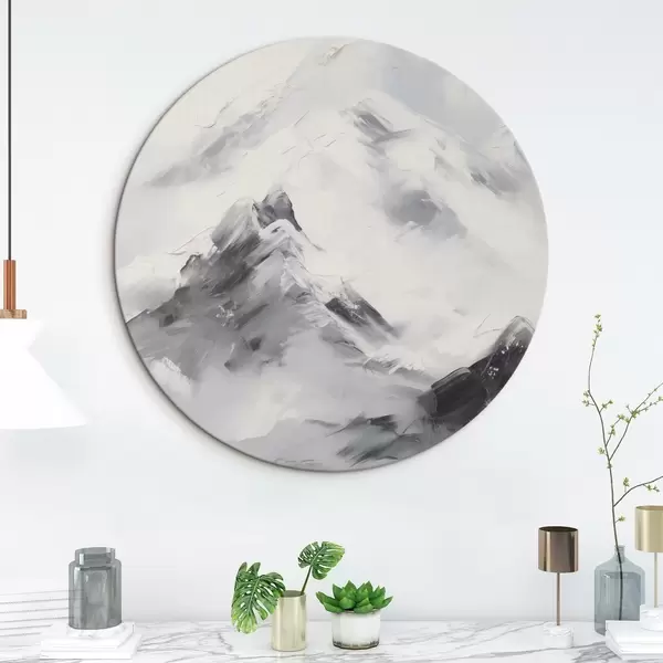 Apaļas gleznas Sniegotas kalnu virsotnes ar pelēkiem ēnām, pelēks debesis, otas triepieni, teksturēts, minimālisma stils r45933