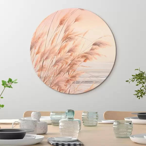 Apaļas gleznas Pampas zāle ar pasteļoranžu krāsu paleti, gaiši rozā debesis, mierīgs ainava r45934