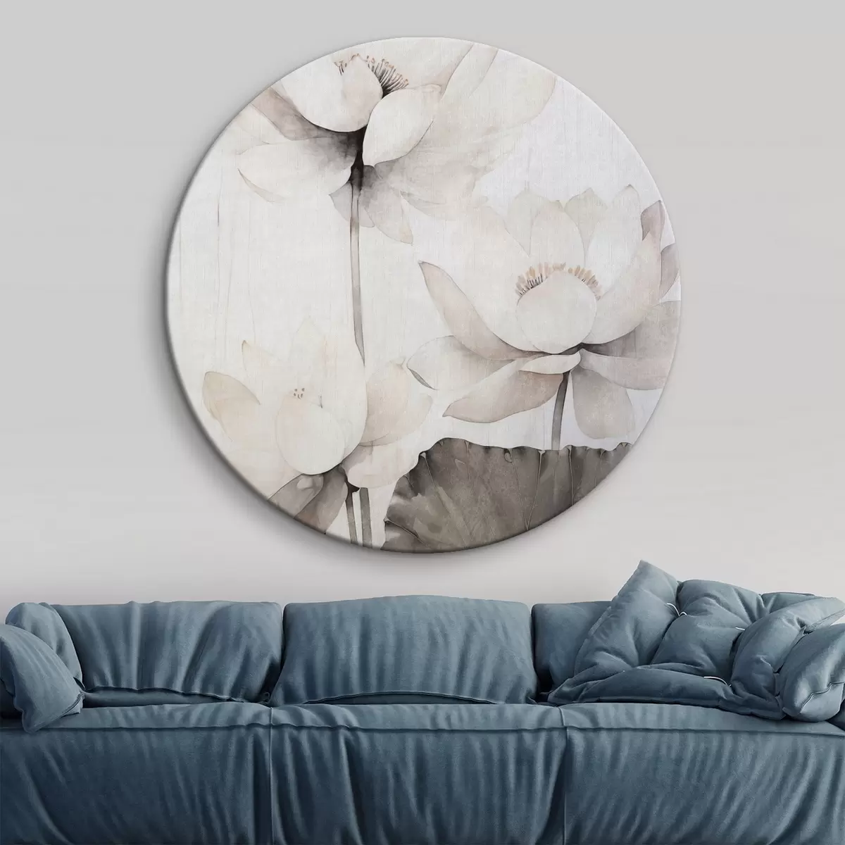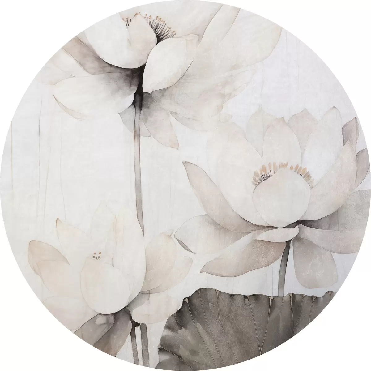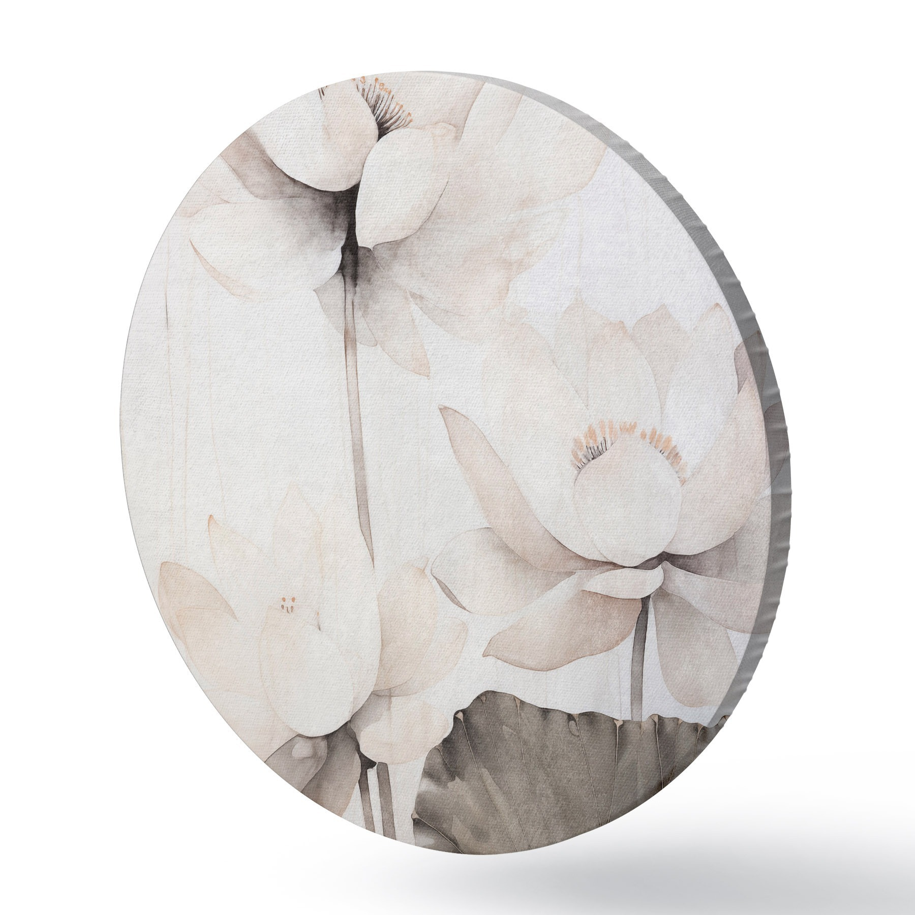 Apaļas gleznas Baltas teksturētas lotosa ziedi ar tumšām lapām, gaišs fons, minimālistisks dizains r45936