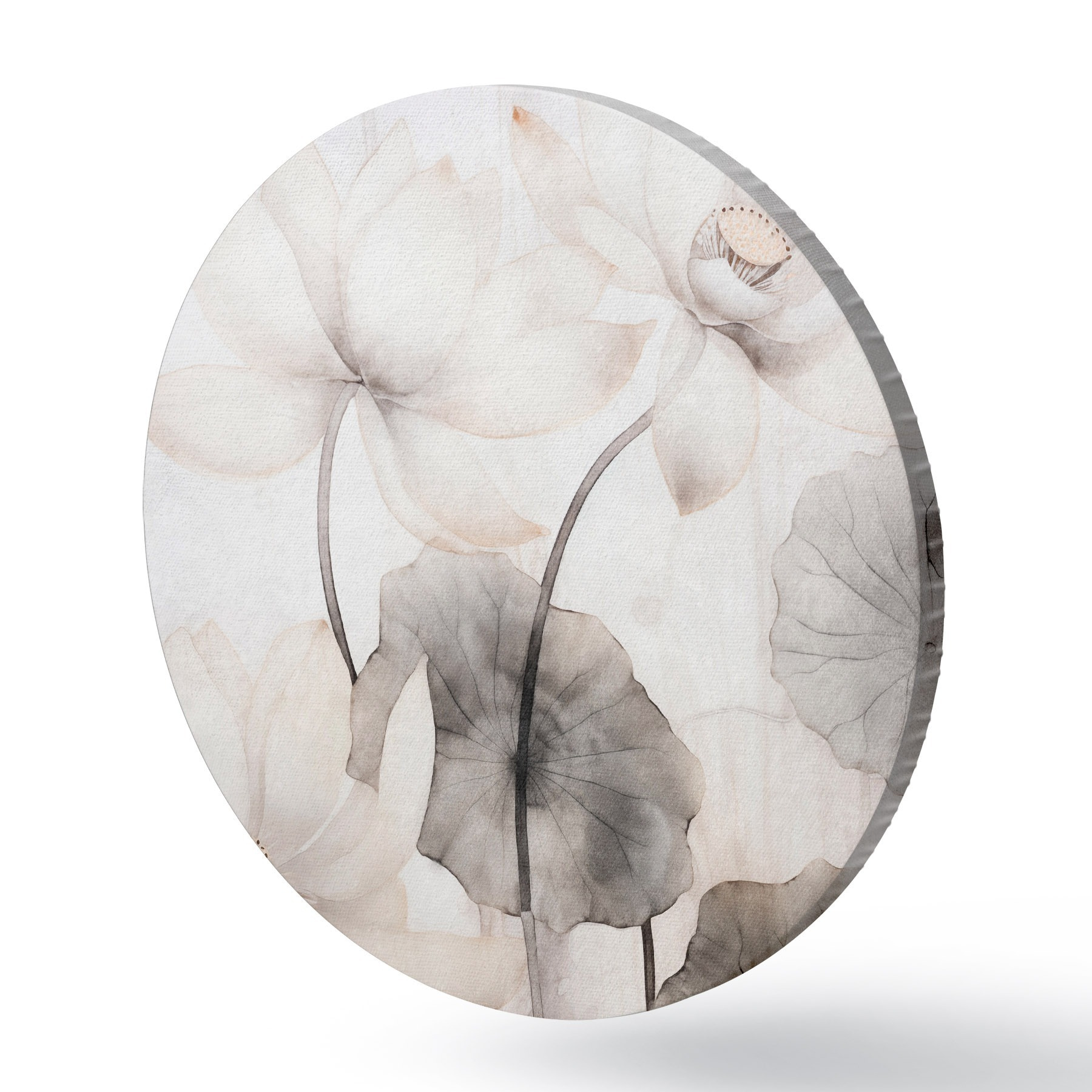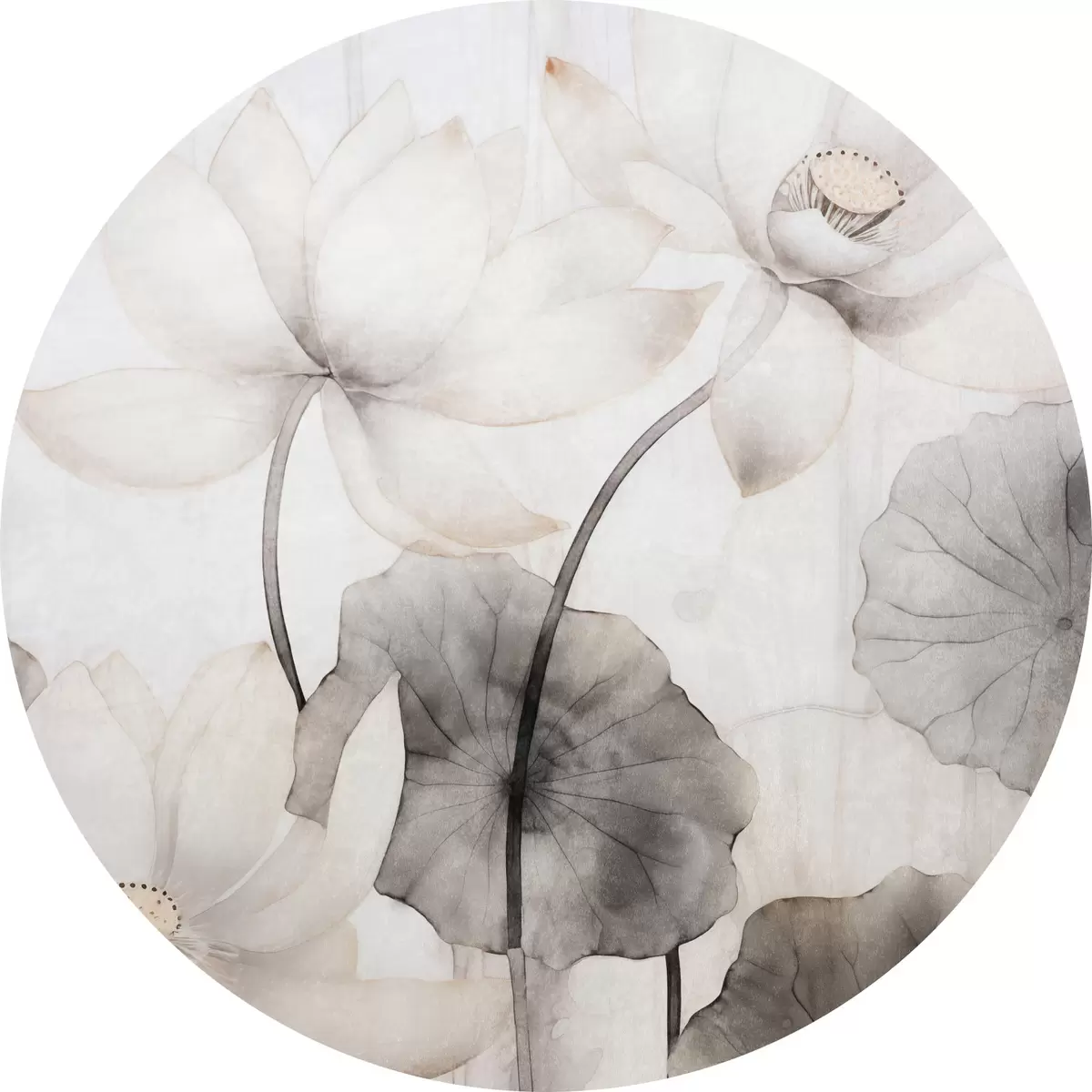 Apaļas gleznas Baltas teksturētas lotosa ziedi ar tumšām lapām, gaišs fons, minimālistisks dizains r45937
