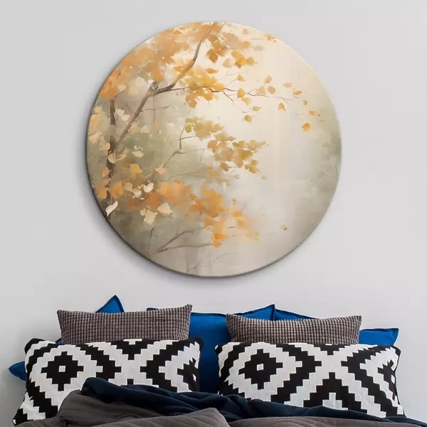 Apaļas gleznas Rudens koku zari ar oranžām lapām mežā ar maigu gaismu r45940