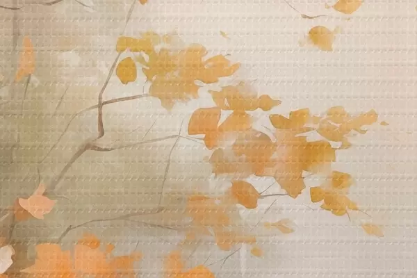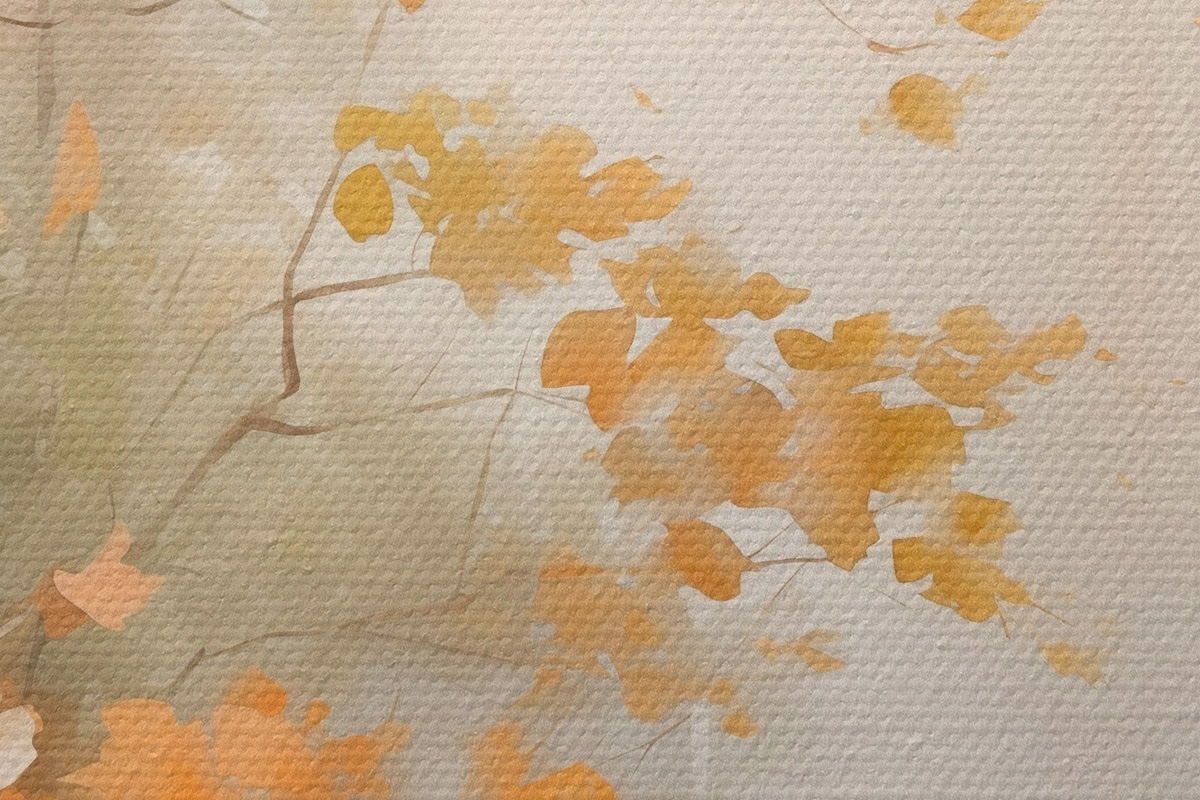 Attēls Rudens koku zari ar oranžām lapām mežā ar maigu gaismu Nr r45940
