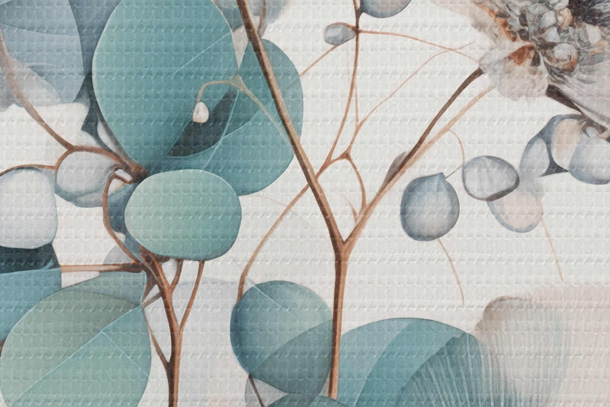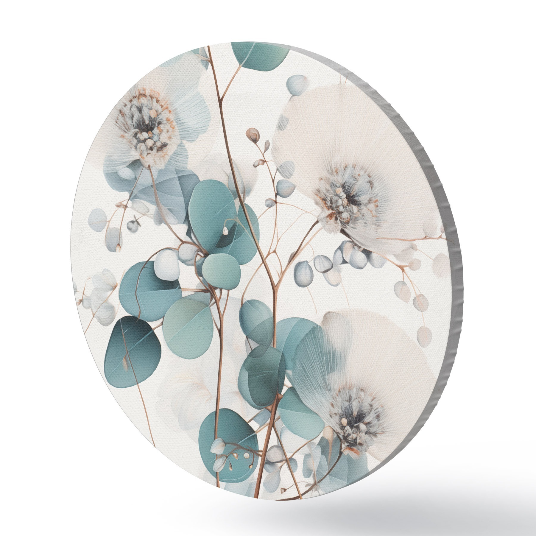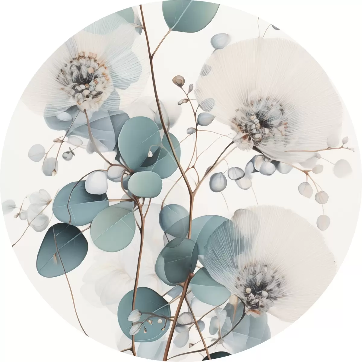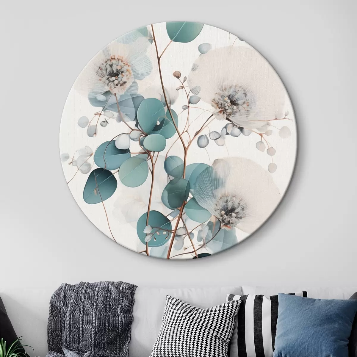 Apaļas gleznas Eikalipta abstraktas ziedi ar baltiem ziedlapiem, klusināti zaļas lapas uz zariem r45946