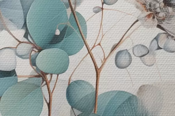 Attēls Eikalipta abstraktas ziedi ar baltiem ziedlapiem, klusināti zaļas lapas uz zariem Nr r45946