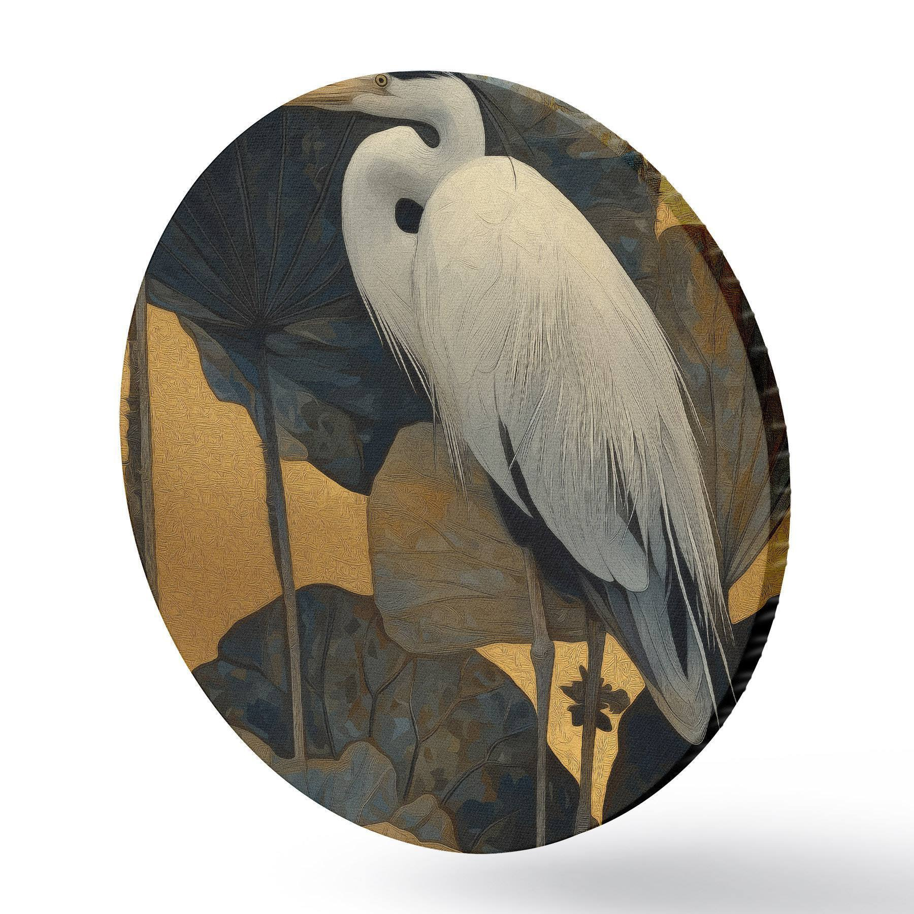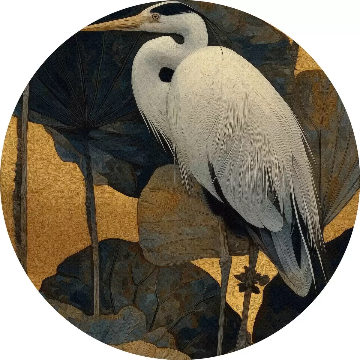 Apaļas gleznas Baltā gārgale starp lielām lapām uz siltā fona r46147