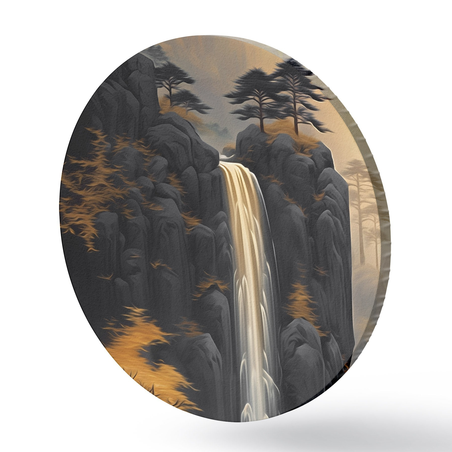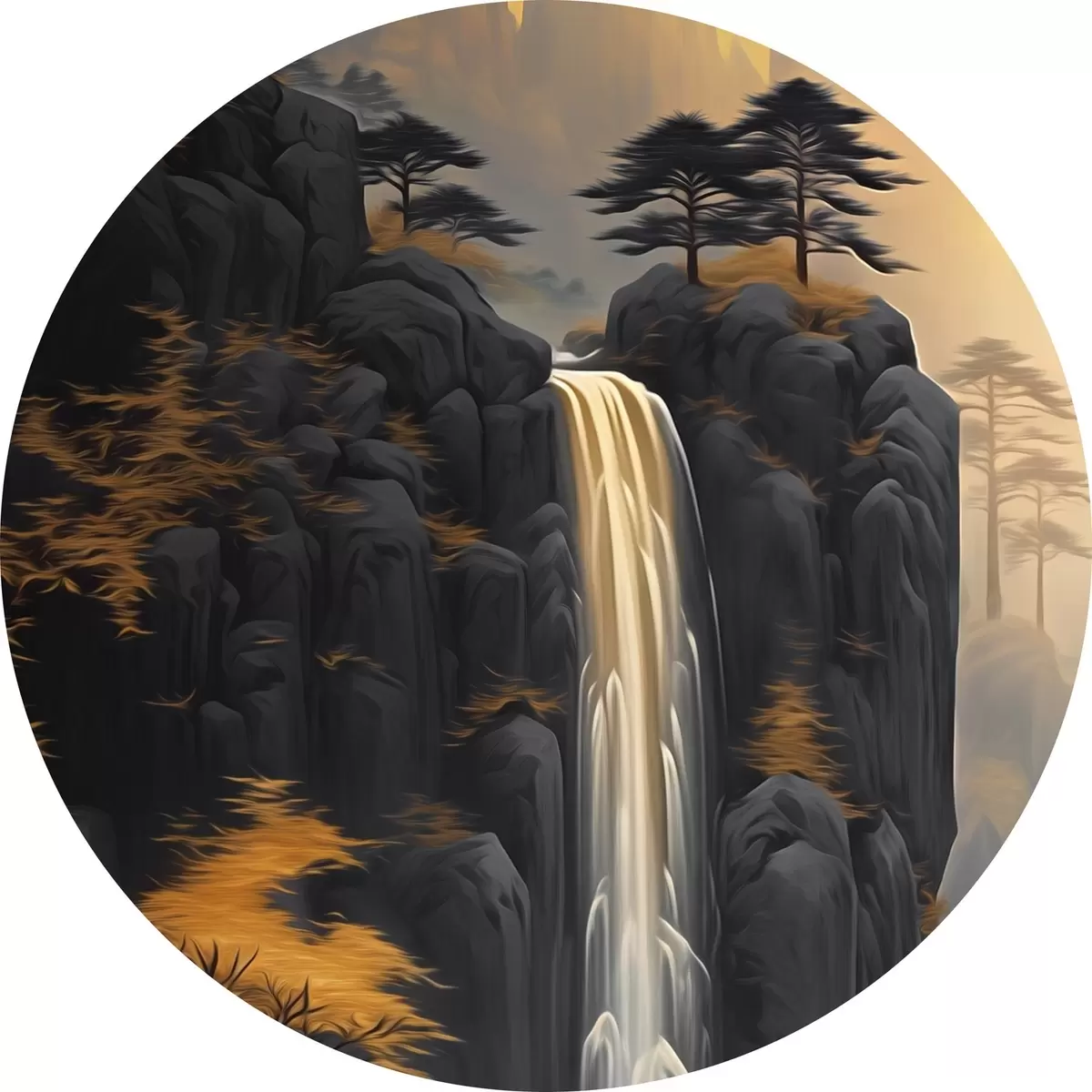 Apaļas gleznas Akmeņains reljefs ar ūdenskritumu siltos saulrieta toņos r46177