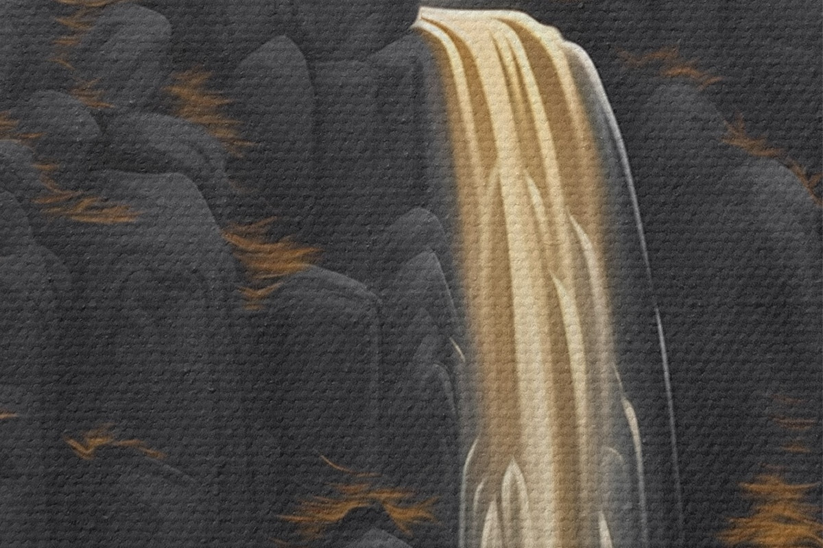 Attēls Akmeņains reljefs ar ūdenskritumu siltos saulrieta toņos Nr r46177