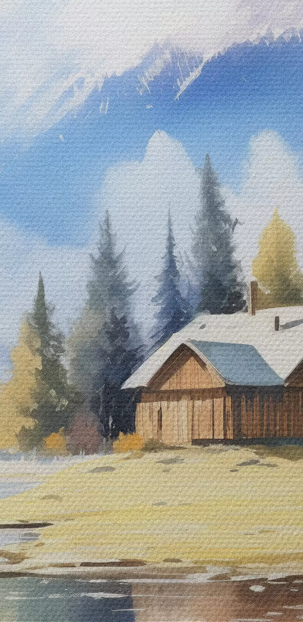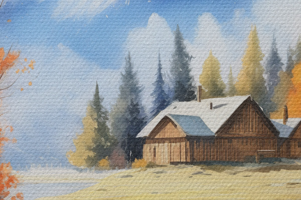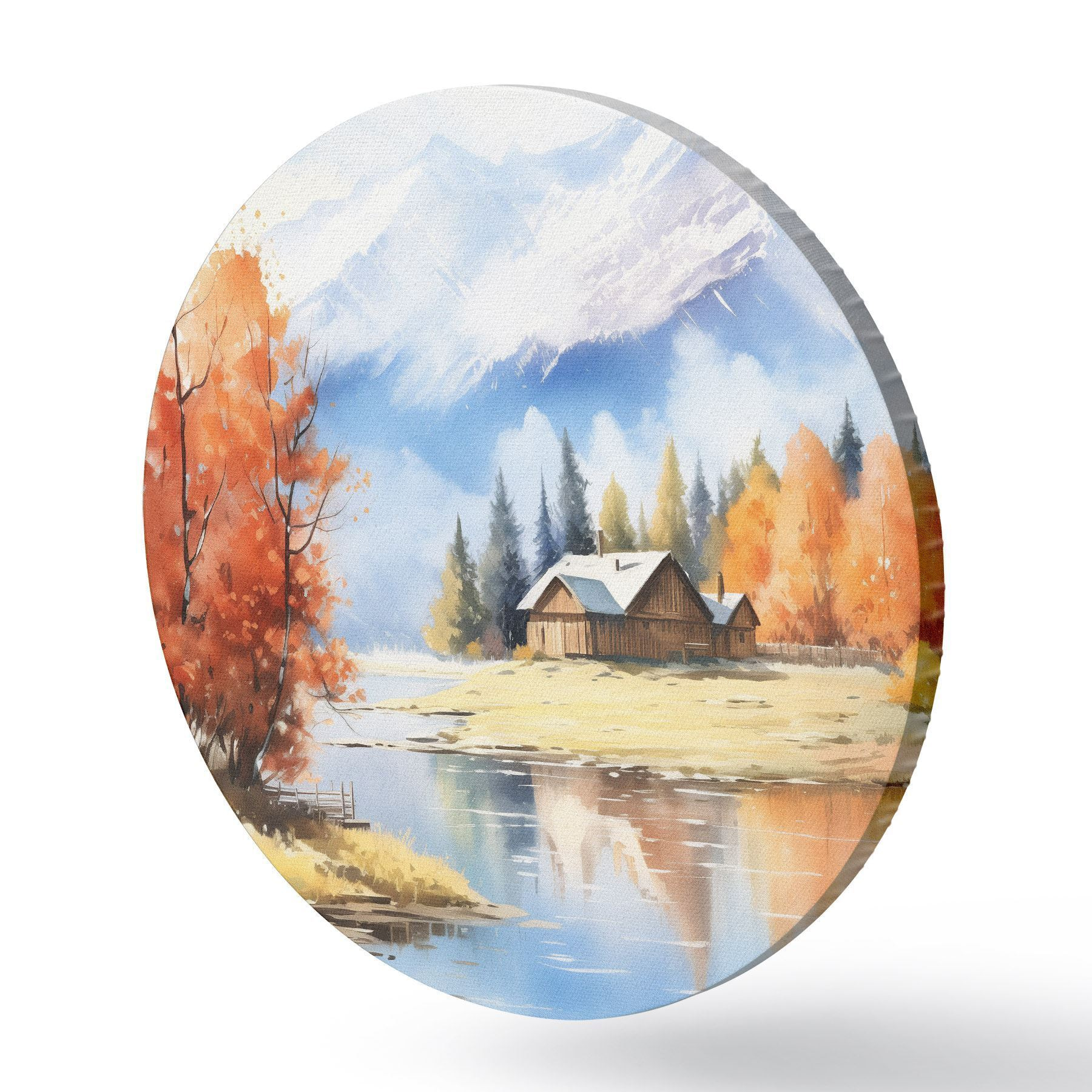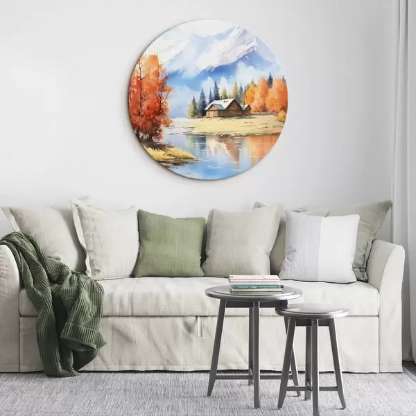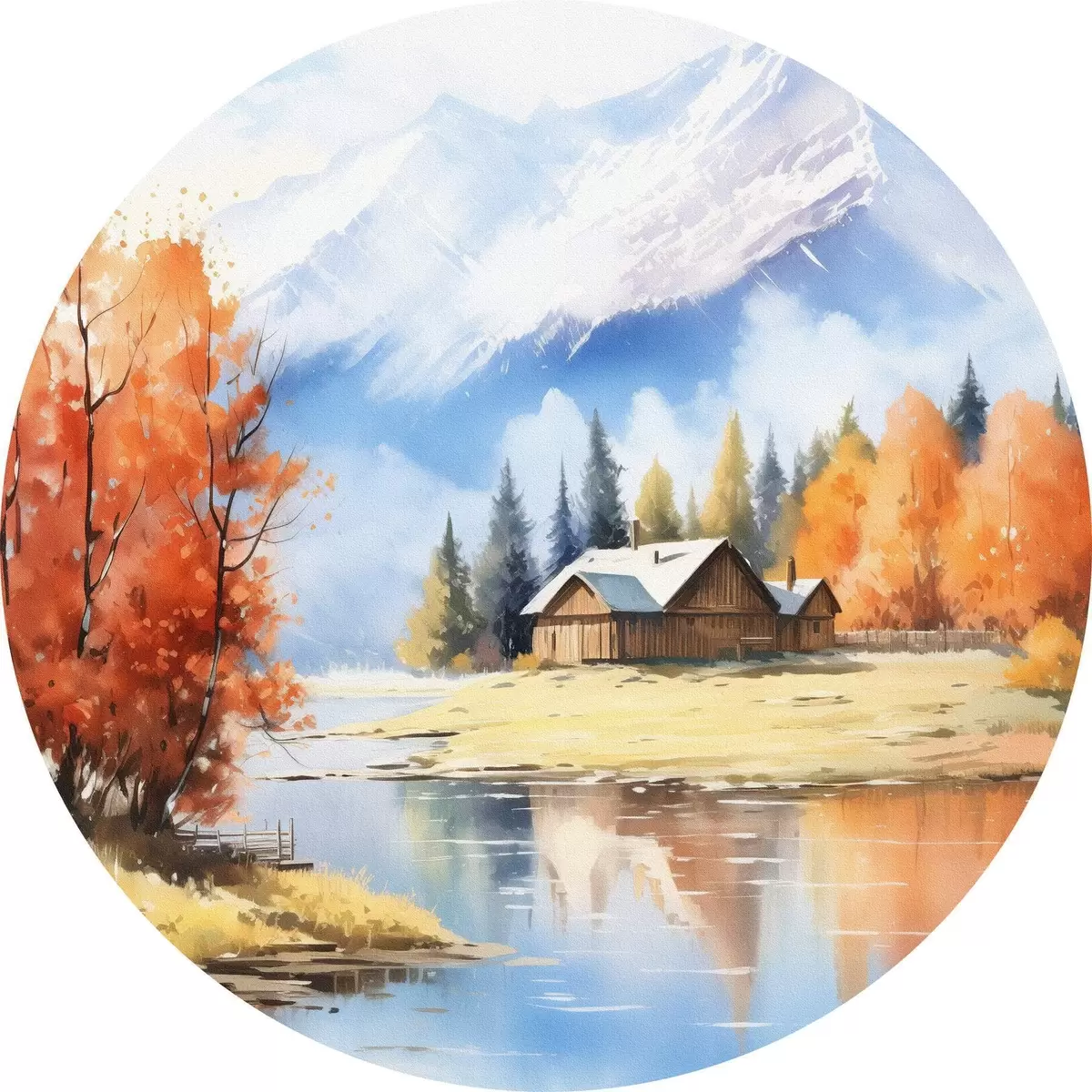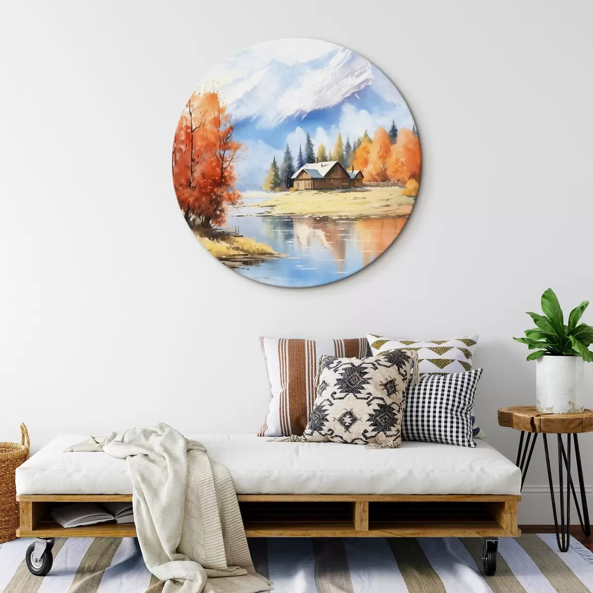 Apaļas gleznas Rudens ainava pie ezera ar māju un kalniem r46184