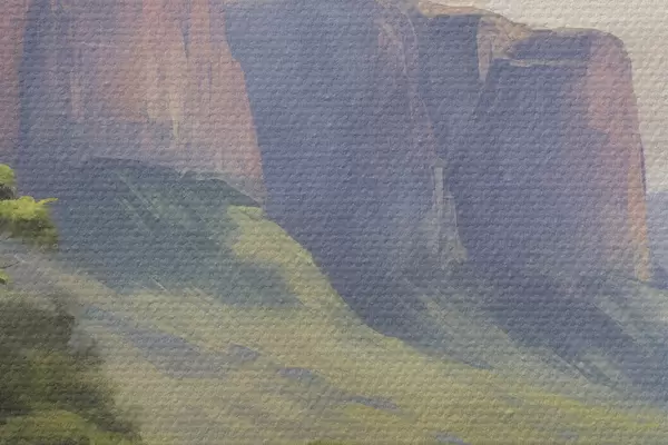 Smalkais diegu pinums uz šī audekla atgādina profesionālu mākslinieku audeklu virsmu.